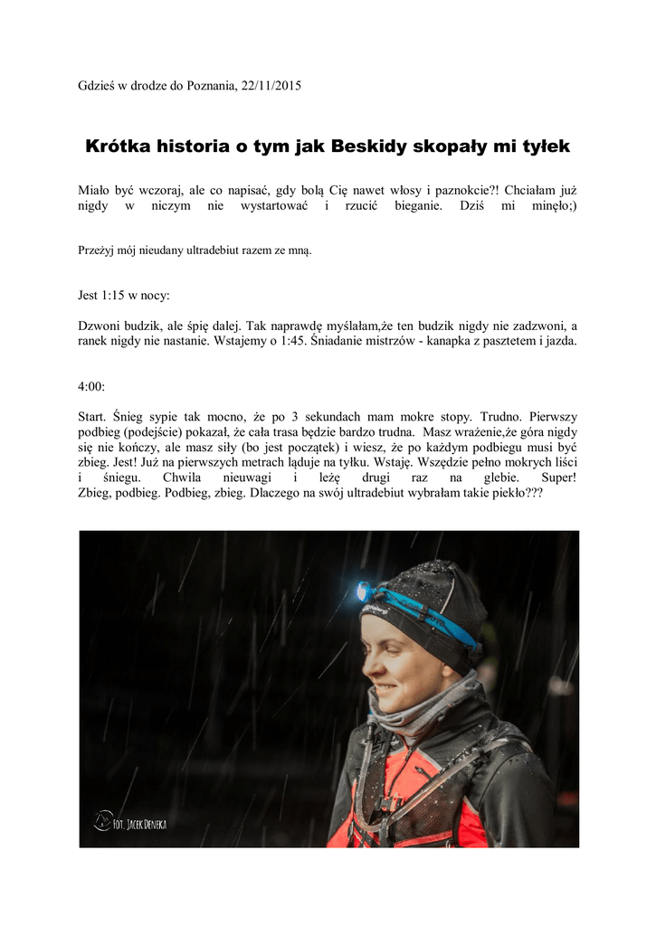 Gdzieś w drodze do Poznania, 22/11/2015 Krótka historia o tym jak Beskidy skopały mi tyłek Miało być wczoraj, ale co napisać, gdy bolą Cię nawet włosy i paznokcie?! Chciałam już nigdy w niczym nie wystartować i rzucić bieganie. Dziś mi minęło;) Przeżyj mój nieudany ultradebiut razem ze mną. Jest 1:15 w nocy: Dzwoni budzik, ale śpię dalej. Tak naprawdę myślałam,że ten budzik nigdy nie zadzwoni, a ranek nigdy nie nastanie. Wstajemy o 1:45. Śniadanie mistrzów - kanapka z pasztetem i jazda. 4:00: Start. Śnieg sypie tak mocno, że po 3 sekundach mam mokre stopy. Trudno. Pierwszy podbieg (podejście) pokazał, że cała trasa będzie bardzo trudna. Masz wrażenie,że góra nigdy się nie kończy, ale masz siły (bo jest początek) i wiesz, że po każdym podbiegu musi być zbieg. Jest! Już na pierwszych metrach ląduje na tyłku. Wstaję. Wszędzie pełno mokrych liści i śniegu. Chwila nieuwagi i leżę drugi raz na glebie. Super! Zbieg, podbieg. Podbieg, zbieg. Dlaczego na swój ultradebiut wybrałam takie piekło??? Na 8 kilometrze mój biegowy towarzysz Marek poinformował mnie, że to dopiero 8 kilometr. "Kur*a, dopiero?". Biegniemy dalej. Na 12 km punkt odżywczy. Ciepła herbata to zbawienie. Wolontariusze proponowali %%% - teraz wiem, że trzeba było strzelić sobie jakiegoś kielicha na rozgrzanie. Mniej bym cierpiała – psychicznie Zadowolona ruszyłam z punktu. Nagle okazuje się, że przede mną podejście pod Małą Czantorię. W tym momencie zrobiło się jasno. Gdy zobaczyłam to, co na mnie czeka pierwszy raz stają mi łzy w oczach i pojawiają się myśli,że tego nie skończę. Ktoś, kto nazwał ten bieg Piekłem Beskidów miał rację. Cały czas sypał śnieg, a przez pierwsze godziny biegło się w zupełnej ciemności. Dziwne, że wywróciłam się tylko dwa razy. Gdy dotarłam na górę okazało się,że straciliśmy bardzo dużo czasu, a czas to pieniądz, bo na pierwszą pętlę mieliśmy tylko 4,5 h. Już wtedy wiedziałam,że nie zrobię tego jeszcze dwa razy. Jeszcze jedna pętla będzie cudem. Chcieliśmy się zmieścić w limicie - trzeba było zacząć nakur...ć. Nie wiedzieliśmy, że przed nami jeszcze prawie pionowy podbieg. Już wtedy bolało mnie kolano. Przestało się prostować. W pewnym momencie minęliśmy z Markiem Krzysia, który skręcił kostkę i człapał do konca pierwszej pętli. Nagle koniec podbiegu. Pani na górze: "Spokojnie, macie dwa kilometry i pół godziny limitu". Daliśmy czadu. Zbiegalismy jak kozice. Na punkcie zameldowalismy się 15 minut przed końcem limitu - z jednej strony super, a z drugiej to wróżyło to początek końca. Bo jak zrobić zrobić kolejną pętlę w takim samym czasie z boląca nogą? Chciałam zejść z trasy, ale 21 km nie był satysfakcjonujący dystans. Wiedziałam też, że to będzie walka. Zabawa już dawno się skończyła. Zjadłam kilka żelkow, wypiłam wodę i jaaaaaaaaaaaaaazda na górę. Pierwsze podejście pokazało,że trzeba było zostać na dole. Skończyły się zawody, zaczęła się walka o każdy krok. Gdyby nie kijki to brodzilabym twarzą po błocie. Wtedy też zaczęłam płakać. Łzy jak grochy towarzyszyły mi z przerwami przez najbliższe 6 godzin. Na ok. 25 km rozstalimy się z Markiem. On miał więcej sił, była nadzieja, że zdąży na trzecie kółko. Zostałam z Dawidem i walczyliśmy. O każdy krok, o każdą górkę. Nie było nadziei na zmieszczenie się w limicie, ale pokonać 42 km w piekle to też było coś. Były momenty, że darłam się i momenty, że nie mogłam powstrzymać płaczu. Kilometry mijamy. Chcąc odciążyć lewą noge opieralam się mocno na kijkach i prawej nodze. Wtedy też prawa zaczęła boleć. No to pięknie. Nawet jeżeli ktoś zapłaciłby nam (mnie i Dawidowi) milion złotych i spłaciłby mi kredyt nie zrobilibysmy trzeciego kółka, a na pewno już nie zrobilibysmy tego extra podbiegu na metę. Wreszcie po milionie godzin dotarliśmy do punktu. Pierwszy raz w życiu musiałam zrezygnować. I tak nie zmiescilam się w limicie. Nie było mety, medalu. Wyścig się skończył. Nagle Pani wolontariuszka powiedziała, że jeżeli chcemy medal (zasłużyłam na niego po tych 42km męki – tak mi się przynajmniej wydaje) to mogę podbiec po niego na górę (tam, gdzie za żadne pieniądze świata moja noga miała nie stanąć). Decyzję podjęliśmy w pół sekundy: chciałam medal i chciałam czekać na górze na Mateusza – mojego biegowego trenera i motywatora, który sprawił, że wzięłam udział w tej szalonej przygodzie (https://www.facebook.com/MateuszBezLitosci). Żalowalam swojej decyzji o wejściu na Czantorię już po 50 metrach. To był najgorszy podbieg w czasie całych zawodów. Miałam ten medal głęboko w nosie. Widzisz przed sobą pionową górę i nie wiesz co masz zrobić. M.A.S.A.K.R.A!!!! Przypomnialam sobie wszystkie brzydkie słowa jakie znam i nie zawahalam się wypowiedziec ich na głos. Nie byłam jedyna. Jeden zły ruch i lezysz z obita twarzą na glebie. W końcu jakimś cudem (1400 m w godzine) dotarłam na górę. A tam... mata do kontroli pomiaru czasu i koniec. Żadnej wielkej mety, żadnego kibica. Dawid uciekł na ostatnią kolejkę, a ja zostałam sama. Nakrzyczalam na organizatora, że nie ma herbaty, okryłam się folia NRC, stałam nieruchomo przez ponad 1,5 h i czekałam na Mateusza, który, co nie jest zaskoczeniem, pokonywal jak gazela trzecią pętlę. Pojawił się po 16:20 śpiewając piosenkę. Wariat! Zawody skończył na 22 miejscu z czasem 12h 27 minut. Z ponad 85 mężczyzn, którzy zapisali się na nasz dystans ultra na mecie pojawiło się 43. Z 11 kobiet 6. Cyfry pokazują, że było piekło. Piwko, pączek i trzeba było zejść (na własnych nogach). Zajęło nam to 1 h 15minut z czego pierwsze 45 minut płakałam, że nie mogę się ruszać. Po takim wysilku organizm zwariował. Nie chciało mi się jeść, miałam mroczki przed oczami. Wejście pod p