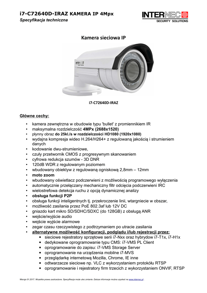 i7-C72640D-IRAZ KAMERA IP 4Mpx Specyfikacja techniczna Kamera sieciowa IP i7-C72640D-IRAZ Główne cechy: • • kamera zewnętrzna w obudowie typu 'bullet' z promiennikiem IR maksymalna rozdzielczość 4MPx (2688x1520) • płynny obraz do 25kl./s w rozdzielczości HD1080 (1920x1080) • wydajna kompresja wideo H.264/H264+ z regulowaną jakością i strumieniem danych kodowanie dwu-strumieniowe, czuły przetwornik CMOS z progresywnym skanowaniem cyfrowa redukcja szumów - 3D DNR 120dB WDR z regulowanym poziomem wbudowany obiektyw z regulowaną ogniskową 2,8mm – 12mm moto zoom wbudowany oświetlacz podczerwieni z możliwością programowego wyłączenia automatycznie przełączany mechaniczny filtr odcięcia podczerwieni IRC wielostrefowa detekcja ruchu z opcją dynamicznej analizy obsługa funkcji P2P obsługa funkcji inteligentnych tj. przekroczenie linii, wtargniecie w obszar, możliwość zasilania przez PoE 802.3af lub 12V DC gniazdo kart mikro SD/SDHC/SDXC (do 128GB) z obsługą ANR wejście/wyjście audio wejście wyjście alarmowe zegar czasu rzeczywistego z podtrzymaniem po utracie zasilania alternatywne możliwość konfiguracji, podglądu i/lub rejestracji przez: ▪ sieciowe rejestratory sprzętowe serii i7-Nxx oraz hybrydow i7-T1x, i7-H1x ▪ dedykowane oprogramowanie typu CMS: i7-VMS PL Client ▪ oprogramowanie do zapisu: i7-VMS Storage Server ▪ oprogramowanie na urządzenia mobilne i7-MVS ▪ przeglądarkę internetową Mozilla, Chrome, IE inne ▪ odtwarzacze sieciowe np. VLC z wykorzystaniem protokółu RTSP ▪ oprogramowanie i rejestratory firm trzecich z wykorzystaniem ONVIF, RTSP • • • • • • • • • • • • • • • • • Wersja 01.2017. Wszelkie prawa zastrzeżone. Specyfikacja może ulec zmianie. Dalsze informacje można uzyskać na www.internec.pl . i7-C72640D-IRAZ KAMERA IP 4Mpx Specyfikacja techniczna Parametry techniczne: Model Parametry Kamera Przetwornik Min. oświetlenie Elektroniczna migawka Obiektyw Kąt widzenia Cyfrowa redukcja szumów Szeroki zakres dynamiki BLC Dzień / Noc Standard kompresji Kompresja wideo Strumień bitowy wideo Dodatkowe funkcje kodera Kompresja audio Dwustrumieniowość Obraz Maks.rozdzielczość obrazu Liczba klatek na sekundę (fps) przy zadanej rozdzielczości Ustawienia obrazu Funkcje Detekcja ruchu Sieć Zapis sieciowy Opcje zapisu Alarmy Reakcje alarmowe Protokoły Bezpieczeństwo Zgodne systemy Interfejs Interfejs komunikacyjny Kamera 4Mpx w obudowie zewnętrzej z promiennikiem IR 1/3” progressive scan CMOS 0.01Lux @ (F1.2,AGC ON), 0,014Lux (F1.4, AGC ON) 0Lux with IR ON 1/3s -1/10,000s 2,8 ~ 12mm @ F1.4 moto zoom 112° ~ 33,8° 3D DNR z regulowanym poziomem 0-100 120 dB WDR z regulowanym poziomem 0-100 Tak z wyborem strefy Filtr odcięcia podczerwieni IR cut: 7 poziomów przełączania automatycznego; harmonogram godzinowy przełączania, wywołanie wejściem alarmowym H264+ / H.264 / MJPEG 32 Kbps~16Mbps ROI: 3 obszary zainteresowania, SVC G.711/G.722/G.726/MP2L2 Tak 2688 x 1520 p× 50Hz: 20fps (2688x1520), 25fps (1920x1080), 25fps (1280x720) 60Hz: 20fps (2688x1520), 30fps (1920x1080), 30fps (1280x720) Nasycenie, jasność, kontrast, ostrość: ustawiane przez CMS lub przeglądarkę Znak wodny, przeciwmigotanie, lustro, obrót 90°, maski prywatności na obrazie, smart IR, własny tekst na obrazie. 22x18 pól, czułość 6 poziomów, tryby pracy: normalny oraz zaawansowany. W trybie zaawansowanym możliwość definiowania stref o różnej czułości oraz różnicowania czułości w trybie dzień i noc. NAS Nagrywanie z nadpisywaniem lub do zapełnienia nośnika. Harmonogramy zapisu: ciągły lub alarmowy z detekcji ruchu. Detekcja ruchu, przekroczenie linii wirtualnej, wtargnięcie w obszar, sabotaż wideo, dysk pełny, nieuprawnione logowanie, błąd zapisu, konflikt adresów IP, odłączenie od sieci IP. Wyzwolenie nagrywania, wysłanie e-mail, zrzut zdjęcia na FTP, przesłanie informacji o zdarzeniu do oprogramowanie i7-VMS, TCP/IP, HTTP, DHCP, DNS, DDNS, RTP, RTSP, PPPoE, SMTP, NTP, UPnP, ICMP, IGMP, SNMP, FTP, 802.1x, QoS ,HTTPS, UPnP, Ipv6, Bonjour Ochrona hasłem z opcją dostępu anonimowego, możliwość definiowania użytkowników, filtr adresów IP. ONVIF (PROFIL S, PROFIL G), PSIA, CGI, ISAPI, P2P RJ45 10M / 100M Ethernet Wersja 01.2017. Wszelkie prawa zastrzeżone. Specyfikacja może ulec zmianie. Dalsze informacje można uzyskać na www.internec.pl . i7-C72640D-IRAZ KAMERA IP 4Mpx Specyfikacja techniczna Przycisk reset Zapis lokalny Wyjście wideo Audio Alarmy Ogólne Warunki pracy Oświetlacz Zasilanie Pobór mocy Wymiary Waga Tak Wsparcie dla kart SD/SDHC/SDXC do 128GB, wbudowany slot micro SD CVBS Wejście / wyjście audio Wejście / wyjście alarmowe Kamera zewnętrzna IP67 ; -30℃~60℃, wilgotność maks. 95% (nieskondensowana) Wbudowany oświetlacz podczerwieni do 20-30m. Możliwość programowego wyłączenia. 12V DCV±10% / PoE (802.3af Class3) Maks. 7,5W 95 x 105 x 258.6 mm 1200g Zasilacz i karta SD nie są zawarte w zestawie, należy nabyć oddzielnie. Wersja 01.2017. Wszelkie prawa zastrzeżone. Specyfikacja może ulec zmianie. Dalsze informacje można uzyskać na www.internec.pl . i7-C72640D-IRAZ KAMERA IP 4Mpx Specyfikacja techniczna Informacje do zamówień: i7-C72640D-IRAZ Wymiary: jednostka [mm] Akcesoria: i7-B1260 - puszka montażowa Rysunek przedstawia puszkę oraz fragment uchwytu kamery. Wersja 01.2017. Wszelkie prawa zastrzeżone. Specyfikacja może ulec zmianie. Dalsze informacje można uzyskać na www.internec.pl .