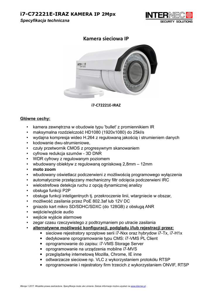 i7-C72221E-IRAZ KAMERA IP 2Mpx Specyfikacja techniczna Kamera sieciowa IP i7-C72221E-IRAZ Główne cechy: • • • • • • • • • • • • • • • • • • • • kamera zewnętrzna w obudowie typu 'bullet' z promiennikiem IR maksymalna rozdzielczość HD1080 (1920x1080) do 25kl/s wydajna kompresja wideo H.264 z regulowaną jakością i strumieniem danych kodowanie dwu-strumieniowe, czuły przetwornik CMOS z progresywnym skanowaniem cyfrowa redukcja szumów - 3D DNR WDR cyfrowy z regulowanym poziomem wbudowany obiektyw z regulowaną ogniskową 2,8mm – 12mm moto zoom wbudowany oświetlacz podczerwieni z możliwością programowego wyłączenia automatycznie przełączany mechaniczny filtr odcięcia podczerwieni IRC wielostrefowa detekcja ruchu z opcją dynamicznej analizy obsługa funkcji P2P obsługa funkcji inteligentnych tj. przekroczenie linii, wtargniecie w obszar, możliwość zasilania przez PoE 802.3af lub 12V DC gniazdo kart mikro SD/SDHC/SDXC (do 128GB) z obsługą ANR wejście/wyjście audio wejście wyjście alarmowe zegar czasu rzeczywistego z podtrzymaniem po utracie zasilania alternatywne możliwość konfiguracji, podglądu i/lub rejestracji przez: ▪ sieciowe rejestratory sprzętowe serii i7-Nxx oraz hybrydow i7-Tx, i7-H1x ▪ dedykowane oprogramowanie typu CMS: i7-VMS PL Client ▪ oprogramowanie do zapisu: i7-VMS Storage Server ▪ oprogramowanie na urządzenia mobilne i7-MVS ▪ przeglądarkę internetową Mozilla, Chrome, IE inne ▪ odtwarzacze sieciowe np. VLC z wykorzystaniem protokółu RTSP ▪ oprogramowanie i rejestratory firm trzecich z wykorzystaniem ONVIF, RTSP Wersja 1.2017. Wszelkie prawa zastrzeżone. Specyfikacja może ulec zmianie. Dalsze informacje można uzyskać na www.internec.pl . i7-C72221E-IRAZ KAMERA IP 2Mpx Specyfikacja techniczna Parametry techniczne: Model Parametry Kamera Przetwornik Min. oświetlenie Elektroniczna migawka Obiektyw Kąt widzenia Cyfrowa redukcja szumów Szeroki zakres dynamiki BLC Dzień / Noc Standard kompresji Kompresja wideo Strumień bitowy wideo Dodatkowe funkcje kodera Kompresja audio Dwustrumieniowość Obraz Maks.rozdzielczość obrazu Liczba klatek na sekundę (fps) przy zadanej rozdzielczości Ustawienia obrazu Funkcje Detekcja ruchu Sieć Zapis sieciowy Opcje zapisu Alarmy Reakcje alarmowe Protokoły Bezpieczeństwo Zgodne systemy Interfejs Interfejs komunikacyjny i7-C72221E-IRAZ Kamera 2Mpx w obudowie zewnętrzej z promiennikiem IR 1/2.7” progressive scan CMOS 0.01Lux @ (F1.2,AGC ON), 0,014Lux (F1.4, AGC ON) 0Lux with IR ON 1/3s -1/100000s 2.8 ~ 12mm @ F1.4 moto zoom 112° ~ 33,8° 3D DNR z regulowanym poziomem 0-100 D-WDR – cyfrowy WDR z regulowanym poziomem 0-100 Tak z wyborem strefy Filtr odcięcia podczerwieni IR cut: 7 poziomów przełączania automatycznego; harmonogram godzinowy przełączania, wywołanie wejściem alarmowym H.264 / MJPEG 32 Kbps~8Mbps ROI: 3 obszary zainteresowania, SVC G.711/G.722/G.726/MP2L2 Tak 1920 x 1080 p× 50Hz: 25fps (1920 × 1080), 25fps (1280 x 960), 25fps (1280 x 720) 60Hz: 30fps (1920 × 1080), 30fps (1280 x 960), 30fps (1280 x 720) Nasycenie, jasność, kontrast, ostrość: ustawiane przez CMS lub przeglądarkę Znak wodny, przeciwmigotanie, lustro, obrót 90°, maski prywatności na obrazie, smart IR, własny tekst na obrazie. 22x18 pól, czułość 6 poziomów, tryby pracy: normalny oraz zaawansowany. W trybie zaawansowanym możliwość definiowania stref o różnej czułości oraz różnicowania czułości w trybie dzień i noc. NAS Nagrywanie z nadpisywaniem lub do zapełnienia nośnika. Harmonogramy zapisu: ciągły lub alarmowy z detekcji ruchu. Detekcja ruchu, przekroczenie linii wirtualnej, wtargnięcie w obszar, sabotaż wideo, dysk pełny, nieuprawnione logowanie, błąd zapisu, konflikt adresów IP, odłączenie od sieci IP. Wyzwolenie nagrywania, wysłanie e-mail, zrzut zdjęcia na FTP, przesłanie informacji o zdarzeniu do oprogramowanie i7-VMS, TCP/IP, HTTP, DHCP, DNS, DDNS, RTP, RTSP, PPPoE, SMTP, NTP, UPnP, ICMP, IGMP, SNMP, FTP, 802.1x, QoS ,HTTPS, UPnP, Ipv6, Bonjour Ochrona hasłem z opcją dostępu anonimowego, możliwość definiowania użytkowników, filtr adresów IP. ONVIF (PROFIL S, PROFIL G), PSIA, CGI, ISAPI, P2P RJ45 10M / 100M Ethernet Wersja 1.2017. Wszelkie prawa zastrzeżone. Specyfikacja może ulec zmianie. Dalsze informacje można uzyskać na www.internec.pl . i7-C72221E-IRAZ KAMERA IP 2Mpx Specyfikacja techniczna Przycisk reset Zapis lokalny Wyjście wideo Audio Alarmy Ogólne Warunki pracy Oświetlacz Zasilanie Pobór mocy Wymiary Waga Tak Wsparcie dla kart SD/SDHC/SDXC do 128GB, wbudowany slot micro SD CVBS Wejście / wyjście audio 2 wejścia / 2 wyjście alarmowe Kamera zewnętrzna IP67 ; -30℃~60℃, wilgotność maks. 95% (nieskondensowana) Wbudowany oświetlacz podczerwieni do 20-30m. Możliwość programowego wyłączenia. 12V DCV±10% / PoE (802.3af Class3) Maks. 7,5W 95 x 105 x 258.6 mm 1200g Zasilacz i karta SD nie są zawarte w zestawie, należy nabyć oddzielnie. Wersja 1.2017. Wszelkie prawa zastrzeżone. Specyfikacja może ulec zmianie. Dalsze informacje można uzyskać na www.internec.pl . i7-C72221E-IRAZ KAMERA IP 2Mpx Specyfikacja techniczna Informacje do zamówień: i7-C72221E-IRAZ Wymiary: jednostka [mm] Akcesoria: i7-B1260 – opcjonalna puszka montażowa Rysunek przedstawia puszkę oraz fragment uchwytu kamery. Wersja 1.2017. Wszelkie prawa zastrzeżone. Specyfikacja może ulec zmianie. Dalsze informacje można uzyskać na www.internec.pl .