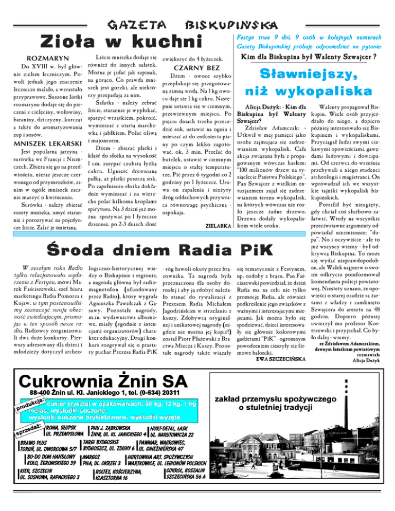 Zioła w kuchni Festyn trwa 9 dni, 9 osób w kolejnych numerach Gazety Biskupińskiej próbuje odpowiedzieć na pytanie: Liście mniszka dodaje się również do innych sałatek. Można je jadać jak szpinak, na gorąco. Co prawda mni− szek jest gorzki, ale niektó− rzy przepadają za nim. Sałatka − należy zebrać liście, starannie je wypłukać, sparzyć wrzątkiem, pokroić, wymieszać z utartą marche− wką i jabłkiem. Polać oliwą i majonezem. Dżem − zbierać płatki i kłaść do słoika na wysokość 1 cm. zasypać czubatą łyżką cukru. Ugnieść drewnianą pałką, aż płatki puszczą sok. Po zapełnieniu słoika dokła− dnie wymieszać i na wierz− chu polać kilkoma kroplami spirytusu. Na 3 dzień już mo− żna spożywać po 1 łyżeczce dziennie, po 2−3 dniach ilość Kim dla Biskupina był Walenty Szwajcer ? ROZMARYN Do XVIII w. był głów− nie zielem leczniczym. Po− woli jednak jego znaczenie lecznicze malało, a wzrastało przyprawowe. Suszone listki rozmarynu dodaje się do pie− czeni z cielęciny, wołowiny, baraniny, dziczyzny, kurcząt a także do aromatyzowania zup i sosów. MNISZEK LEKARSKI Jest popularną jarzyną − surówką we Francji i Niem− czech. Zbiera się go na przed− wiośniu, nieraz jeszcze czer− wonego od przymrozków, za− nim w ogóle mniszek zacz− nie marzyć o kwitnieniu. Surówka − należy zbierać rozety mniszka, umyć staran− nie i porozrywać na pojedyn− cze liście. Zalać je śmietaną. zwiększyć do 4 łyżeczek. CZARNY BEZ Dżem − owoce szybko przepłukuje się przegotowa− ną zimną wodą. Na 1 kg owo− cu daje się 1 kg cukru. Nastę− pnie ustawia się w ciemnym, przewiewnym miejscu. Po pięciu dniach trzeba przece− dzić sok, ustawić na ogniu i mieszać aż do zniknięcia pia− ny po czym lekko zagoto− wać, ok. 3 min. Przelać do butelek, ustawić w ciemnym miejscu o stałej temperatu− rze. Pić przez 6 tygodni co 2 godziny po 1 łyżeczce. Usu− wa on zapalenia i nieżyty dróg oddechowych przywra− ca równowagę psychiczną − uspokaja. ZIELARKA Sławniejszy, niż wykopaliska Alicja Dużyk: − Kim dla Biskupina był Walenty Szwajcer? Zdzisław Adamczak: − Utkwił w mej pamięci jako osoba zajmująca się zadrze− wianiem wykopalisk. Cała akcja związana była z propa− gowanym wówczas hasłem: “100 milionów drzew na ty− siąclecie Państwa Polskiego”. Pan Szwajcer z wielkim en− tuzjazmem zajął się zadrze− wianiem terenu wykopalisk, na których wówczas nie ros− ło jeszcze żadne drzewo. Drzewa dodały wykopalis− kom wiele uroku. Środa dniem Radia PiK W zeszłym roku Radio tylko relacjonowało wyda− rzenia z Festynu, mówi Ma− rek Faściszewski, szef biura marketingu Radia Pomorza i Kujaw, w tym postanowiliś− my zaznaczyć swoją obec− ność zwiedzającym, promu− jąc w ten sposób nasze ra− dio. Radiowcy zorganizowa− li dwa duże konkursy. Pier− wszy adresowany dla dzieci i młodzieży dotyczył archeo− logiczno−historycznej wie− dzy o Biskupinie i regionie, a nagrodą główną był radio− magnetofon (ufundowany przez Radio), który wygrała Agnieszka Pawełczak z Gą− sawy. Pozostałe nagrody, m.in. wydawnictwa albumo− we, miały (zgodnie z inten− cjami organizatorów) chara− kter edukacyjny. Drugi kon− kurs rozgrywał się o prasta− ry puchar Prezesa Radia PiK − róg bawoli okuty przez brą− zownika. Ta nagroda była przeznaczona dla osoby do− rosłej i aby ją zdobyć należa− ło stanąć do rywalizacji z Prezesem Radia Michałem Jagodzińskim w strzelaniu z kuszy. Zdobywcą oryginal− nej i unikatowej nagrody (ni− gdzie nie można jej kupić!) został Piotr Płażewski z Bra− ctwa Miecza i Kuszy. Pozos− tałe nagrody także wiązały się tematycznie z Festynem, np. ozdoby z brązu. Pan Faś− ciszewski powiedział, że dzień Radia ma na celu nie tylko promocję Radia, ale również podkreślenie jego związków z ważnymi i interesującymi mie− jscami. Jak można było się spodziewać, dzieci interesowa− ły się głównie kolorowymi gadżetami “PiK” − ogromnym powodzeniem cieszyły się fir− mowe baloniki. EWA SZCZECIŃSKA Walenty propagował Bis− kupin. Wiele osób przyjeż− dżało do niego, a dopiero później interesowało się Bis− kupinem i wykopaliskami. Przyciągał ludzi swymi cie− kawymi opowieściami, gawę− dami ludowymi i dowcipa− mi. Od czerwca do września przebywali u niego studenci archeologii i magistranci. On wprowadzał ich we wszyst− kie tajniki wykopalisk bis− kupińskich. Potrafił być nieugięty, gdy chciał coś służbowo za− łatwić. Wtedy na wszystkie przeciwstawne argumenty od− powiadał niezmiennie: “du− pa”. No i oczywiście − ale to już wszyscy wiemy − był od− krywcą Biskupina. To może się wydać nieprawdopodob− ne, ale Walek najpierw o swo− im odkryciu poinformował komendanta policji powiato− wej. Niestety uznano, że opo− wieści o starej osadzie są żar− tami z władzy i zamknięto Szwajcera do aresztu na 48 godzin. Dopiero później uwierzył mu profesor Kos− trzewski i przyjechał. Co by− ło dalej − wiemy. ze Zdzisławem Adamczakiem, dawnym leśnikiem powiatowym rozmawiała Alicja Dużyk