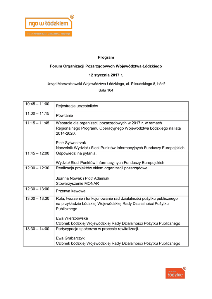 Program Forum Organizacji Pozarządowych Województwa Łódzkiego 12 stycznia 2017 r. Urząd Marszałkowski Województwa Łódzkiego, al. Piłsudskiego 8, Łódź Sala 104 10:45 – 11:00 11:00 – 11:15 11:15 – 11:45 Rejestracja uczestników Powitanie Wsparcie dla organizacji pozarządowych w 2017 r. w ramach Regionalnego Programu Operacyjnego Województwa Łódzkiego na lata 2014-2020. 11:45 – 12:00 Piotr Sylwestrzak Naczelnik Wydziału Sieci Punktów Informacyjnych Funduszy Europejskich Odpowiedzi na pytania. 12:00 – 12:30 Wydział Sieci Punktów Informacyjnych Funduszy Europejskich Realizacja projektów okiem organizacji pozarządowej. Joanna Nowak i Piotr Adamiak Stowarzyszenie MONAR 12:30 – 13:00 13:00 – 13:30 13:30 – 14:00 Przerwa kawowa Rola, tworzenie i funkcjonowanie rad działalności pożytku publicznego na przykładzie Łódzkiej Wojewódzkiej Rady Działalności Pożytku Publicznego. Ewa Wierzbowska Członek Łódzkiej Wojewódzkiej Rady Działalności Pożytku Publicznego Partycypacja społeczna w procesie rewitalizacji. Ewa Grabarczyk Członek Łódzkiej Wojewódzkiej Rady Działalności Pożytku Publicznego