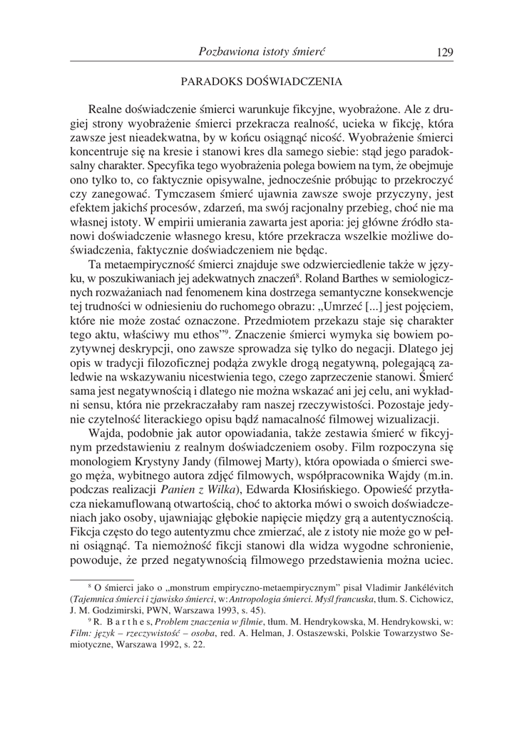 Pozbawiona istoty śmierć 129 PARADOKS DOŚWIADCZENIA Realne doświadczenie śmierci warunkuje fikcyjne, wyobrażone. Ale z dru− giej strony wyobrażenie śmierci przekracza realność, ucieka w fikcję, która zawsze jest nieadekwatna, by w końcu osiągnąć nicość. Wyobrażenie śmierci koncentruje się na kresie i stanowi kres dla samego siebie: stąd jego paradok− salny charakter. Specyfika tego wyobrażenia polega bowiem na tym, że obejmuje ono tylko to, co faktycznie opisywalne, jednocześnie próbując to przekroczyć czy zanegować. Tymczasem śmierć ujawnia zawsze swoje przyczyny, jest efektem jakichś procesów, zdarzeń, ma swój racjonalny przebieg, choć nie ma własnej istoty. W empirii umierania zawarta jest aporia: jej główne źródło sta− nowi doświadczenie własnego kresu, które przekracza wszelkie możliwe do− świadczenia, faktycznie doświadczeniem nie będąc. Ta metaempiryczność śmierci znajduje swe odzwierciedlenie także w języ− ku, w poszukiwaniach jej adekwatnych znaczeń8. Roland Barthes w semiologicz− nych rozważaniach nad fenomenem kina dostrzega semantyczne konsekwencje tej trudności w odniesieniu do ruchomego obrazu: „Umrzeć [...] jest pojęciem, które nie może zostać oznaczone. Przedmiotem przekazu staje się charakter tego aktu, właściwy mu ethos”9. Znaczenie śmierci wymyka się bowiem po− zytywnej deskrypcji, ono zawsze sprowadza się tylko do negacji. Dlatego jej opis w tradycji filozoficznej podąża zwykle drogą negatywną, polegającą za− ledwie na wskazywaniu nicestwienia tego, czego zaprzeczenie stanowi. Śmierć sama jest negatywnością i dlatego nie można wskazać ani jej celu, ani wykład− ni sensu, która nie przekraczałaby ram naszej rzeczywistości. Pozostaje jedy− nie czytelność literackiego opisu bądź namacalność filmowej wizualizacji. Wajda, podobnie jak autor opowiadania, także zestawia śmierć w fikcyj− nym przedstawieniu z realnym doświadczeniem osoby. Film rozpoczyna się monologiem Krystyny Jandy (filmowej Marty), która opowiada o śmierci swe− go męża, wybitnego autora zdjęć filmowych, współpracownika Wajdy (m.in. podczas realizacji Panien z Wilka), Edwarda Kłosińskiego. Opowieść przytła− cza niekamuflowaną otwartością, choć to aktorka mówi o swoich doświadcze− niach jako osoby, ujawniając głębokie napięcie między grą a autentycznością. Fikcja często do tego autentyzmu chce zmierzać, ale z istoty nie może go w peł− ni osiągnąć. Ta niemożność fikcji stanowi dla widza wygodne schronienie, powoduje, że przed negatywnością filmowego przedstawienia można uciec. 8 O śmierci jako o „monstrum empiryczno−metaempirycznym” pisał Vladimir Jankélévitch (Tajemnica śmierci i zjawisko śmierci, w: Antropologia śmierci. Myśl francuska, tłum. S. Cichowicz, J. M. Godzimirski, PWN, Warszawa 1993, s. 45). 9 R. B a r t h e s, Problem znaczenia w filmie, tłum. M. Hendrykowska, M. Hendrykowski, w: Film: język – rzeczywistość – osoba, red. A. Helman, J. Ostaszewski, Polskie Towarzystwo Se− miotyczne, Warszawa 1992, s. 22. 130 Waldemar FRĄC Realne spotkanie z czyjąś śmiercią, stanowiące kontrapunkt dla fikcji, wyklu− cza eskapizm: ta śmierć się wydarzyła, ujawniła nieredukowalną nieobecność człowieka, która wkracza w doświadczenie odbiorcy. Twórcy filmu wpisali jednak realny ślad faktycznej śmierci w przestrzeń fikcyjnego, malarskiego wyobrażenia Edwarda Hoppera. Czy pośrednictwo kreacji przekraczającej rze− czywistość ma osłabić mrok i chłód, będący nieuchronną konsekwencją au− tentyczności przekazu śmierci? Wnętrze pokoju, w którym Krystyna Janda relacjonuje śmierć swojego męża i wydarzenia z nią związane, najbardziej przypomina w układzie prze− strzennym i kolorystyce późny obraz amerykańskiego malarza Kobieta w słoń− cu (1961). Dominująca w obrazie zieleń (barwa życia, ale także śmierci w jej somatycznych metamorfozach; ten sam kolor wyraża rozkwit, triumfalny roz− rost życia, ale i śmierć, jego porażkę: różnica jest ulotna, chodzi o pewien od− cień, który jest cieniem śmierci), wypełniająca wnętrze pokoju, stanowi tło dla stojącej obok łóżka nagiej kobiety, patrzącej przed siebie, trzymającej w ręku papierosa. Niewidoczne w malarskiej przestrzeni okno, przez które kobieta spogląda, zaznaczone zaledwie konturem zasłony, wpuszcza do wnętrza po− koju słoneczne światło. Światło to rozjaśnia jej nagie ciało i przezwycięża mrok przepełniający przedmioty. Zewnętrzna jasność postaci zdaje się kłócić z dojmującym wrażeniem osamotnienia. Skierowane ku oknu ciało, dążące ku czemuś w swej statyczności, nie może jednak przekroczyć wewnętrznej grani− cy przestrzeni. Światła jest tylko tyle, ile płynie go z zewnątrz, wewnątrz nie ma ono żadnego źródła. Pełne rezygnacji (?) oczekiwanie na zmianę, która ma pojawić się z zewnątrz, jest podstawowym sensem osamotnienia. Kobieta Hoppera stoi w wyczekiwaniu, w perspektywie niespełnialnej na− dziei. Istnieje taki egzystencjalny fenomen: nadzieja, która nie może się urze− czywistnić, bywa wyzwaniem uniemożliwiającym pogrążenie się w zupełnej rozpaczy. Choć tak naprawdę wiadomo, że spełnić się nie może, nadzieja jawi się jako paradoksalne oczekiwanie na sens, który w ten sposób jest chroniony przed całkowitą zatratą. Spojrzenie przez okno w płynącą zeń jasność wyraża wewnętrzny brak, ale także „niemożliwą możliwość” zwrócenia się ku tej jas− ności; jest ciągłym – choć posiadającym swe minima i maksima – spodziewaniem się. Kres nadziei to koniec oczekiwania. Nadzieja jest rozpisana na pozbawio− ny kresu czas. Filmowe uplastycznienie monologu Jandy okazuje się bardziej mroczne, bolesne. Osamotnienie wypływające z realnej śmierci jest przecież nieredukowal− ne – brak najbliższej osoby j