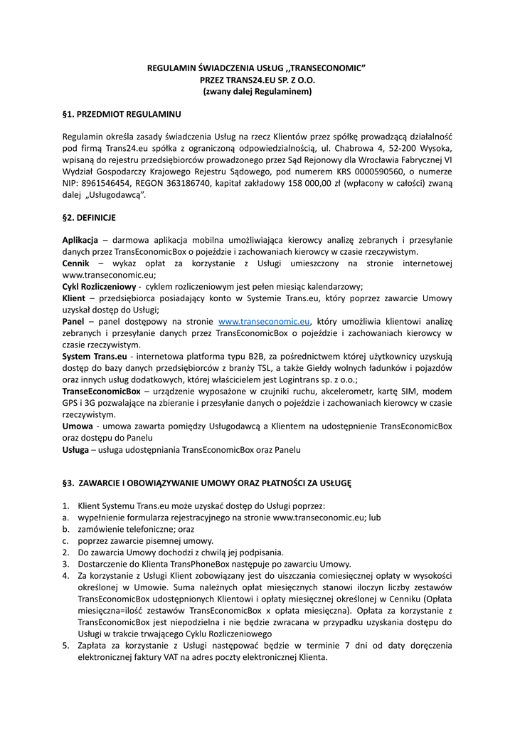 REGULAMIN ŚWIADCZENIA USŁUG ,,TRANSECONOMIC” PRZEZ TRANS24.EU SP. Z O.O. (zwany dalej Regulaminem) §1. PRZEDMIOT REGULAMINU Regulamin określa zasady świadczenia Usług na rzecz Klientów przez spółkę prowadzącą działalność pod firmą Trans24.eu spółka z ograniczoną odpowiedzialnością, ul. Chabrowa 4, 52-200 Wysoka, wpisaną do rejestru przedsiębiorców prowadzonego przez Sąd Rejonowy dla Wrocławia Fabrycznej VI Wydział Gospodarczy Krajowego Rejestru Sądowego, pod numerem KRS 0000590560, o numerze NIP: 8961546454, REGON 363186740, kapitał zakładowy 158 000,00 zł (wpłacony w całości) zwaną dalej „Usługodawcą”. §2. DEFINICJE Aplikacja – darmowa aplikacja mobilna umożliwiająca kierowcy analizę zebranych i przesyłanie danych przez TransEconomicBox o pojeździe i zachowaniach kierowcy w czasie rzeczywistym. Cennik – wykaz opłat za korzystanie z Usługi umieszczony na stronie internetowej www.transeconomic.eu; Cykl Rozliczeniowy - cyklem rozliczeniowym jest pełen miesiąc kalendarzowy; Klient – przedsiębiorca posiadający konto w Systemie Trans.eu, który poprzez zawarcie Umowy uzyskał dostęp do Usługi; Panel – panel dostępowy na stronie www.transeconomic.eu, który umożliwia klientowi analizę zebranych i przesyłanie danych przez TransEconomicBox o pojeździe i zachowaniach kierowcy w czasie rzeczywistym. System Trans.eu - internetowa platforma typu B2B, za pośrednictwem której użytkownicy uzyskują dostęp do bazy danych przedsiębiorców z branży TSL, a także Giełdy wolnych ładunków i pojazdów oraz innych usług dodatkowych, której właścicielem jest Logintrans sp. z o.o.; TranseEconomicBox – urządzenie wyposażone w czujniki ruchu, akcelerometr, kartę SIM, modem GPS i 3G pozwalające na zbieranie i przesyłanie danych o pojeździe i zachowaniach kierowcy w czasie rzeczywistym. Umowa - umowa zawarta pomiędzy Usługodawcą a Klientem na udostępnienie TransEconomicBox oraz dostępu do Panelu Usługa – usługa udostępniania TransEconomicBox oraz Panelu §3. ZAWARCIE I OBOWIĄZYWANIE UMOWY ORAZ PŁATNOŚCI ZA USŁUGĘ 1. a. b. c. 2. 3. 4. Klient Systemu Trans.eu może uzyskać dostęp do Usługi poprzez: wypełnienie formularza rejestracyjnego na stronie www.transeconomic.eu; lub zamówienie telefoniczne; oraz poprzez zawarcie pisemnej umowy. Do zawarcia Umowy dochodzi z chwilą jej podpisania. Dostarczenie do Klienta TransPhoneBox następuje po zawarciu Umowy. Za korzystanie z Usługi Klient zobowiązany jest do uiszczania comiesięcznej opłaty w wysokości określonej w Umowie. Suma należnych opłat miesięcznych stanowi iloczyn liczby zestawów TransEconomicBox udostępnionych Klientowi i opłaty miesięcznej określonej w Cenniku (Opłata miesięczna=ilość zestawów TransEconomicBox x opłata miesięczna). Opłata za korzystanie z TransEconomicBox jest niepodzielna i nie będzie zwracana w przypadku uzyskania dostępu do Usługi w trakcie trwającego Cyklu Rozliczeniowego 5. Zapłata za korzystanie z Usługi następować będzie w terminie 7 dni od daty doręczenia elektronicznej faktury VAT na adres poczty elektronicznej Klienta. 6. Usługodawca może wstrzymać się ze świadczeniem Usług w przypadku gdy Klient opóźnia się zapłatą 7 dni. 7. W przypadku gdy Klient opóźnia się z uiszczeniem opłaty za Usługę przez dwa Cykle Rozliczeniowe Trans24 może rozwiązać Umowę w trybie natychmiastowym bez zachowania okresu wypowiedzenia. W przypadku gdy Trans24 rozwiąże Umowę z przyczyny określonej w zdaniu poprzednim Klient zapłaci Trans24 nieuiszczone opłaty oraz dodatkowo opłatę za wykup TransEconomicBox w wysokości odpowiadającej 24krotności miesięcznej opłaty netto określonej w Umowie, do której uiszczania Klient był zobowiązany. Opłata zostanie powiększona o stawkę podatku VAT w wysokości określonej powszechnie obowiązującymi przepisami. 8. W przypadku gdy Klient rozwiąże Umowę przed okresem, na który została zawarta lub automatycznie przedłużona, Klient zapłaci Trans24 jednorazową opłatę za wykup Telefonu w wysokości odpowiadającej 24-krotności miesięcznej opłaty netto określonej w Umowie, do której uiszczania był zobowiązany. Opłata zostanie powiększona o stawkę podatku VAT w wysokości określonej powszechnie obowiązującymi przepisami. §4. ZAKRES USŁUGI 1. W ramach Usługi Klient otrzymuje do korzystania TransEconomicBox oraz możliwość korzystania z Panelu. 2. Pracownicy Klienta mogą pobrać i korzystać z Aplikacji. 3. W ramach Usługi oraz Umowy Klient nie nabywa praw własności intelektualnej do Aplikacji oraz udostępnionego mu oprogramowania w ramach Panelu. 4. Klient może wykupić na własność TransPhone Box na zasadach i za cenę określoną w Umowie. §5. OŚWIADCZENIA USŁUGODAWCY 1. Usługodawca oświadcza, iż świadczenie Usługi następuje w zakresie licencjonowanego systemu teleinformatycznego osób trzecich, posiadających stosowne uprawnienia w tym zakresie, na podstawie zawartych z nimi umów. Usługodawca nie ponosi odpowiedzialności za działania lub zaniechania tych podmiotów. 2. Usługodawca dołoży najlepszych starań, aby zapewnić dostęp do korzystania z Usługi przez 24 godziny na dobę. Jednakże dostęp może ulegać zakłóceniom w każdym czasie ze względu na prowadzone przez dostawców oprogramowania prace konserwacyjne lub aktualizacje. Prace będą wykonywane w miarę możliwości w dniach od soboty od godz. 20:00 do niedzieli do godz. 08:00. Przed rozpoczęciem prac Usługodawca powiadomi Klienta o ich terminie oraz przewidywanym czasie ich trwania. 3. W szczególnych przypadkach mających wpływ na bezpieczeństwo lub stabilność Usługi Usługodawca zastrzega sobie prawo do czasowego nie dłuższego niż 24 h zaprzestania lub ograniczenia świadczenia Usług, bez wcześniejszego powiadomienia, celem przywrócenia bezpieczeństwa i stabilności Usługi. 4. Usługodawca będzie przekazywał Klientom 