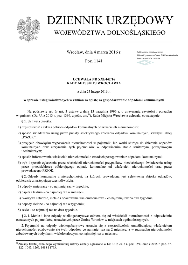 DZIENNIK URZĘDOWY WOJEWÓDZTWA DOLNOŚLĄSKIEGO Wrocław, dnia 4 marca 2016 r. Elektronicznie podpisany przez: Milena Pigdanowicz-Fidera; DUW we Wrocławiu Poz. 1141 Data: 2016-03-04 13:25:24 UCHWAŁA NR XXI/442/16 RADY MIEJSKIEJ WROCŁAWIA z dnia 25 lutego 2016 r. w sprawie usług świadczonych w zamian za opłatę za gospodarowanie odpadami komunalnymi Na podstawie art. 6r ust. 3 ustawy z dnia 13 września 1996 r. o utrzymaniu czystości i porządku w gminach (Dz. U. z 2013 r. poz. 1399, z późn. zm.1)), Rada Miejska Wrocławia uchwala, co następuje: § 1. Uchwała określa: 1) częstotliwość i zakres odbioru odpadów komunalnych od właścicieli nieruchomości; 2) sposób świadczenia usług przez punkty selektywnego zbierania odpadów komunalnych, zwanymi dalej „PSZOK”; 3) przejęcie obowiązku wyposażenia nieruchomości w pojemniki lub worki służące do zbierania odpadów komunalnych oraz utrzymania tych pojemników w odpowiednim stanie sanitarnym, porządkowym i technicznym; 4) sposób informowania właścicieli nieruchomości o zasadach postępowania z odpadami komunalnymi; 5) tryb i sposób zgłaszania przez właścicieli nieruchomości przypadków niewłaściwego świadczenia usług przez przedsiębiorcę odbierającego odpady komunalne od właścicieli nieruchomości oraz przez prowadzącego PSZOK. § 2. Odpady komunalne z nieruchomości, na których prowadzona jest selektywna zbiórka odpadów, odbiera się z następującą częstotliwością: 1) odpady zmieszane - co najmniej raz w tygodniu; 2) papier i tektura - co najmniej raz w miesiącu; 3) tworzywa sztuczne, metale i opakowania wielomateriałowe - co najmniej raz na dwa tygodnie; 4) odpady zielone - co najmniej raz w tygodniu; 5) szkło - co najmniej raz na dwa tygodnie. § 3. 1. Meble i inne odpady wielkogabarytowe odbiera się od właścicieli nieruchomości z odpowiednio oznaczonych pojemników, ustawianych przez Gminę Wrocław w miejscach ogólnodostępnych. 2. Pojemniki na odpady wielkogabarytowe ustawia się z częstotliwością umożliwiającą właścicielom nieruchomości pozbywanie się tych odpadów co najmniej raz na 2 miesiące, a w przypadku nieruchomości zabudowanych budynkami wielolokalowymi co najmniej raz w miesiącu. 1) Zmiany tekstu jednolitego wymienionej ustawy zostały ogłoszone w Dz. U. z 2013 r. poz. 1593 oraz z 2015 r. poz. 87, 122, 1045, 1269, 1688 i 1793. Dziennik Urzędowy Województwa Dolnośląskiego –2– Poz. 1141 3. Terminy i miejsca rozmieszczenia pojemników na odpady wielkogabarytowe podaje się do wiadomości w sposób określony w § 7 pkt 2. § 4. Odpady komunalne z nieruchomości, na których nie jest prowadzona selektywna zbiórka odpadów, odbiera się co najmniej raz w tygodniu. § 5. 1. PSZOK przyjmują selektywnie zebrane odpady komunalne. 2. PSZOK przyjmują w szczególności następujące rodzaje odpadów komunalnych: 1) opakowania z papieru i tektury, tworzyw sztucznych, szkła, drewna, metalu oraz opakowania wielomateriałowe; 2) odpady zielone; 3) meble i inne odpady wielkogabarytowe; 4) zużyty sprzęt elektryczny i elektroniczny; 5) drewno, tworzywa sztuczne, szkło, papier i metale; 6) zużyte baterie i akumulatory; 7) przeterminowane leki i chemikalia; 8) zużyte opony; 9) odpady budowlane i rozbiórkowe, w ilości nie większej niż 200 l jednorazowo. 3. PSZOK nie przyjmują odpadów zmieszanych. § 6. 1. Gmina Wrocław przejmuje od właścicieli nieruchomości obowiązki: 1) wyposażenia nieruchomości w służące do zbierania odpadów komunalnych pojemniki lub worki o minimalnej pojemności określonej regulaminem utrzymania czystości i porządku obowiązującym na terenie Wrocławia oraz w ilości dostosowanej do zadeklarowanego przez właściciela nieruchomości sposobu zbierania odpadów i zakresu usługi odbierania odpadów komunalnych świadczonej w zamian za uiszczaną przez właściciela opłatę za gospodarowanie odpadami komunalnymi; 2) utrzymania dostarczonych przez Gminę Wrocław pojemników w odpowiednim stanie sanitarnym, porządkowym i technicznym. 2. Wyposażenie nieruchomości w pojemniki, o którym mowa w ust. 1 pkt 1, polega na dostarczeniu pojemników właścicielowi nieruchomości oraz pozostawieniu ich w miejscu, do władania którym w tym zakresie właściciel nieruchomości ma tytuł. Brak takiego miejsca upoważnia Gminę Wrocław do powstrzymania się od wykonania przejętych obowiązków. 3. Usługa, o której mowa w ust. 1 pkt 1, nie obejmuje wykonania obowiązków właściciela nieruchomości dotyczących przygotowania miejsca na pojemniki oraz właściwego rozmieszczenia pojemników na terenie nieruchomości. 4. Rozmieszczenie przez właściciela nieruchomości dostarczonych mu pojemników na terenie, do którego nie posiada tytułu prawnego, upoważnia Gminę Wrocław do ponownego przejęcia pojemników w posiadanie. § 7. Informacje w zakresie: 1) harmonogramu odbioru odpadów komunalnych; 2) harmonogramu odbioru odpadów wielkogabarytowych; 3) miejsc i godzin przyjmowania odpadów komunalnych przez PSZOK oraz szczegółowej charakterystyki tych odpadów; ogłaszane będą na stronie internetowej spółki Ekosystem Sp. z o.o. § 8. Spółka Ekosystem Sp. z o.o. za pośrednictwem strony internetowej oraz Biura Obsługi Klienta świadczy właścicielom nieruchomości pomoc polegającą na udzielaniu informacji dotyczących postępowania z odpadami komunalnymi, w szczególności w zakresie: Dziennik Urzędowy Województwa Dolnośląskiego –3– Poz. 1141 1) obowiązków właścicieli nieruchomości związanych z postępowaniem z odpadami komunalnymi; 2) obowiązków związanych z uiszczaniem opłaty za gospodarowanie odpadami komunalnymi; 3) usług świadczonych w zamian za uiszczoną opłatę. § 9. 1. Przypadki niewłaściwego świadczenia usług przez przedsiębiorcę odbierającego odpady komunalne od właścicieli nieruchomości oraz przez prowadzącego PSZOK właściciele nieruchomości mogą zgłaszać: 1) p