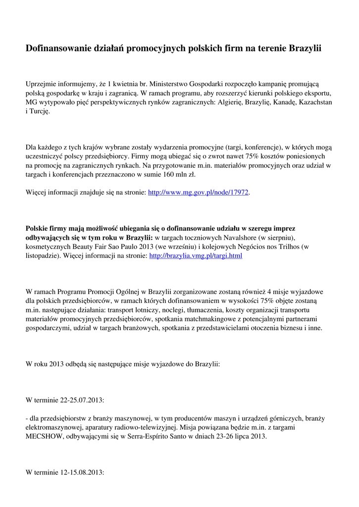 Dofinansowanie działań promocyjnych polskich firm na terenie Brazylii Uprzejmie informujemy, że 1 kwietnia br. Ministerstwo Gospodarki rozpoczęło kampanię promującą polską gospodarkę w kraju i zagranicą. W ramach programu, aby rozszerzyć kierunki polskiego eksportu, MG wytypowało pięć perspektywicznych rynków zagranicznych: Algierię, Brazylię, Kanadę, Kazachstan i Turcję. Dla każdego z tych krajów wybrane zostały wydarzenia promocyjne (targi, konferencje), w których mogą uczestniczyć polscy przedsiębiorcy. Firmy mogą ubiegać się o zwrot nawet 75% kosztów poniesionych na promocję na zagranicznych rynkach. Na przygotowanie m.in. materiałów promocyjnych oraz udział w targach i konferencjach przeznaczono w sumie 160 mln zł. Więcej informacji znajduje się na stronie: http://www.mg.gov.pl/node/17972. Polskie firmy mają możliwość ubiegania się o dofinansowanie udziału w szeregu imprez odbywających się w tym roku w Brazylii: w targach toczniowych Navalshore (w sierpniu), kosmetycznych Beauty Fair Sao Paulo 2013 (we wrześniu) i kolejowych Negócios nos Trilhos (w listopadzie). Więcej informacji na stronie: http://brazylia.vmg.pl/targi.html W ramach Programu Promocji Ogólnej w Brazylii zorganizowane zostaną również 4 misje wyjazdowe dla polskich przedsiębiorców, w ramach których dofinansowaniem w wysokości 75% objęte zostaną m.in. następujące działania: transport lotniczy, noclegi, tłumaczenia, koszty organizacji transportu materiałów promocyjnych przedsiębiorców, spotkania matchmakingowe z potencjalnymi partnerami gospodarczymi, udział w targach branżowych, spotkania z przedstawicielami otoczenia biznesu i inne. W roku 2013 odbędą się następujące misje wyjazdowe do Brazylii: W terminie 22-25.07.2013: - dla przedsiębiorstw z branży maszynowej, w tym producentów maszyn i urządzeń górniczych, branży elektromaszynowej, aparatury radiowo-telewizyjnej. Misja powiązana będzie m.in. z targami MECSHOW, odbywającymi się w Serra-Espírito Santo w dniach 23-26 lipca 2013. W terminie 12-15.08.2013: - dla przedsiębiorców reprezentujących przemysł stoczniowy oraz offshore. Misja powiązana zostanie m.in. z targami NAVALSHORE, odbywającymi się w dniach 13-15.08.2013 w Rio de Janeiro. W terminie 6-9.09.2013: - dla firm z branży kosmetycznej, urody, mody (produktów luksusowych). Misja zostanie powiązana m.in. z targami BEAUTY FAIR, odbywającymi się w dniach 7-10.09.2013 w São Paulo. Więcej informacji znajduje się na stronie: http://brazylia.vmg.pl/misje.html Przedsiębiorcy pragnący wziąć udział w targach i misjach gospodarczych powinni zawiadomić o tym organizatora i złożyć wniosek o dofinansowanie w ramach poddziałania 6.5.2 – Wsparcie udziału przedsiębiorców w programach promocji, Program Operacyjny Innowacyjna Gospodarka. Powered by TCPDF (www.tcpdf.org)