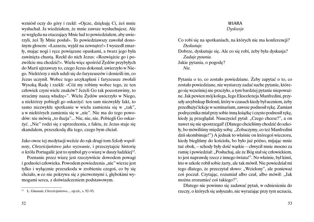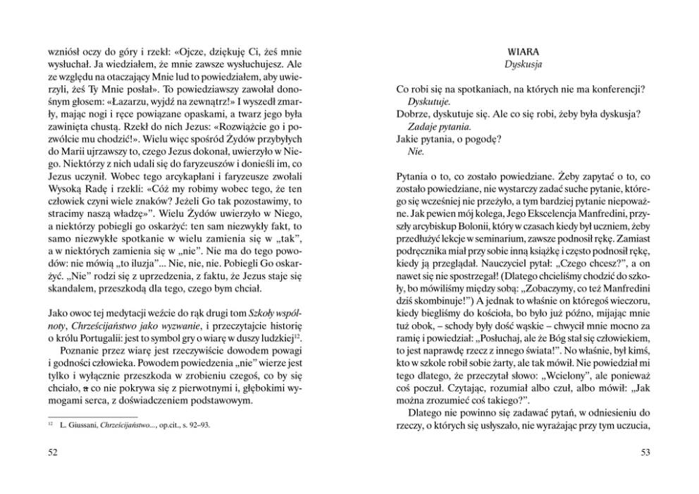 wzniósł oczy do góry i rzekł: «Ojcze, dziękuję Ci, żeś mnie wysłuchał. Ja wiedziałem, że mnie zawsze wysłuchujesz. Ale ze względu na otaczający Mnie lud to powiedziałem, aby uwierzyli, żeś Ty Mnie posłał». To powiedziawszy zawołał donośnym głosem: «Łazarzu, wyjdź na zewnątrz!» I wyszedł zmarły, mając nogi i ręce powiązane opaskami, a twarz jego była zawinięta chustą. Rzekł do nich Jezus: «Rozwiążcie go i pozwólcie mu chodzić!». Wielu więc spośród Żydów przybyłych do Marii ujrzawszy to, czego Jezus dokonał, uwierzyło w Niego. Niektórzy z nich udali się do faryzeuszów i donieśli im, co Jezus uczynił. Wobec tego arcykapłani i faryzeusze zwołali Wysoką Radę i rzekli: «Cóż my robimy wobec tego, że ten człowiek czyni wiele znaków? Jeżeli Go tak pozostawimy, to stracimy naszą władzę»”. Wielu Żydów uwierzyło w Niego, a niektórzy pobiegli go oskarżyć: ten sam niezwykły fakt, to samo niezwykłe spotkanie w wielu zamienia się w „tak”, a w niektórych zamienia się w „nie”. Nie ma do tego powodów: nie mówią „to iluzja”... Nie, nie, nie. Pobiegli Go oskarżyć. „Nie” rodzi się z uprzedzenia, z faktu, że Jezus staje się skandalem, przeszkodą dla tego, czego bym chciał. Jako owoc tej medytacji weźcie do rąk drugi tom Szkoły wspólnoty, Chrześcijaństwo jako wyzwanie, i przeczytajcie historię o królu Portugalii: jest to symbol gry o wiarę w duszy ludzkiej12. Poznanie przez wiarę jest rzeczywiście dowodem powagi i godności człowieka. Powodem powiedzenia „nie” wierze jest tylko i wyłącznie przeszkoda w zrobieniu czegoś, co by się chciało, a co nie pokrywa się z pierwotnymi i, głębokimi wymogami serca, z doświadczeniem podstawowym. 12 52 L. Giussani, Chrześcijaństwo..., op.cit., s. 92–93. WIARA Dyskusja Co robi się na spotkaniach, na których nie ma konferencji? Dyskutuje. Dobrze, dyskutuje się. Ale co się robi, żeby była dyskusja? Zadaje pytania. Jakie pytania, o pogodę? Nie. Pytania o to, co zostało powiedziane. Żeby zapytać o to, co zostało powiedziane, nie wystarczy zadać suche pytanie, którego się wcześniej nie przeżyło, a tym bardziej pytanie niepoważne. Jak pewien mój kolega, Jego Ekscelencja Manfredini, przyszły arcybiskup Bolonii, który w czasach kiedy był uczniem, żeby przedłużyć lekcje w seminarium, zawsze podnosił rękę. Zamiast podręcznika miał przy sobie inną książkę i często podnosił rękę, kiedy ją przeglądał. Nauczyciel pytał: „Czego chcesz?”, a on nawet się nie spostrzegał! (Dlatego chcieliśmy chodzić do szkoły, bo mówiliśmy między sobą: „Zobaczymy, co też Manfredini dziś skombinuje!”) A jednak to właśnie on któregoś wieczoru, kiedy biegliśmy do kościoła, bo było już późno, mijając mnie tuż obok, – schody były dość wąskie – chwycił mnie mocno za ramię i powiedział: „Posłuchaj, ale że Bóg stał się człowiekiem, to jest naprawdę rzecz z innego świata!”. No właśnie, był kimś, kto w szkole robił sobie żarty, ale tak mówił. Nie powiedział mi tego dlatego, że przeczytał słowo: „Wcielony”, ale ponieważ coś poczuł. Czytając, rozumiał albo czuł, albo mówił: „Jak można zrozumieć coś takiego?”. Dlatego nie powinno się zadawać pytań, w odniesieniu do rzeczy, o których się usłyszało, nie wyrażając przy tym uczucia, 53 których się doznało. To pozwala uniknąć dwóch rzeczy: po pierwsze czytania w przekonaniu, że się rozumie, podczas gdy w rzeczywistości nie rozumie się (większość ludzi uważa, że wie, czym jest chrześcijaństwo, podczas gdy tego nie wie; uważa że zna chrześcijańskie słowa, a nie zna ich); po drugie pozwala uniknąć sztuczek, abstrakcyjnego języka, który jest prawie równoznaczny z mówieniem od rzeczy. Dlatego też nie istnieje ani jedno słowo, które nie ma związku z tym, czym żyjemy, które nie zwracałoby się do serca, będącego właściwym miejscem natchnień dla rozumu. Nie istnieje właśnie dlatego, że każdego z tych słów nauczyliśmy się lub usłyszeliśmy od Chrystusa – wprost lub za pośrednictwem Kościoła. Rozum znajduje się w sercu, w przeciwnym razie jest latawcem. Dziś w szkole nie każe się już uczyć niczego na pamięć, to charakterystyczne dla takiej władzy, która chce, żebyście uczyli się na pamięć tego, co ona mówi. Jeśli natomiast nauczycie się na pamięć fragment z Leopardiego, to władza będzie wam mogła powiedzieć, co tylko zechce, ale ten fragment z Leopardiego nie da wam wytchnienia i nie pozwoli wam zostać niewolnikami tego, co mówią w telewizji. Uczenie się na pamięć oznacza utożsamianie się, uczynienie częścią siebie, częścią własnej krwi wielkiego dorobku ludzkości, wyrażonego z nieznanym nam pięknem. Oznacza uczestniczenie w tym pięknie. Mówiłeś o wyjątkowości spotkania. Jak nie pomylić wyjątkowości ze wzruszeniem? W spotkaniu wyjątkowość jest doświadczeniem harmonii tego, co spotykasz – słów, które słyszysz, postawy, którą widzisz – z wymogami twojego serca: odpowiedniość z sercem, wyjątkowy respekt wobec zwyczajnych relacji. Ta odpowiedniość z sercem jest niespotykana w porównaniu ze zwyczajnymi relacjami. 54 Ale im bardziej jest niezwykła, tym bardziej jest też nie do pomyślenia i pozostawia cię pełnym zdumienia. To zdumienie prawdą, veritatis splendor, splendor prawdy, który czyni cię pełnym zdumienia. Tak więc czym jest wyjątkowość? Spotkaniem z czymś, co tak odpowiada na twoje serce, że każe ci powiedzieć: „To niemożliwe, wydarzyła się rzecz niemożliwa”. Z każdym z rodzących się w was pytań możecie zwrócić się do pierwszej strony Ewangelii Świętego Jana, wyobrażając sobie Jana i Andrzeja z Jezusem, który mówi, a oni patrzą na Niego. „To niemożliwe, że jest taki człowiek”. Nie mówili tego, ale tak czuli. Kiedy szli do domu powiedzieli do si