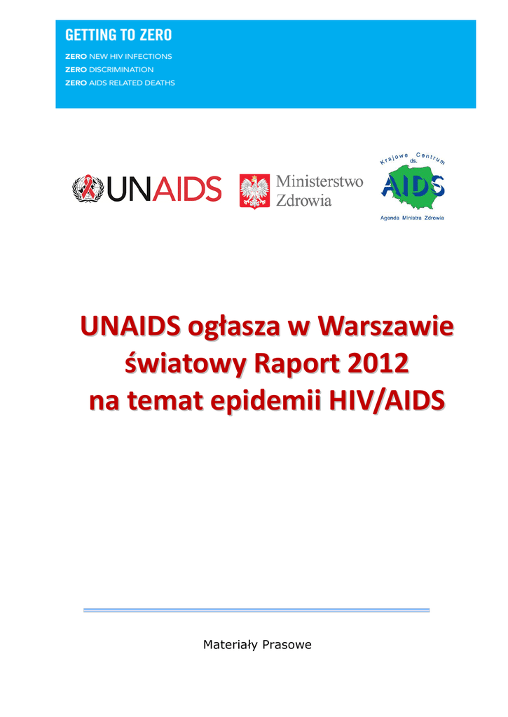 UNAIDS ogłasza w Warszawie światowy Raport 2012 na temat epidemii HIV/AIDS Materiały Prasowe KOMUNIKAT PRASOWY Warszawa, dnia 20 listopada 2012 roku KOMUNIKAT PRASOWY W dniu 20 listopada 2012 roku odbyła się w Warszawie konferencja prasowa zorganizowana z inicjatywy Ministerstwa Zdrowia we współpracy z Biurem Regionalnym Wspólnego Programu Organizacji Narodów Zjednoczonych ds. HIV/AIDS (UNAIDS) na Europę Wschodnią i Azję Środkową oraz Krajowym Centrum ds. AIDS, na której oficjalnie zaprezentowany został Raport UNAIDS 2012 na temat stanu epidemii HIV/AIDS na świecie i problemów z nim związanych. Szczególną uwagę poświęcono bieżącej sytuacji w Europie Wschodniej i Azji Centralnej. Raport opublikowany został z uwagi na zbliżający się i przypadający 1 grudnia Światowy Dzień AIDS. Polska w tym roku przewodzi Radzie Koordynacyjnej Programu UNAIDS i z tego względu prezentacja tegorocznego Raportu miała miejsce w Warszawie. Na konferencji prasowej podkreślono, że epidemia HIV/AIDS pomimo wykorzystania najnowszych zdobyczy wiedzy medycznej wciąż stanowi duże wyzwanie dla zdrowia publicznego tak w Europie, jak i na całym świecie. Podczas spotkania przestawiono również Regiony, w których jest największe zagrożenie epidemiologiczne oraz zarekomendowano działania mające na celu poprawę niepokojącej sytuacji. W konferencji udział wzięli: dr Igor Radziewicz-Winnicki – Podsekretarz Stanu w Ministerstwie Zdrowia i Przewodniczący Rady Koordynacyjnej Programu UNAIDS; dr Jean-Elie Malkin – Dyrektor Biura Regionalnego UNAIDS na Europę i Azję Środkową; przedstawiciele środowiska pacjentów oraz reprezentanci mediów krajowych i zagranicznych. Więcej informacji: Krajowe Centrum ds. AIDS ul. Samsonowska 1, 02-829 Warszawa tel./fax (22) 331 77 77, fax: (22) 331 77 76 email: [email protected], www.aids.gov.pl KOMUNIKAT PRASOWY KOMUNIKAT PRASOWY KOMUNIKAT PRASOWY KOMUNIKAT PRASOWY UNAIDS odnotowuje ponad 50-cio procentowy spadek liczby nowych zakażeń HIV na terenie 25 krajów w czasie, gdy do osiągnięcia światowych celów dot. AIDS pozostało 1000 dni. Ponadto, w ostatnich 24 miesiącach o 63% wzrosła liczba osób mających dostęp do terapii antyretrowirusowej, a liczba zgonów z powodu AIDS spadła o ponad 25% (dane na lata 2005-2011). Genewa, 20 XI 2012 – Nowy raport pt. Wyniki opublikowany z okazji Światowego Dnia AIDS przez Wspólny Program Narodów Zjednoczonych ds. HIV/AIDS (UNAIDS) demonstruje bezprecedensową efektywność walki z AIDS. W raporcie odnotowano ponad 50-cio procentowy spadek liczby nowych zakażeń HIV w 25 krajach o niskich i średnich dochodach. Ponad połowa z nich to kraje Afryki Subsaharyjskiej, czyli regionu dotkniętego problemem HIV w największym stopniu. W niektórych krajach, gdzie notuje się najwyższą prewalencję HIV na świecie, w porównaniu z rokiem 2001 udało się znacząco zredukować liczbę nowych zakażeń: o 73% w Malawi, 71% w Botswanie, 68% w Namibii, 58% w Zambii, 50% w Zimbabwe oraz o 41% w Afryce Południowej i Suazi. To nie koniec dobrych wiadomości dotyczących kwestii profilaktyki HIV: w ostatnich sześciu latach o 1/3 udało się zmniejszyć liczbę zgonów z powodu AIDS w Afryce Subsaharyjskiej. Tylko w ciągu ostatnich dwóch lat do 59% wzrosła tam liczba osób mających dostęp do terapii ARV. „Postęp dokonuje się coraz szybciej – to co kiedyś zabierało nam całą dekadę teraz wykonujemy w ciągu 24 miesięcy,” powiedział Michel Sidibé, Dyrektor Wykonawczy UNAIDS. Idziemy do przodu szybciej i w sposób bardziej przemyślany. To dowód na to, iż przy użyciu woli politycznej i zastosowaniu konsekwencji w działaniu jesteśmy w stanie do roku 2015 wypełnić nasze wspólnie wyznaczone cele. Najnowsze dane zostały opublikowane w momencie, gdy do osiągnięcia Milenijnych Celów Rozwoju oraz celów na rok 2015 określonych w Deklaracji Politycznej nt. HIV i AIDS pozostało 1000 dni. Na przykład, w ostatnich dwóch latach w Afryce Południowej rozszerzono dostępność terapii antyretorwiursowej do 75% – tym samym zapewniając 1.7 milionom ludzi dostęp do leków ratujących życie. Tylko w ciągu dwóch lat liczba nowych zakażeń HIV spadła tam o ponad 50 000. W tym okresie w Afryce Południowej podniesiono wartość inwestycji krajowych związanych z AIDS do 1 miliarda 600 milionów dolarów amerykańskich. To najwyższy poziom odnotowany we wszystkich krajach o niskich i średnich dochodach. W raporcie zauważono krajowych państwa biorą są przez stabilny system roku do roku 2011 ponad również fakt, iż poprzez podnoszenie wartości inwestycji odpowiedzialność finansową na swoje barki, w czym wspierane finansowania pochodzącego od donatorów. W okresie od 2001 81 krajów podwyższyło wartość swych inwestycji krajowych. KOMUNIKAT PRASOWY KOMUNIKAT PRASOWY KOMUNIKAT PRASOWY KOMUNIKAT PRASOWY Spadek liczby nowych zakażeń HIV wśród dzieci Obszar, na którym najprawdopodobniej dokonał się największy postęp to ograniczenie nowych zakażeń HIV wśród dzieci. Połowa spadku liczby nowych przypadków HIV zaobserwowana w ostatnich dwóch latach w skali światowej miała miejsce wśród niemowląt. „Uzyskanie zerowego poziomu nowych zakażeń HIV wśród dzieci staje się coraz bardziej możliwe,” powiedział Michel Sidibé. „Niesłychanie cieszy mnie fakt, iż coraz mniej dzieci rodzi się zakażonych. W tej kwestii przesuwamy się w kierunku: od rozpaczy ku nadziei.” Nowe zakażenia HIV w populacji dzieci (0-14 lat) w latach 2003-2011 Źródło: Globalny Raport UNAIDS 2012 W ostatnich dwóch latach liczba nowych zakażeń HIV wśród dzieci spadła o 23%. W okresie od roku 2009 do roku 2011 liczba dzieci nowo-zakażonych HIV w sześciu krajach: Burundi, Kenii, Namibii, Afryce Południowej, Togo oraz Zambii spadła co najmniej o 40%. Mniejsza liczba zgonów związanych z AIDS W raporcie pokazano, iż terapia antyretorwirusowa stała się potę