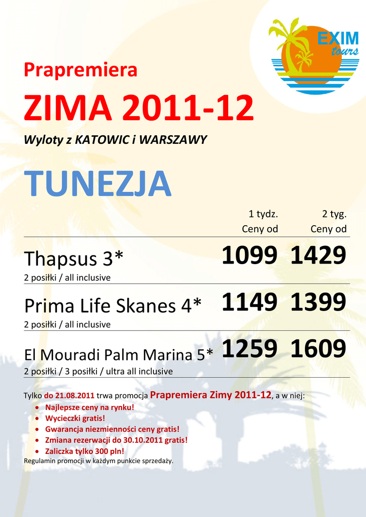 Prapremiera ZIMA 2011-12 Wyloty z KATOWIC i WARSZAWY TUNEZJA 1 tydz. Ceny od Thapsus 3* 2 tyg. Ceny od 1099 1429 2 posiłki / all inclusive Prima Life Skanes 4* 1149 1399 2 posiłki / all inclusive El Mouradi Palm Marina 5* 1259 1609 2 posiłki / 3 posiłki / ultra all inclusive Tylko do 21.08.2011 trwa promocja Prapremiera Zimy 2011-12, a w niej: Najlepsze ceny na rynku! Wycieczki gratis! Gwarancja niezmienności ceny gratis! Zmiana rezerwacji do 30.10.2011 gratis! Zaliczka tylko 300 pln! Regulamin promocji w każdym punkcie sprzedaży.