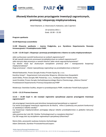 żRozwój klastrów przez przyciąganie inwestycji zagranicznych, promocję i ekspansję międzynarodową Hotel Diament, ul. Dworcowa 9, Katowice, sala C (parter) 23 września 2011 r. Godz. 10.30 – 15.30 Program spotkania 10.30 Rejestracja uczestników 11.00 Otwarcie spotkania – Joanna Podgórska, p.o. Dyrektora Departamentu Rozwoju Innowacyjności i Przedsiębiorczości PARP 11.20 – 12.45 Część I. Ekspansja i promocja przedsiębiorstw z klastra na rynku międzynarodowym Jakie są kluczowe czynniki konkurencji na rynkach zagranicznych? W jaki sposób skutecznie promować przedsiębiorstwa na rynkach zagranicznych? Jakie korzyści daje promocja w ramach klastra? Jakie niesie zagrożenia/wyzwania? Czy klaster może być skutecznym narzędziem promocji firm i nawiązywania kooperacji międzynarodowej? Kogo promować – klaster (specjalizację regionalną) czy przedsiębiorstwa w klastrze? Witold Radwański, Prezes Zarządu Krokus Private Equity Sp. z o.o. Karolina Smeja*, Departament Instrumentów Wsparcia, Ministerstwo Gospodarki Jacek Gleba, Prezes Zarządu IMC Poland Sp. z o.o., Fundacja Klaster Polskie Jachty Jacek Drożdżal, Prezes Zarządu Zachodniopomorskiego Klastra Chemicznego „Zielona Chemia” Przedstawiciel Departamentu Promocji Gospodarczej PARP Moderacja: Stanisław Szultka, ekspert w przedsięwzięciu PARP, moderator Paneli Dyskusyjnych 12.45 – 13.15 Przerwa kawowa 13.15 – 15.00 Część II. Jak rozwijać regionalne specjalizacje poprzez przyciąganie inwestycji zagranicznych? Jak przyciągnąć inwestorów pod określone kompetencje/specjalizacje w regionie? Czy warto przyciągnąć inwestycje zagraniczne do klastra, mimo iż podnoszą one poziomi konkurencji w rywalizacji o lokalne zasoby? Czy korporacje międzynarodowe pomagają włączyć lokalne przedsiębiorstwa w globalne łańcuchy wartości? Jaka powinna być rola SSE, Parków Technologicznych w rozwijaniu klastrów? Czy SSE mogą stać się zaczątkiem regionalnych specjalizacji (klastrów)? Marta Götz, pracownik naukowy Instytutu Zachodniego Adam Żołnowski, Dyrektor PricewaterhouseCoopers Igor Mitroczuk, Departament Instrumentów Wsparcia, Ministerstwo Gospodarki Piotr Wojaczek, Prezes Katowickej Specjalnej Strefy Ekonomicznej S.A. Wojciech Seremet*, Prezes Zarządu Tarnowskiego Klastra Przemysłowego S.A. Anna Nowak, Menedżer Planowania Strategicznego, DEMO Effective Launching Sadowski Sp. z o.o. Moderacja: Stanisław Szultka, ekspert w przedsięwzięciu PARP, moderator Paneli Dyskusyjnych 15.00 Lunch * udział niepotwierdzony Spotkanie jest współfinansowane przez Unię Europejską ze środków Europejskiego Funduszu Społecznego w ramach projektu systemowego PARP „Rozwój zasobów ludzkich poprzez promowanie wiedzy, transfer i upowszechnianie innowacji” z Programu Operacyjnego Kapitał Ludzki, poddziałanie 2.1.3. Informacja o panelistach Witold Radwański, Prezes Zarządu Krokus Private Equity Sp. z o.o. absolwent School of Advanced International Studies John Hopkins University; wspólnik i Prezes Zarządu Krokus Private Equity Sp. z o.o.; Prezes Zarządu Polonia Financial Services Sp. z o.o.; wcześniej piastował stanowisko Wicedyrektora Biura w Europejskim Banku Odbudowy i Rozwoju w Warszawie, gdzie odpowiadał za różnorodne inwestycje kapitałowe, pożyczki, procesy prywatyzacyjne i inne transakcje finansowe; w latach 1991-1992 był doradcą Ministra Finansów; Karolina Smeja, Departament Instrumentów Wsparcia, Ministerstwo Gospodarki Główny Specjalista Instrumentów Wsparcia; pracownik Wydziału Promocji Gospodarczej w Departamencie Instrumentów Wsparcia Ministerstwa Gospodarki; uczestniczy w inicjatywach MG powiązanych z międzynarodową promocją działalności polskich przedsiębiorstw; Jacek Gleba, Prezes Zarządu IMC Poland Sp. z o.o., Fundacja Klaster Polskie Jachty absolwent studiów Executive MBA organizowanych w madryckiej szkole biznesu Instituto de Empresa; Prezes Zarządu IMC Poland Sp. z o.o.; reprezentant Klastra Polskie Jachty; w klastrze zajmuje się działaniami związanymi z promocją i wspieraniem aktywności polskich producentów jachtów na rynkach międzynarodowych; Jacek Drożdżal, Prezes Zarządu Zachodniopomorskiego Klastra Chemicznego „Zielona Chemia” absolwent informatyki i ekonometrii na Uniwersytecie Szczecińskim; właściciel firmy A&J Szkolenia, Doradztwo, Usługi Telewizyjne i Radiowe; Prezes Zarządu Zachodniopomorskiego Klastra Chemicznego „Zielona Chemia”; w latach 2005 – 2006 zajmował stanowisko Prezesa Zarządu Fundacji Goleniowska Akademia Rozwoju; w latach 2005 – 2010 był kierownikiem działu transferu technologii w Regionalnym Centrum Innowacji i Transferu Technologii Politechniki Szczecińskiej; Marta Götz, pracownik naukowy Instytutu Zachodniego ekonomistka; od 2007 roku doktor nauk ekonomicznych; pracownik naukowy Instytutu Zachodniego, Instytutu Naukowo – Badawczego im. Zygmunta Wojciechowskiego w Poznaniu; autorka licznych publikacji naukowych związanych z tematyką klastrów, a także ich wpływem na atrakcyjność regionu dla inwestycji zagranicznych; Adam Żołnowski, Dyrektor PricewaterhouseCoopers absolwent informatyki i ekonometrii na Uniwersytecie Gdańskim; obecnie pracuje w firmie doradczej PricewaterhouseCoopers na stanowisku dyrektora; posiada ponad 10-letnie doświadczenie w obszarze inwestycji zagranicznych oraz ochrony konkurencji; wcześniej zajmował stanowisko Prezesa Polskiej Agencji Informacji i Inwestycji Zagranicznych, był także Dyrektorem Generalnym Urzędu Ochrony Konkurencji i Konsumentów; Igor Mitroczuk, Departament Instrumentów Wsparcia, Ministerstwo Gospodarki pracownik i główny koordynator działań Wydziału Promocji Gospodarczej w Departamencie Instrumentów Wsparcia Ministerstwa Gospodarki; uczestniczy w inicjatywach MG powiązanych z międzynarodową promocją działalności polskich przedsiębiorstw; Piotr Wojaczek, Prezes Katowickej Specjalnej Strefy Ekonomicznej S.A. pr