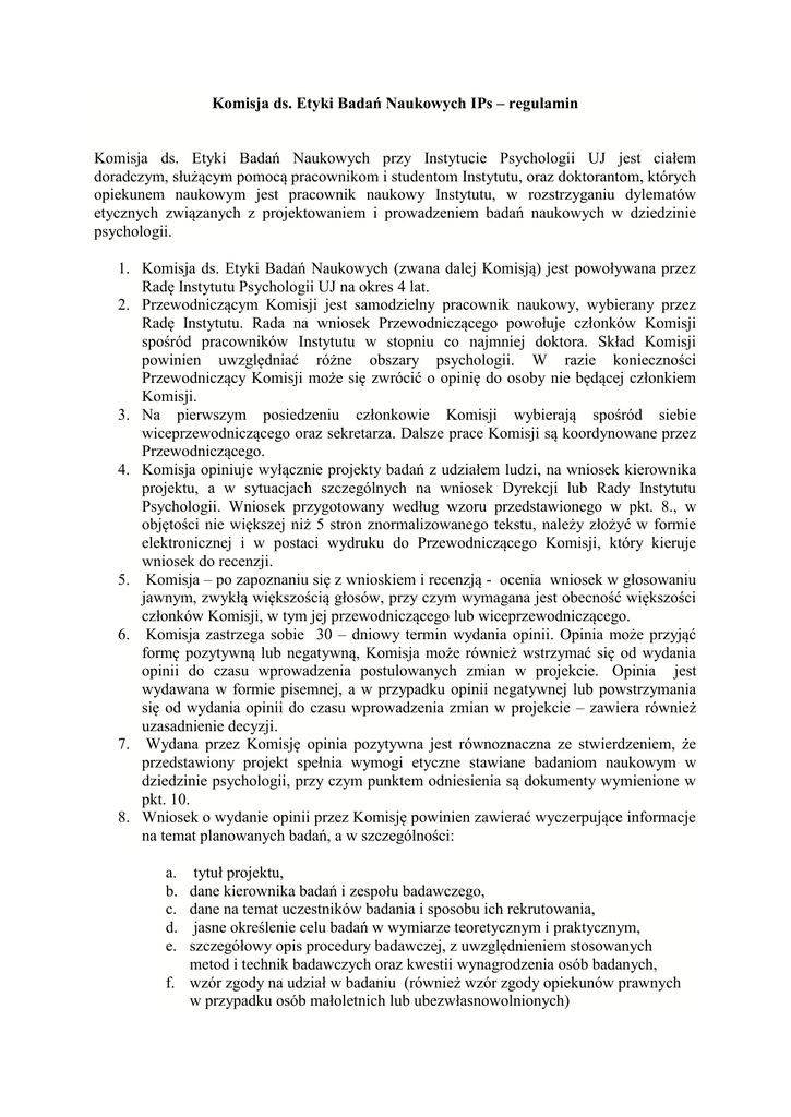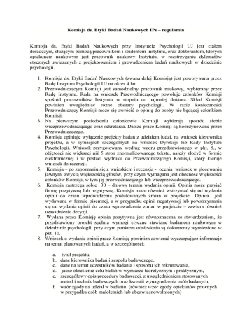 Komisja ds. Etyki Badań Naukowych IPs – regulamin Komisja ds. Etyki Badań Naukowych przy Instytucie Psychologii UJ jest ciałem doradczym, służącym pomocą pracownikom i studentom Instytutu, oraz doktorantom, których opiekunem naukowym jest pracownik naukowy Instytutu, w rozstrzyganiu dylematów etycznych związanych z projektowaniem i prowadzeniem badań naukowych w dziedzinie psychologii. 1. Komisja ds. Etyki Badań Naukowych (zwana dalej Komisją) jest powoływana przez Radę Instytutu Psychologii UJ na okres 4 lat. 2. Przewodniczącym Komisji jest samodzielny pracownik naukowy, wybierany przez Radę Instytutu. Rada na wniosek Przewodniczącego powołuje członków Komisji spośród pracowników Instytutu w stopniu co najmniej doktora. Skład Komisji powinien uwzględniać różne obszary psychologii. W razie konieczności Przewodniczący Komisji może się zwrócić o opinię do osoby nie będącej członkiem Komisji. 3. Na pierwszym posiedzeniu członkowie Komisji wybierają spośród siebie wiceprzewodniczącego oraz sekretarza. Dalsze prace Komisji są koordynowane przez Przewodniczącego. 4. Komisja opiniuje wyłącznie projekty badań z udziałem ludzi, na wniosek kierownika projektu, a w sytuacjach szczególnych na wniosek Dyrekcji lub Rady Instytutu Psychologii. Wniosek przygotowany według wzoru przedstawionego w pkt. 8., w objętości nie większej niż 5 stron znormalizowanego tekstu, należy złożyć w formie elektronicznej i w postaci wydruku do Przewodniczącego Komisji, który kieruje wniosek do recenzji. 5. Komisja – po zapoznaniu się z wnioskiem i recenzją - ocenia wniosek w głosowaniu jawnym, zwykłą większością głosów, przy czym wymagana jest obecność większości członków Komisji, w tym jej przewodniczącego lub wiceprzewodniczącego. 6. Komisja zastrzega sobie 30 – dniowy termin wydania opinii. Opinia może przyjąć formę pozytywną lub negatywną, Komisja może również wstrzymać się od wydania opinii do czasu wprowadzenia postulowanych zmian w projekcie. Opinia jest wydawana w formie pisemnej, a w przypadku opinii negatywnej lub powstrzymania się od wydania opinii do czasu wprowadzenia zmian w projekcie – zawiera również uzasadnienie decyzji. 7. Wydana przez Komisję opinia pozytywna jest równoznaczna ze stwierdzeniem, że przedstawiony projekt spełnia wymogi etyczne stawiane badaniom naukowym w dziedzinie psychologii, przy czym punktem odniesienia są dokumenty wymienione w pkt. 10. 8. Wniosek o wydanie opinii przez Komisję powinien zawierać wyczerpujące informacje na temat planowanych badań, a w szczególności: a. tytuł projektu, b. dane kierownika badań i zespołu badawczego, c. dane na temat uczestników badania i sposobu ich rekrutowania, d. jasne określenie celu badań w wymiarze teoretycznym i praktycznym, e. szczegółowy opis procedury badawczej, z uwzględnieniem stosowanych metod i technik badawczych oraz kwestii wynagrodzenia osób badanych, f. wzór zgody na udział w badaniu (również wzór zgody opiekunów prawnych w przypadku osób małoletnich lub ubezwłasnowolnionych) g. wzór instrukcji dla uczestników badania, h. ocenę ryzyka dla osób uczestniczących w badaniu, szczególnie zaś ryzyka dyskomfortu, cierpienia, obniżenia samooceny, podważenia zaufania do psychologii i psychologów. Należy uwzględnić również inne koszty ponoszone przez osoby uczestniczące w badaniu (np. znaczne koszty czasowe, wysiłek fizyczny itp.), i. zasady upubliczniania wyników badań, zasady przekazywania uczestnikom badania informacji zwrotnej o wynikach oraz sposoby zapewnienia anonimowości udziału w badaniu, j. oświadczenie, że badania mają charakter autorski. 9. Jeśli procedura badawcza przewiduje odstąpienie od zalecanych standardów (np. brak starania o zgodę osób badanych lub stosowanie instrukcji maskującej), należy przedstawić uzasadnienie wyboru takiej procedury oraz projekt działań, mających na celu minimalizację możliwych niekorzystnych skutków udziału w tak prowadzonym badaniu. 10. Komisja działa w oparciu o uznawane w środowisku zawodowym standardy etyczne. Do czasu wejścia w życie wymaganych regulacji prawnych (Ustawa o Zawodzie Psychologa) Komisja będzie kierować się Kodeksem Etyczno-Zawodowym Psychologa Polskiego Towarzystwa Psychologicznego, odwołując się również do European Federation of Psychology Associations Meta-Code of Ethics oraz Universal Declaration of Ethical Principles for Psychologists. Będzie się odwoływać również do dokumentu „Dobre Obyczaje w Nauce” oraz Kodeksu Etyki Pracownika Naukowego Polskiej Akademii Nauk. Komisja ds. Etyki Badań Naukowych – skład Przewodnicząca: prof. dr hab. Władysława Pilecka Wiceprzewodnicząca: dr Katarzyna Sikora Sekretarz: dr Katarzyna Prochwicz Członkowie: dr Przemysław Bąbel, dr hab. Marta Białecka-Pikul, dr hab. Jarosław Orzechowski, dr Magdalena Śmieja-Nęcka, dr hab. Eligiusz Wronka [niniejszy regulamin został zatwierdzony przez Radę Instytutu na posiedzeniu w dniu 21.11.2013]