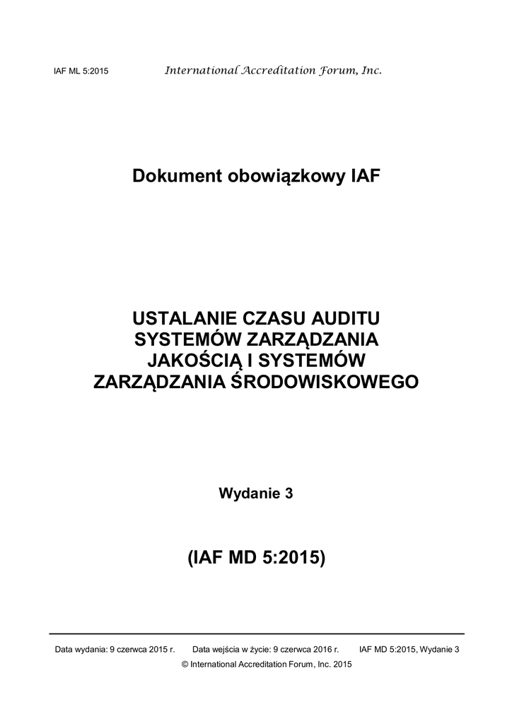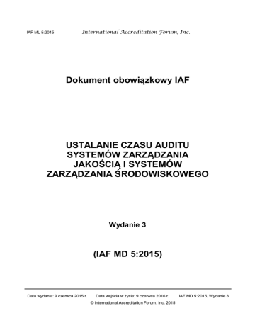 IAF ML 5:2015 International Accreditation Forum, Inc. Dokument obowiązkowy IAF USTALANIE CZASU AUDITU SYSTEMÓW ZARZĄDZANIA JAKOŚCIĄ I SYSTEMÓW ZARZĄDZANIA ŚRODOWISKOWEGO Wydanie 3 (IAF MD 5:2015) Data wydania: 9 czerwca 2015 r. Data wejścia w życie: 9 czerwca 2016 r. © International Accreditation Forum, Inc. 2015 IAF MD 5:2015, Wydanie 3 IAF MD 5:2015 Wydanie 3 International Accreditation Forum, Inc. Ustalanie czasu auditu systemów zarządzania jakością i systemów zarządzania środowiskowego Strona 2 z 21 International Accreditation Forum, Inc. (IAF) ułatwia handel i wspiera prawodawców poprzez międzynarodowe porozumienie dotyczące wzajemnego uznawania między jednostkami akredytującymi (ABs) mające na celu globalne uznawanie wyników wydawanych przez jednostki oceniające zgodność (CABs) akredytowane przez członków IAF. Akredytacja zmniejsza ryzyko przedsiębiorstw i ich klientów zapewniając, że akredytowane jednostki oceniające zgodność (CABs) są kompetentne do wykonywania pracy, jakiej podejmują się w zakresie posiadanej akredytacji. Wymaga się, aby jednostki akredytujące (ABs) będące członkami IAF i akredytowane przez nie CABs prowadziły działalność zgodnie z właściwymi normami międzynarodowymi oraz mającymi zastosowanie dokumentami IAF w celu spójnego stosowania tych norm. Jednostki akredytujące będące sygnatariuszami Porozumienia o Wielostronnym Uznawaniu IAF (IAF MLA) są regularnie poddawane ocenie równorzędnej, prowadzonej przez wyznaczone zespoły, w celu zapewnienia zaufania do funkcjonowania ich programów akredytacji. Struktura i zakres IAF MLA są szczegółowo przedstawione w dokumencie IAF PR 4 – Structure of IAF MLA and Endorsed Normative Documents. Struktura IAF MLA ma pięć poziomów: Poziom 1 określa kryteria obowiązkowe ISO/IEC 17011, które mają zastosowanie do wszystkich ABs. Połączenie działania (działań) Poziomu 2 oraz odpowiedniego(-ich) dokumentu(-ów) normatywnego(-ych) Poziomu 3 jest określane jako główny zakres MLA, a połączenie dokumentów normatywnych Poziomu 4 (jeżeli ma to zastosowanie) i Poziomu 5 jest określane jako podzakres MLA. Główny zakres MLA obejmuje działania, np. certyfikację wyrobów, oraz związane dokumenty obowiązkowe, np. ISO/IEC 17065. Atestacje wykonane przez CABs na poziomie głównego zakresu są uznawane jako równie wiarygodne. Podzakres MLA obejmuje wymagania dotyczące oceny zgodności, np. ISO 9001, oraz specyficzne wymagania programu, jeżeli ma to zastosowanie, np. ISO TS 22003. Atestacje wykonane przez CABs na poziomie podzakresu są uznawane jako równoważne. IAF MLA daje zaufanie niezbędne dla akceptacji wyników oceny zgodności przez rynek. Atestacja wydana w zakresie IAF MLA przez jednostkę, która jest akredytowana przez AB będącą sygnatariuszem IAF MLA, może być uznawana na świecie, co ułatwia handel międzynarodowy. Data wydania: 9 czerwca 2015 r. Data wejścia w życie: 9 czerwca 2016 r. © International Accreditation Forum, Inc. 2015 IAF MD 5:2015 wydanie 3 IAF MD 5:2015 Wydanie 3 International Accreditation Forum, Inc. Ustalanie czasu auditu systemów zarządzania jakością i systemów zarządzania środowiskowego Strona 3 z 21 SPIS TREŚCI 0 WPROWADZENIE ...................................................................................................................... 5 1 DEFINICJE ................................................................................................................................. 5 2 ZASTOSOWANIE ....................................................................................................................... 7 3 METODYKA USTALANIA CZASU AUDITU SYSTEMÓW ZARZĄDZANIA ................................. 8 4 AUDITY CERTYFIKACYJNE W RAMACH CERTYFIKACJI SYSTEMÓW ZARZĄDZANIA (ETAP 1. PLUS ETAP 2.) ................................................................................................................. 10 5 NADZÓR................................................................................................................................... 11 6 PONOWNA CERTYFIKACJA.................................................................................................... 11 7 ZINDYWIDUALIZOWANE CYKLE CERTYFIKACJI (DRUGI ORAZ KOLEJNE)........................ 11 8 CZYNNIKI DO KORYGOWANIA CZASU AUDITU SYSTEMÓW ZARZĄDZANIA (QMS I EMS)11 9 ODDZIAŁY TYMCZASOWE...................................................................................................... 13 10 CZAS AUDITU SYSTEMU ZARZĄDZANIA ORGANIZACJI WIELOODDZIAŁOWEJ ................ 13 11 NADZÓR NAD FUNKCJAMI LUB PROCESAMI DOSTARCZANYMI PRZEZ ORGANIZACJE ZEWNĘTRZNE (PODZLECANIE) .................................................................................................... 14 Załącznik A – SYSTEMY ZARZĄDZANIA JAKOŚCIĄ ...................................................................... 15 Załącznik B – SYSTEMY ZARZĄDZANIA ŚRODOWISKOWEGO ................................................... 18 Wydanie Nr 3 Opracowane przez: IAF Technical Committee Zatwierdzone przez: Członków IAF Data wydania: 9 czerwca 2015 r. Osoba do kontaktu: Elva Nilsen IAF Corporate Secretary Tel.: +1 613 454-8159 Email: [email protected] Data: 18 grudnia 2014 r. Data wejścia w życie: 9 czerwca 2016 r. Wprowadzenie do tłumaczenia: Oryginał publikacji: Determination of audit time of quality and environmental management systems, Issue 3 of 9 June 2015 Tłumaczenie: Polskie Centrum Akredytacji, 15.01.2016 r., www.pca.gov.pl Tekst tłumaczenia nie może być kopiowany w celu sprzedaży. Wersją oficjalną (rozstrzygającą) jest wersja w języku angielskim. Tekst tłumaczenia uzupełniono odsyłaczami zawierającymi przypisy PCA, które dodatkowo je objaśniają. Data wydania: 9 czerwca 2015 r. Data wejścia w życie: 9 czerwca 2016 r. © International Accreditation Forum, Inc. 2015 IAF MD 5:2015 wydanie 3 IAF MD 5:2015 Wydanie 3 Internation
