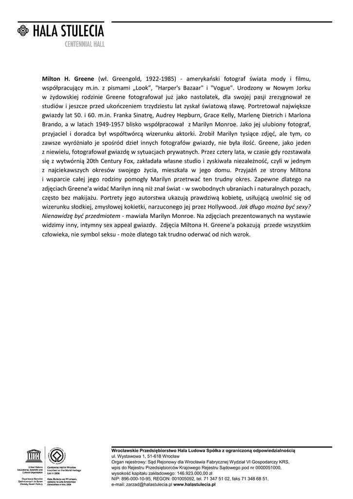 Milton H. Greene (wł. Greengold, 1922-1985) - amerykaoski fotograf świata mody i filmu, współpracujący m.in. z pismami „Look”, "Harper's Bazaar" i "Vogue". Urodzony w Nowym Jorku w żydowskiej rodzinie Greene fotografował już jako nastolatek, dla swojej pasji zrezygnował ze studiów i jeszcze przed ukooczeniem trzydziestu lat zyskał światową sławę. Portretował największe gwiazdy lat 50. i 60. m.in. Franka Sinatrę, Audrey Hepburn, Grace Kelly, Marlenę Dietrich i Marlona Brando, a w latach 1949-1957 blisko współpracował z Marilyn Monroe. Jako jej ulubiony fotograf, przyjaciel i doradca był współtwórcą wizerunku aktorki. Zrobił Marilyn tysiące zdjęd, ale tym, co zawsze wyróżniało je spośród dzieł innych fotografów gwiazdy, nie była ilośd. Greene, jako jeden z niewielu, fotografował gwiazdę w sytuacjach prywatnych. Przez cztery lata, w czasie gdy rozstawała się z wytwórnią 20th Century Fox, zakładała własne studio i zyskiwała niezależnośd, czyli w jednym z najciekawszych okresów swojego życia, mieszkała w jego domu. Przyjaźo ze strony Miltona i wsparcie całej jego rodziny pomogły Marilyn przetrwad ten trudny okres. Zapewne dlatego na zdjęciach Greene'a widad Marilyn inną niż znał świat - w swobodnych ubraniach i naturalnych pozach, często bez makijażu. Portrety jego autorstwa ukazują prawdziwą kobietę, usiłującą uwolnid się od wizerunku słodkiej, zmysłowej kokietki, narzuconego jej przez Hollywood. Jak długo można być sexy? Nienawidzę być przedmiotem - mawiała Marilyn Monroe. Na zdjęciach prezentowanych na wystawie widzimy inny, intymny sex appeal gwiazdy. Zdjęcia Miltona H. Greene'a pokazują przede wszystkim człowieka, nie symbol seksu - może dlatego tak trudno oderwad od nich wzrok. Wrocławskie Przedsiębiorstwo Hala Ludowa Spółka z ograniczoną odpowiedzialnością ul. Wystawowa 1, 51-618 Wrocław Organ rejestrowy: Sąd Rejonowy dla Wrocławia Fabrycznej Wydział VI Gospodarczy KRS, wpis do Rejestru Przedsiębiorców Krajowego Rejestru Sądowego pod nr 0000051000, wysokość kapitału zakładowego: 146.923.000,00 zł NIP: 896-000-10-95, REGON: 001005092, tel. 71 347 51 02, faks 71 348 68 51, e-mail: [email protected] www.halastulecia.pl