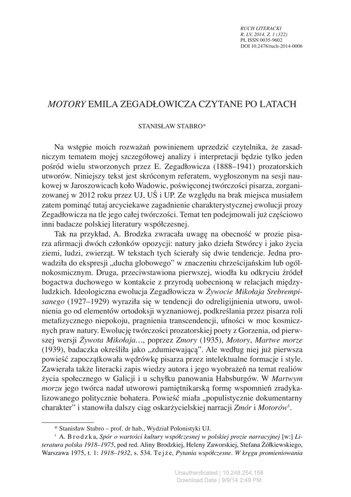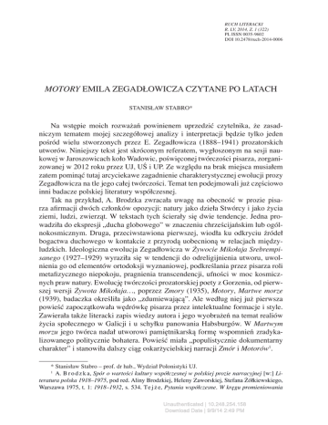 RUCH LITERACKI R. LV, 2014, Z. 1 (322) PL ISSN 0035-9602 DOI 10.2478/ruch-2014-0006 MOTORY EMILA ZEGADŁOWICZA CZYTANE PO LATACH Stanisław Stabro* Na wstępie moich rozważań powinienem uprzedzić czytelnika, że zasadniczym tematem mojej szczegółowej analizy i interpretacji będzie tylko jeden pośród wielu stworzonych przez E. Zegadłowicza (1888–1941) prozatorskich utworów. Niniejszy tekst jest skróconym referatem, wygłoszonym na sesji naukowej w Jaroszowicach koło Wadowic, poświęconej twórczości pisarza, zorganizowanej w 2012 roku przez UJ, UŚ i UP. Ze względu na brak miejsca musiałem zatem pominąć tutaj arcyciekawe zagadnienie charakterystycznej ewolucji prozy Zegadłowicza na tle jego całej twórczości. Temat ten podejmowali już częściowo inni badacze polskiej literatury współczesnej. Tak na przykład, A. Brodzka zwracała uwagę na obecność w prozie pisarza afirmacji dwóch członków opozycji: natury jako dzieła Stwórcy i jako życia ziemi, ludzi, zwierząt. W tekstach tych ścierały się dwie tendencje. Jedna prowadziła do ekspresji „ducha globowego” w znaczeniu chrześcijańskim lub ogólnokosmicznym. Druga, przeciwstawiona pierwszej, wiodła ku odkryciu źródeł bogactwa duchowego w kontakcie z przyrodą uobecnioną w relacjach międzyludzkich. Ideologiczna ewolucja Zegadłowicza w Żywocie Mikołaja Srebrempisanego (1927–1929) wyraziła się w tendencji do odreligijnienia utworu, uwolnienia go od elementów ortodoksji wyznaniowej, podkreślania przez pisarza roli metafizycznego niepokoju, pragnienia transcendencji, ufności w moc kosmicznych praw natury. Ewolucję twórczości prozatorskiej poety z Gorzenia, od pierwszej wersji Żywota Mikołaja…, poprzez Zmory (1935), Motory, Martwe morze (1939), badaczka określiła jako „zdumiewającą”. Ale według niej już pierwsza powieść zapoczątkowała wędrówkę pisarza przez intelektualne formacje i style. Zawierała także literacki zapis wiedzy autora i jego wyobrażeń na temat realiów życia społecznego w Galicji i u schyłku panowania Habsburgów. W Martwym morzu jego twórca nadał utworowi pamiętnikarską formę wspomnień zradykalizowanego politycznie bohatera. Powieść miała „populistycznie dokumentarny charakter” i stanowiła dalszy ciąg oskarżycielskiej narracji Zmór i Motorów. * Stanisław Stabro – prof. dr hab., Wydział Polonistyki UJ. A. B r o d z k a, Spór o wartości kultury współczesnej w polskiej prozie narracyjnej [w:] Literatura polska 1918–1975, pod red. Aliny Brodzkiej, Heleny Zaworskiej, Stefana Żółkiewskiego, Warszawa 1975, t. 1: 1918–1932, s. 534. Te j ż e, Pytania współczesne. W kręgu promieniowania Unauthenticated | 10.248.254.158 Download Date | 9/9/14 2:49 PM 68 Stanisław Stabro J. Kwiatkowski porównując Żywot Mikołaja Srebrempisanego ze Zmorami, eksponującymi wątki fabularne związane z problemami dojrzewania seksualnego i inicjacji bohatera, zwracał uwagę na przemianę świętofranciszkańskiego Zegadłowicza w antyklerykała i libertyna. Badacz ten podkreślał, że pisarz, podobnie jak Strug, u schyłku swojej twórczości rozluźnił związki z ekspresjonizmem, w Martwym morzu dominował bowiem turpistyczny naturalizm „służący nieepatowaniu seksualnymi drastycznościami, lecz wydobyciu całego marazmu i beznadziejności życia „szarego człowieka na prowincji”. Wiele uwagi tym zagadnieniom poświęcił autor monografii twórczości E. Zegadłowicza – K. Szymanowski. Podkreślił on związki prozy poety z popularnym w dwudziestoleciu modelem powieści autobiograficznej i edukacyjnej. Proza autora Uśmiechu… przypominająca, według tego badacza, prozę modernizmu, charakteryzowała się animizacją górskiej flory, panpsychizmem, antropomorfizacją. Styl odległy od mowy potocznej nacechowany był zrytmizowanym tokiem zdania, inwersją szyku wyrazów, nagromadzeniem metafor i porównań, superrelatywizmem, skłonnością do wykrzykników. Brakiem ekonomii w posługiwaniu się słowem, spiętrzeniem synonimów i pleonazmów. Autor monografii podkreślał istotny w prozie Zegadłowicza żywioł kryptoautobiografizmu, występujący w różnych odmianach oraz akcenty pacyfistyczne (m.in. w Martwym morzu). Dotyczy to również mocno manifestowanego przez narratora w świecie przedstawionym, panerotyzmu. Ostatnim, odnalezionym w 1965 roku, tworem prozatorskim Zegadłowicza była miłosna powieść epistolarna Progi, pisana w latach 1937–1939. Według monografisty, Zegadłowicz cofnął się w tym dziele do anachronicznych w roku 1939 wzorców stylistycznych i fabularnych z okresu Zdroju i Młodej Polski, do filozoficznego irracjonalizmu, symbolizmu i wizyjności. Ostatnia powieść pisarza charakteryzowała się ubóstwem problematyki i melodramatycznością zakończenia. Co więcej, Progi kwestionowały obraz artysty, przechodzącego na lewą stronę barykady, co sugerowało Martwe morze. W Progach widoczne były, między innymi, akcenty antysemickie, egotyzm, introwertyzm bohaterów, dystans wobec zagadnień społecznych i politycznych, aprobata freudyzmu. A skonstruowany pomiędzy autobiografizmem a kryptoautobiografizmem świat przedstawiony ekspresjonizmu [w:] Literatura polska 1918–1975, pod red. Aliny Brodzkiej i Stefana Żółkiewskiego, Warszawa 1993, t. 2: 1933–1944, s. 570, 572. J. K w i a t k o w s k i, Literatura Dwudziestolecia, Warszawa 1990, s. 244–245. K. S z y m a n o w s k i, Kształt „Uśmiechu” [w:] t e g o ż, Narcyz. Rzecz o Zegadłowiczu – powieściopisarzu, Kraków 1986, s. 51. Por. M. W ó j c i k, Pan na Gorzeniu. Życie i twórczość Emila Zegadłowicza, Kielce 2005, s. 652. K. S z y m a n o w s k i, Portret artysty z czasów młodości („Zmory”). Geneza powieści [w:] t e g o ż, Narcyz…, dz. cyt., s. 98. Por. S. S t a b r o, Małe ojczyzny Emila Zegadłowicza [w:] t e g o ż, Od Emila Zegadłowicza do Andrzeja Bobkowskiego. O prozie polskiej XX wieku, Kra