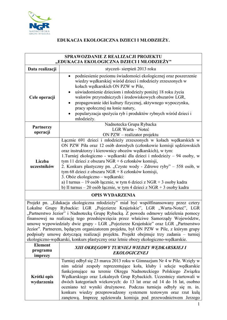 EDUKACJA EKOLOGICZNA DZIECI I MŁODZIEŻY. SPRAWOZDANIE Z REALIZACJI PROJEKTU „EDUKACJA EKOLOGICZNA DZIECI I MŁODZIEŻY” styczeń- sierpień 2013 roku Data realizacji Cele operacji Partnerzy operacji Liczba uczestników podniesienie poziomu świadomości ekologicznej oraz poszerzenie wiedzy wędkarskiej wśród dzieci i młodzieży zrzeszonych w kołach wędkarskich ON PZW w Pile, uświadomienie dzieciom i młodzieży poniżej 18 roku życia walorów przyrodniczych i środowiskowych obszarów LGR, propagowanie idei kultury fizycznej, aktywnego wypoczynku, pracy społecznej na łonie natury, popularyzacja spożycia ryb i produktów rybnych wśród dzieci i młodzieży. Nadnotecka Grupa Rybacka LGR Warta – Noteć ON PZW – realizator projektu Łącznie 691 dzieci i młodzieży zrzeszonych w kołach wędkarskich w ON PZW Piła oraz 12 osób dorosłych (członkowie komisji sędziowskich oraz instruktorzy i kierownicy obozów wędkarskich), w tym: 1.Turniej ekologiczno - wędkarski dla dzieci i młodzieży – 94 osoby, w tym 11 dzieci z obszaru NGR + 6 członków komisji, 2. Konkurs plastyczny pn. „Czyste wody - Zdrowe ryby” – 558 osób, w tym 68 dzieci z obszaru NGR + 8 członków komisji, 3. Obóz ekologiczno – wędkarski: a) I turnus – 19 osób łącznie, w tym 6 dzieci z NGR + 3 osoby kadra b) II turnus – 20 osób łącznie, w tym 4 dzieci z NGR + 3 osoby kadra OPIS WYDARZENIA Projekt pn. „Edukacja ekologiczna młodzieży” miał być współfinansowany przez cztery Lokalne Grupy Rybackie: LGR „Pojezierze Krajeńskie”, LGR „Warta-Noteć”, LGR „Partnerstwo Jezior” i Nadnotecką Grupę Rybacką. Z powodu odmowy udzielenia pomocy finansowej na realizację tego przedsięwzięcia przez właściwe Samorządy Województw, umowę wypowiedziały dwie grupy - LGR „Pojezierze Krajeńskie” oraz LGR „Partnerstwo Jezior”. Partnerem, będącym organizatorem projektu, był ON PZW w Pile, z którym grupy podpisały umowę dotyczącą realizacji projektu. Projekt obejmuje trzy zadania – turniej ekologiczno-wędkarski, konkurs plastyczny oraz letnie obozy ekologiczno-wędkarskie. Element XIII OKRĘGOWY TURNIEJ WIEDZY WĘDKARSKIEJ I programu EKOLOGICZNEJ imprezy Turniej odbył się 23 marca 2013 roku w Gimnazjum Nr 4 w Pile. Wzięły w nim udział zespoły reprezentujące koła, kluby i sekcje wędkarskie funkcjonujące na terenie Okręgu Nadnoteckiego Polskiego Związku Wędkarskiego oraz Lokalnych Grup Rybackich. Uczestnicy startowali w Krótki opis dwóch kategoriach wiekowych: do 13 lat oraz od 14 do 16 lat, osobno wydarzenia oceniano też wyniki drużynowe. Podczas turnieju odbyły się m. in. konkurs wiedzy przeprowadzony systemem testowym oraz rzut kulą zanętową. Imprezę sędziowała komisja pod przewodnictwem Jerzego 1 W jaki sposób element imprezy przyczynił się do realizacji celu projektu? Niedźwiedzkiego, w składzie: Wojciech Turowski, Andrzej Sadkowski, Henryk Laszczkowski, Bogdan Osiński i Józef Jeziorski. W kategorii do lat 13 w konkursie wystartowało 53 uczestników. Pierwsze miejsce zajął Kacper Gurda, reprezentujący Zespół Szkół nr 1 w Pile „Gwda” 2. Tuż za nim uplasował się Piotr Frąk ze Szkoły Podstawowej w Jastrowiu, a trzecie miejsce zajęła Zuzanna Adamek – Zespół Szkół nr 1 „Gwda” 2. Dwa miejsca na podium zawodników z ZS nr 1 w Pile „Gwda” 2 dały tej drużynie pierwsze miejsce w klasyfikacji zespołowej. Na kolejnych pozycjach uplasowały się zespoły ZS nr 1 „Gwda” 1 oraz Metalplastu Złotów. Kategorię wiekową 14-16 lat indywidualnie wygrał Arkadiusz Szulc z Koła PZW Szamocin. Błażej Meler z Zespołu Szkół nr 1 „Gwda” 2 był drugim gimnazjalistą na podium, miejsce trzecie zajęła Zuzanna Łyskanowska z drużyny Gimnazjum Wyrzysk 3. W starszej grupie rywalizację drużynową wygrał zespół Koła PZW Szamocin, druga lokata przypadła Zespołowi Szkół nr 1 w Pile „Gwda” 2, na trzecim miejscu znalazł się zespół Gimnazjum Wyrzysk 1. Najlepsi zawodnicy i drużyny otrzymały pamiątkowe puchary, ale nagrody rzeczowe dostali wszyscy uczestnicy konkursu. Dzięki realizacji turnieju udało się rozpropagować wśród dzieci i młodzieży z obszarów LGR wiedzę dot. ekologii, wędkarstwa, środowiska wodnego. Działania te uświadomiły młodym ludziom, będącym uczestnikami projektu, że mieszkają w dobrym i przyjaznym regionie, w którym warto żyć, pracować, inwestować, rozwijać się. Dodatkowo poprzez zadanie dotyczące rzutu kulą zanętową utrwalone zostały praktyczne umiejętności związane z wędkarstwem. Dokumentacja fotograficzna 2 Element programu imprezy KONKURS PLASTYCZNY „CZYSTE WODY – ZDROWE RYBY” Kolejnym wydarzeniem realizowanym w ramach projektu „Edukacja ekologiczna dzieci i młodzieży” był konkurs plastyczny „Czyste wody – zdrowe ryby”. W konkursie tym mogła brać udział młodzież ze szkół podstawowych i gimnazjów. Prace napływały w okresie od 1 stycznia do 15 maja 2013 r, a rozwiązanie konkursu miało miejsce 11 czerwca, kiedy to odbyły się obrady specjalnie powołanej komisji oceniającej. Krótki opis wydarzenia Do konkursu zgłoszono aż 558 prac, a oceniano je w trzech kategoriach wiekowych: do 10 lat, 11-13 lat i 14-16 lat. Prace mogły być składane zarówno indywidualnie jak i przez grupy składające się maksymalnie z 3 osób. Każdy z uczestników mógł złożyć maksymalnie 3 prace. W konkursie tym wzięło udział około 100 osób. Wśród najmłodszych autorów pierwsze miejsce komisja przyznała Zuzannie Świerkowskiej, a drugie Mateuszowi Kosteckiemu – oboje z Budzynia, trzecia lokata przypadła Mateuszowi Sikorze z Drawska. Kategorię wiekową od 11 do 13 lat wygrała Natalka Piernak z Recza, druga była Agnieszka Helak z Budzynia a na trzecim miejscu sklasyfikowano pracę Zuzanny Kostrzewskiej z Recza. W jaki sposób element imprezy przyczynił się do realizacji celu projektu? Wśród młodzie
