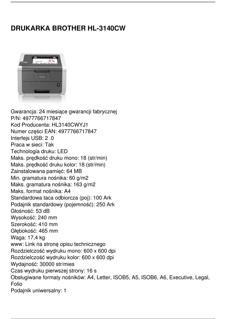 DRUKARKA BROTHER HL-3140CW Gwarancja: 24 miesiące gwarancji fabrycznej P/N: 4977766717847 Kod Producenta: HL3140CWYJ1 Numer części EAN: 4977766717847 Interfejs USB: 2 .0 Praca w sieci: Tak Technologia druku: LED Maks. prędkość druku mono: 18 (str/min) Maks. prędkość druku kolor: 18 (str/min) Zainstalowana pamięć: 64 MB Min. gramatura nośnika: 60 g/m2 Maks. gramatura nośnika: 163 g/m2 Maks. format nośnika: A4 Standardowa taca odbiorcza (poj): 100 Ark Podajnik standardowy (pojemność): 250 Ark Głośność: 53 dB Wysokość: 240 mm Szerokość: 410 mm Głębokość: 465 mm Waga: 17,4 kg www: Link na stronę opisu technicznego Rozdzielczość wydruku mono: 600 x 600 dpi Rozdzielczość wydruku kolor: 600 x 600 dpi Wydajność: 30000 str/mies Czas wydruku pierwszej strony: 16 s Obsługiwane formaty nośników: A4, Letter, ISOB5, A5, ISOB6, A6, Executive, Legal, Folio Podajnik uniwersalny: 1 Toner startowy czarny (wydajność): 1000 Ark Toner startowy CMY (wydajność): 1000 Ark Materiały eksploatacyjne: TN-241BK, TN-241C/M/Y, TN-245 C/M/Y, DR-241CL, BU-220CL, WT-220CL P/N:: 4977766717847 Numer części EAN:: 4977766717847 Interfejs Paralell: Nie Interfejs Ethernet: Nie Interfejs inny: karta sieci bezprzewodowej 802.11b/g/n Obsługa DOS: Nie Druk dwustronny (Duplex): Opcja Dodatkowy port USB: Nie Nadruk na płytach CD,DVD,BD: Nie Cena: 892.55 PLN Powered by TCPDF (www.tcpdf.org)