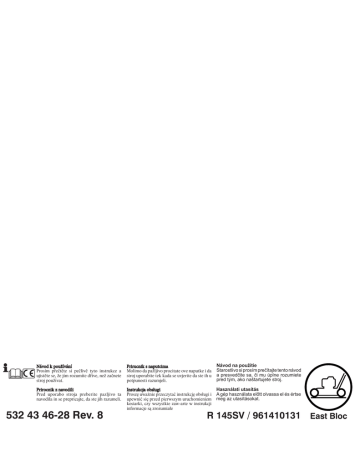 Návod k používání Prosím pøeètìte si peèlivì tyto instrukce a ujistìte se, že jím rozumíte døíve, než zaènete stroj používat. Prirucnik s naputcima Molimo da pažljivo procitate ove naputke i da stroj uporabite tek kada se uvjerite da ste ih u potpunosti razumjeli. Návod na použitie Starostlivo si prosím prečítajte tento návod a presvedčite sa, či mu úplne rozumiete pred tým, ako naštartujete stroj. Prirocnik z navodili Pred uporabo stroja preberite pazljivo ta navodila in se prepricajte, da ste jih razumeli. Instrukcja obs³ugi Proszê uwa¿nie przeczytaæ instrukcjê obs³ugi i upewniæ siê przed pierwszym uruchomieniem kosiarki, czy wszystkie zaw-arte w instrukcji informacje s¹ zrozumia³e Használati utasítás A gép használata előtt olvassa el és értse meg az utasításokat. 532 43 46-28 Rev. 8 R 145SV / 961410131 East Bloc SADRŽAJ STRANA SPIS TRE TREŚCI CI PRZEPISY BEZPIECZEÑSTWA .......................... 3-10 OPIS ZESPO£ÓW.................................................... 11 INFORMACJE OGÓLNE......................................... 12 MONTAŻ............................................................13-15 USTAWIENIA ....................................................15-16 URUCHAMIANIE I ZATRZYMYWANIE ........................................16-18 UŻYTKOWANIE................................................18-19 OBS£UGA ..........................................................20-23 INFORMACJE OGÓLNE......................................... 23 SIGURNOSNI PROPISI ....................................... 3-10 TEHNIČNI PODACI ................................................11 PREGLED................................................................12 SKLAPANJE ..................................................... 13-15 PODEŠAVANJE .................................................. 15-16 POKRETANJE I ZAUSTAVLJANJE ................... 16-18 UPORABA ......................................................... 18-19 ODRŽAVANJE ................................................... 20-23 OPĆE INFORMACIJE .............................................23 OBSAH STR. STRANA OBSAH STRANA BEZPEČNOSTNÍ POKYNY ................................ 3-10 BEZPEČNOSTNÉ POKYNY ............................... 3-10 TECHNICKÉ ÚDAJE ..............................................11 TECHNICKÉ ÚDAJE ..............................................11 PŘEHLED................................................................12 PREHĽAD ..............................................................12 SESTAVENÍ ....................................................... 13-15 MONTÁŽ........................................................... 13-15 NASTAVENÍ ...................................................... 15-16 NASTAVENIA .................................................... 15-16 SPUŠTĚNÍ A VYPNUTÍ .................................... 16-18 ŠTART A STOP ................................................. 16-18 POUŽITÍ ............................................................ 18-19 POUŽITIE.......................................................... 18-19 ÚDRŽBA............................................................ 20-23 ÚDRŽBA............................................................ 20-23 OBECNÉ INFORMACE ...........................................23 VŠEOBECNÉ INFORMÁCIE ..................................23 VSEBINA TARTALOM STRAN CÌMOLDAL VARNOSTNI PREDPISI....................................... 3-10 BIZTONSÁGI ELŐÍRÁSOK ................................ 3-10 TEHNIČNI PODATKI ..............................................11 TECHNIKAI ADATOK............................................11 PREGLED................................................................12 ÁTTEKINTÈS .........................................................12 SESTAVLJANJE ................................................. 13-15 ÖSSZESZERELÈS ............................................. 13-15 NASTAVITVE .................................................... 15-16 BEÁLLÍTÁS ...................................................... 15-16 ZAGON IN IZKLOP .......................................... 16-18 BEINDÍTÁS ÈS KIKAPCSOLÁS....................... 16-18 UPORABA ......................................................... 18-19 HASZNÁLAT .................................................... 18-19 VZDRŽEVANJE ................................................. 20-23 KARBANTARTÁS ............................................. 20-23 SPLOŠNE INFORMACIJE .......................................23 ÁLTALÁNOS INFORMÁCIÓK................................23 Manufactured by: Husqvarna AB SE-561 82 Huskvarna, Sweden Original Instructions in English, all others are translations. 2 Bezpečnostní pokyny pro ruční rotační sekačka na trávu DLEŽITÉ: Tato traktorová sekačka dokáže vážně poranit končetiny a odmršt’ovat předměty. Nedodržení následujících bezpečnostních pokynů může mít za následek vážná nebo smrtelná poranění. I. Školení – Průprava • Pečlivě si přečtěte instrukce. Seznamte se s ovládacími prvky a správným použitím stroje. • Nikdy nedovolte dětem, nebo osobám, které nebyly seznámeny s těmito instrukcemi, aby použily sekačku. Sekačku nesmí obsluhovat osoby mladší 18 let. • Nikdy nesekejte, pokud se v blízkosti pohybují lidé, zejména dětí a domácí zvířata. • Mějte vždy na paměti, že obsluha stroje nebo uživatel, je odpovědný za nehody nebo za rizika, způsobené jiným osobám nebo na jejich majetku. II. Příprava • Při sekání vždy noste pevnou obuv a dlouhé kalhoty. Sekačku nepoužívejte, pokud jste bosí nebo v sandálech. • Pečlivě zkontrolujte pracovní plochu a odstraňte z ní všechny předměty, které by mohly být odmrštěny strojem. • VAROVÁNÍ – Benzin je vysoce zápalný. - Skladujte palivo v nádobách k tomu určených. - Palivo doplňujte pouze ve