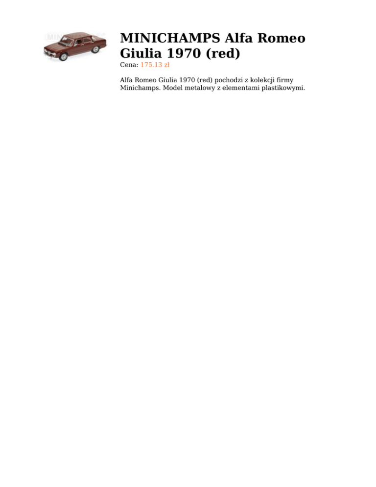 MINICHAMPS Alfa Romeo Giulia 1970 (red) Cena: 175.13 zł Alfa Romeo Giulia 1970 (red) pochodzi z kolekcji firmy Minichamps. Model metalowy z elementami plastikowymi.