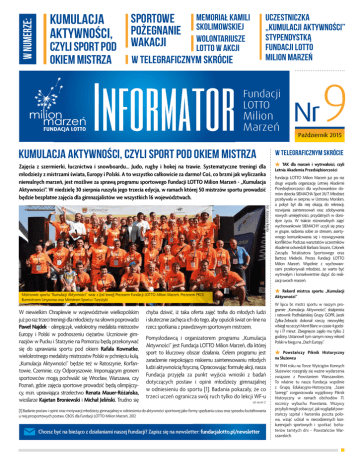 w numerze: Kumulacja Aktywności, czyli sport pod okiem mistrza Sportowe pożegnanie wakacji Uczestniczka „Kumulacji Aktywności” stypendystką Fundacji LOTTO Milion Marzeń Memoriał kamili Skolimowskiej Wolontariusze Lotto w akcji w telegraficznym skrócie Informator Fundacji LOTTO Milion Marzeń Nr 9 Październik 2015 Kumulacja Aktywności, czyli sport pod okiem mistrza W TELEGRAFICZNYM SKRÓCIE Zajęcia z szermierki, łucznictwa i snowboardu… Judo, rugby i hokej na trawie. Systematyczne treningi dla młodzieży z mistrzami świata, Europy i Polski. A to wszystko całkowicie za darmo! Coś, co brzmi jak wyliczanka nierealnych marzeń, jest możliwe za sprawą programu sportowego Fundacji LOTTO Milion Marzeń - „Kumulacja Aktywności”. W niedzielę 30 sierpnia ruszyła jego trzecia edycja, w ramach której 50 mistrzów sportu prowadzić będzie bezpłatne zajęcia dla gimnazjalistów we wszystkich 16 województwach. TAK dla marzeń i wytrwałości, czyli Letnia Akademia Przedsiębiorczości Fot. Katarzyna Rainka Rekord mistrza sportu „Kumulacji Aktywności” Mistrzowie sportu “Kumulacji Aktywności” wraz z (od lewej) Prezesem Fundacji LOTTO Milion Marzeń, Prezesem PKOl, Burmistrzem Ursynowa oraz Ministrem Sportu i Turystyki W niewielkim Chraplewie w województwie wielkopolskim już po raz trzeci treningi dla młodzieży na siłowni poprowadzi Paweł Najdek - olimpijczyk, wielokrotny medalista mistrzostw Europy i Polski w podnoszeniu ciężarów. Uczniowie gimnazjów w Pucku i Starzynie na Pomorzu będą przekonywać się do uprawiania sportu pod okiem Rafała Kownatke, wielokrotnego medalisty mistrzostw Polski w pchnięciu kulą. „Kumulacja Aktywności” będzie też w Ratoszynie, Korfantowie, Czerninie, czy Odporyszowie. Imponującym gronem sportowców mogą pochwalić się Wrocław, Warszawa, czy Poznań, gdzie zajęcia sportowe prowadzić będą olimpijczycy, m.in. uprawiająca strzelectwo Renata Mauer-Różańska, wioślarze Kajetan Broniewski i Michał Jeliński. Trudno się Fundacja LOTTO Milion Marzeń już po raz drugi wsparła organizację Letniej Akademii Przedsiębiorczości dla wychowanków domów dziecka SIEMACHA Spot 24/7. Młodzież przebywała w sierpniu w Ustroniu Morskim, a pobyt był dla niej okazją do rekreacji, rozwijania zainteresowań oraz zdobywania nowych umiejętności, przydatnych w dorosłym życiu. W trakcie różnorodnych zajęć wychowankowie SIEMACHY uczyli się pracy w grupie, radzenia sobie ze stresem, asertywnego komunikowania się i rozwiązywania konfliktów. Podczas warsztatów uczestników Akademii odwiedzili Barbara Sissons, Członek Zarządu Totalizatora Sportowego oraz Bartosz Mielecki, Prezes Fundacji LOTTO Milion Marzeń. Wspólnie z wychowawcami przekonywali młodzież, że warto być wytrwałym i konsekwentnie dążyć do realizacji swoich marzeń. chyba dziwić, iż taka oferta zajęć trafia do młodych ludzi i skutecznie zachęca ich do tego, aby opuścili świat on-line na rzecz spotkania z prawdziwym sportowym mistrzem. Pomysłodawcą i organizatorem programu „Kumulacja Aktywności” jest Fundacja LOTTO Milion Marzeń, dla której sport to kluczowy obszar działania. Celem programu jest zaradzenie niepokojąco niskiemu zainteresowaniu młodych ludzi aktywnością fizyczną. Opracowując formułę akcji, nasza Fundacja przyjęła za punkt wyjścia wnioski z badań dotyczących postaw i opinii młodzieży gimnazjalnej w odniesieniu do sportu [1]. Badania pokazały, że co trzeci uczeń ogranicza swój ruch tylko do lekcji WF-u cd. na str. 2 [1] Badanie postaw i opinii oraz motywacji młodzieży gimnazjalnej w odniesieniu do aktywności sportowej jako formy spędzania czasu oraz sposobu kształtowania u niej prosportowych postaw, CBOS dla Fundacji LOTTO Milion Marzeń, 2012 Chcesz być na bieżąco z działaniami naszej Fundacji? Zapisz się na newsletter: fundacjalotto.pl/newsletter W lipcu br. mistrz sportu w naszym programie „Kumulacja Aktywności”, skialpinista i ratownik Podhalańskiej Grupy GOPR, Jacek Żyłka-Żebracki dokonał rzeczy niezwykłej: wbiegł na szczyt Mont Blanc w czasie 4 godziny i 17 minut. Zbiegnięcie zajęło mu tylko 2 godziny. Ustanowił tym samym nowy rekord Polski w biegu na „Dach Europy”. Powstańczy Piknik Historyczny na Służewcu W 1944 roku na Torze Wyścigów Konnych Służewiec rozegrały się ważne wydarzenia związane z Powstaniem Warszawskim. To właśnie tu nasza Fundacja wspólnie z Grupą Edukacyjno-Historyczną „Szare Szeregi” zorganizowała wyjątkowy Piknik Historyczny w ramach obchodów 71. rocznicy wybuchu Powstania. Wszyscy przybyli mogli zobaczyć, jak wyglądał powstańczy szpital i harcerska poczta polowa, wziąć udział w niecodziennych konkurencjach sportowych i spotkać bohaterów tamtych dni – Powstańców Warszawskich. cja Kumulacji Aktywności to: 2. edycja Kumulacji Aktywności to: rupy ce na terenie wództw 1 649 gimnazjalistów uczestniczących w 2 900 zajęciach 72 grupyod września 2014 do kwietnia 2015 ćwiczące na terenie 1 649 gimnazjalistów 13 województw uczestniczących w 2 900 zajęciach od września 2014 do kwietnia 2015 161 Mistrzów Sportu prowadzących zajęcia wolontariuszy wspomagających Mistrzów w prowadzeniu zajęć Mistrzów Sportu 70 145prowadzących zajęcia Dzięki udziałowi w zajęciach… uczestników ma lepszą kondycję fizyczną 90% ma lepszy wygląd i figurę 67% ma więcej znajomych 75% 161 wolontariuszy wspomagających Mistrzów w prowadzeniu zajęć wspierających lokalnych instytucji i organizacji (szkoły, kluby sportowe, etc.) 145 wspierających lokalnych instytucji i organizacji (szkoły, kluby sportowe, etc.) 79% Dzięki udziałowi w zajęci i swoje możliwości bardziej wierzy w siebie uczestników ma lepszą kondycję fizyczną 85% 90% ma lepszy wygląd i figurę 67% bardziej lubi sport 72% bardziej lubi lekcje WF-u 55% ma więcej znajomych bardziej lubi sport 75% 89% 97% 72% ma lepsze samopoczuc