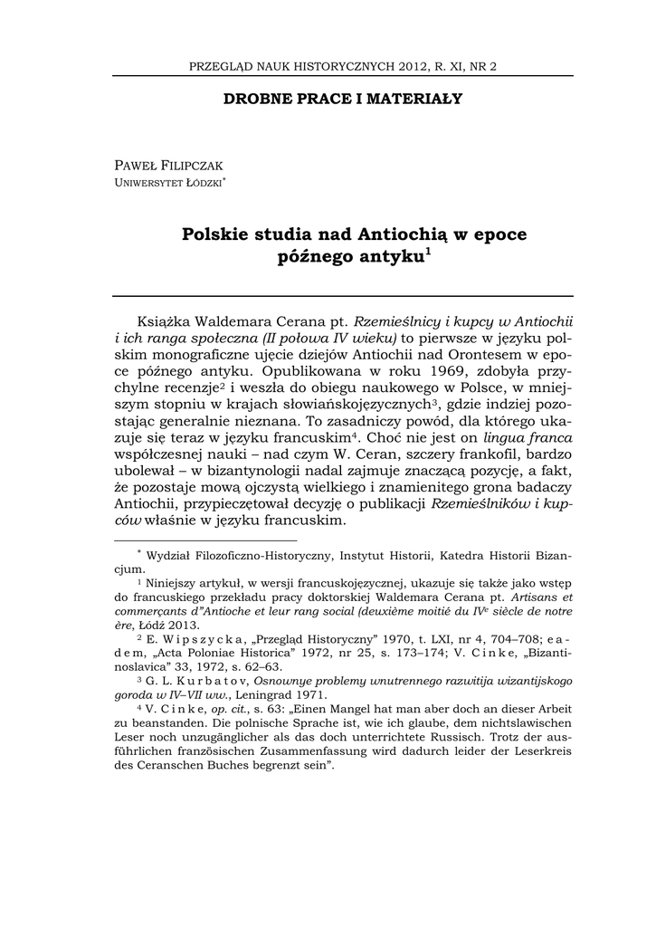 PRZEGLĄD NAUK HISTORYCZNYCH 2012, R. XI, NR 2 DROBNE PRACE I MATERIAŁY PAWEŁ FILIPCZAK UNIWERSYTET ŁÓDZKI Polskie studia nad Antiochią w epoce późnego antyku1 Książka Waldemara Cerana pt. Rzemieślnicy i kupcy w Antiochii i ich ranga społeczna (II połowa IV wieku) to pierwsze w języku polskim monograficzne ujęcie dziejów Antiochii nad Orontesem w epoce późnego antyku. Opublikowana w roku 1969, zdobyła przychylne recenzje2 i weszła do obiegu naukowego w Polsce, w mniejszym stopniu w krajach słowiańskojęzycznych3, gdzie indziej pozostając generalnie nieznana. To zasadniczy powód, dla którego ukazuje się teraz w języku francuskim4. Choć nie jest on lingua franca współczesnej nauki – nad czym W. Ceran, szczery frankofil, bardzo ubolewał – w bizantynologii nadal zajmuje znaczącą pozycję, a fakt, że pozostaje mową ojczystą wielkiego i znamienitego grona badaczy Antiochii, przypieczętował decyzję o publikacji Rzemieślników i kupców właśnie w języku francuskim. Wydział Filozoficzno-Historyczny, Instytut Historii, Katedra Historii Bizancjum. 1 Niniejszy artykuł, w wersji francuskojęzycznej, ukazuje się także jako wstęp do francuskiego przekładu pracy doktorskiej Waldemara Cerana pt. Artisans et commerçants d”Antioche et leur rang social (deuxième moitié du IVe siècle de notre ère, Łódź 2013. 2 E. W i p s z y c k a , „Przegląd Historyczny” 1970, t. LXI, nr 4, 704–708; e a d e m, „Acta Poloniae Historica” 1972, nr 25, s. 173–174; V. C i n k e, „Bizantinoslavica” 33, 1972, s. 62–63. 3 G. L. K u r b a t o v, Osnownye problemy wnutrennego razwitija wizantijskogo goroda w IV–VII ww., Leningrad 1971. 4 V. C i n k e, op. cit., s. 63: „Einen Mangel hat man aber doch an dieser Arbeit zu beanstanden. Die polnische Sprache ist, wie ich glaube, dem nichtslawischen Leser noch unzugänglicher als das doch unterrichtete Russisch. Trotz der ausführlichen französischen Zusammenfassung wird dadurch leider der Leserkreis des Ceranschen Buches begrenzt sein”. 164 PAWEŁ FILIPCZAK W. Ceran zastosował bardzo klarowny podział materiału, rozpoczynając od krótkiej charakterystyki źródeł. Stwierdził, że homilie Chryzostoma, pomimo nasycenia grubą warstwą retoryki, dobrze odzwierciedlają rzeczywistość historyczną II połowy IV w. Ważna to konkluzja, gdy twórczość Chryzostoma – konfrontowana co prawda z licznymi źródłami narracyjnymi i normatywnymi – stanowi zasadniczą bazę źródłową, a tak właśnie jest w przypadku Rzemieślników i kupców. Ówczesny stan badań W. Ceran uznał za rozproszony, wskazując przy tym na brak monografii dotyczących rzemiosła i handlu antiocheńskiego, szczególnie zaś monografii odnoszących się do rangi społecznej oraz znaczenia gospodarczego rzemieślników i kupców. Książka rozpoczyna się od ogólnej charakterystyki Antiochii, omówienia jej położenia i warunków naturalnych, struktury etnicznej i społecznej, podstawowych danych topograficznych oraz znaczenia administracyjnego. Rozdział pierwszy, poświęcony tym zagadnieniom, opiera się na literaturze przedmiotu – właściwie ma charakter zarysu, swego rodzaju wprowadzenia, szczególnie pożytecznego dla Czytelników mniej zorientowanych w realiach antiocheńskich5. W drugim rozdziale W. Ceran omówił wszystkie, obecne w Antiochii i uchwytne w źródłach, gałęzie rzemiosła. Określił terminy greckie, najczęściej autorstwa Chryzostoma, oznaczające zawody i narzędzia rzemieślnicze. Ustalił sposoby produkcji, wskazał surowce używane w warsztatach rzemieślniczych, omówił ich pochodzenie oraz scharakteryzował rozmaite kręgi odbiorców produkcji antiocheńskiej. Przeprowadził gradację profesji rzemieślniczych, przekonując o wysokim stopniu zaawansowania i głębokim wyspecjalizowaniu ówczesnego rzemiosła. Ocenił status materialny rzemieślników, uważając, że był on uzależniony od konkretnego zawodu – wyliczył przy tym zawody lepiej i gorzej płatne. Omówił także warunki pracy rzemieślników oraz obciążenia podatkowe, jakim podlegali. Przytoczył szereg argumentów świadczących przeciwko tezie o upadku rzemiosła antiocheńskiego u schyłku IV w. n.e. Poszczególne gałęzie rzemiosł uznał za mniej więcej jednakowo rozwinięte, w każdym razie nie sądził, by Antiochia była centrum jakiejś jednej, specyficznej tylko dla niej, wytwórczości. 5 E. W i p s z y c k a, „Przegląd Historyczny” 1970, t. LXI, nr 4, s. 704. Polskie studia nad Antiochią... 165 Rozdział trzeci, poświęcony kupcom, przypomina strukturą część pierwszą, o rzemieślnikach. I tym razem Ceran rozpoczął od objaśnień terminologicznych, wskazujących na rodzaje działalności handlowej, prowadzonej przez antiocheńczyków. Podniósł problem wielkości wymiany towarowej między Antiochią a innymi regionami państwa rzymskiego. Scharakteryzował rolę kupców w życiu gospodarczym Antiochii, Syrii i całego państwa, omawiając również ich pozycję majątkową, a także – przy tej okazji – powinności podatkowe. W ostatnim, czwartym rozdziale W. Ceran omówił społeczną rolę rzemieślników i kupców, wychodząc z założenia, że była ona uzależniona głównie od dwu czynników: mentalnych przekonań społeczeństwa antycznego względem ludzi utrzymujących się z pracy fizycznej oraz stopnia zamożności warstwy rzemieślniczo-kupieckiej. W. Ceran przekonuje, że do wielu zawodów odnoszono się z pogardą, że w hierarchii społecznej stały one bardzo nisko, ale wskazuje też na te profesje, które cieszyły się dużym społecznym uznaniem, pozwalały na zgromadzenie niemałych majątków i tym samym zyskanie wpływów. Powyżej przedstawiłem zarys konstrukcji książki i podstawowe konkluzje, nie zamierzając w szczegółach powtarzać tego, co W. Ceran wyjaśnił w pełni na kartach swojej książki. W tym miejscu pragnę natomiast zwrócić uwagę na kilka fr