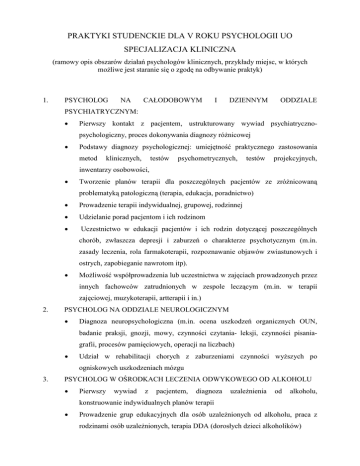 PRAKTYKI STUDENCKIE DLA V ROKU PSYCHOLOGII UO