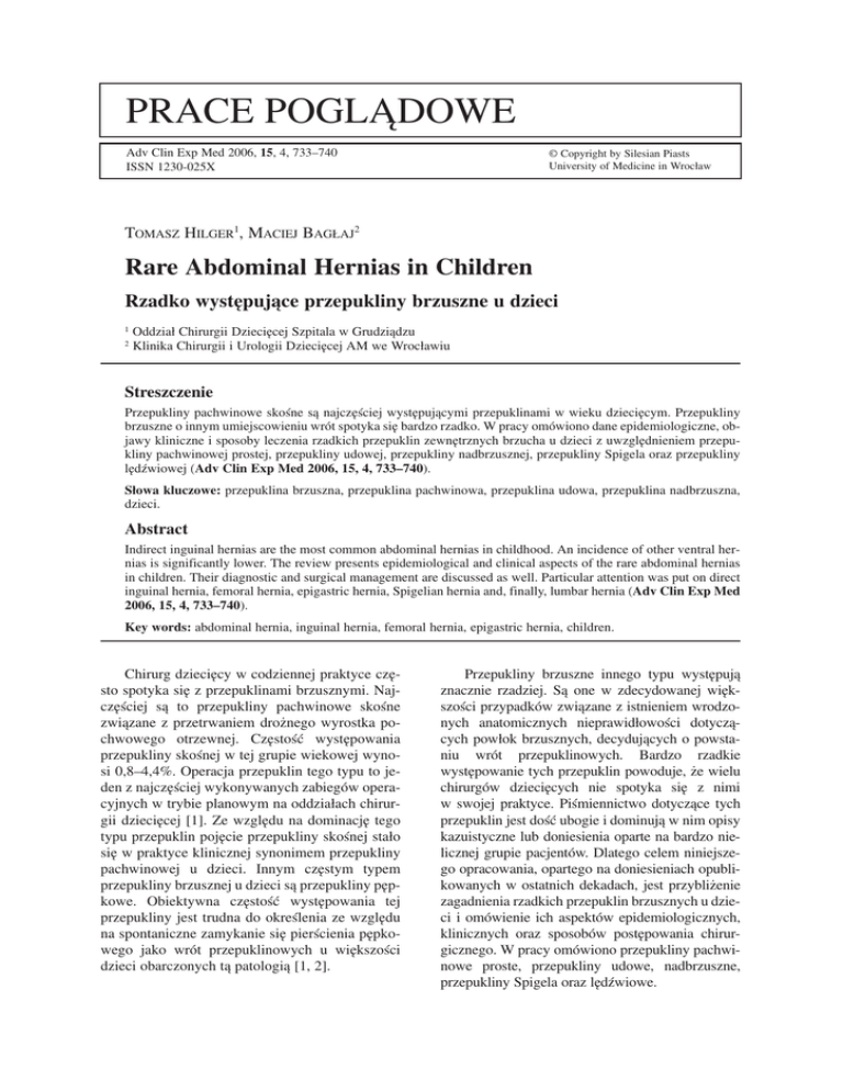 PRACE POGLĄDOWE Adv Clin Exp Med 2006, 15, 4, 733–740 ISSN 1230−025X © Copyright by Silesian Piasts University of Medicine in Wrocław TOMASZ HILGER1, MACIEJ BAGŁAJ2 Rare Abdominal Hernias in Children Rzadko występujące przepukliny brzuszne u dzieci 1 2 Oddział Chirurgii Dziecięcej Szpitala w Grudziądzu Klinika Chirurgii i Urologii Dziecięcej AM we Wrocławiu Streszczenie Przepukliny pachwinowe skośne są najczęściej występującymi przepuklinami w wieku dziecięcym. Przepukliny brzuszne o innym umiejscowieniu wrót spotyka się bardzo rzadko. W pracy omówiono dane epidemiologiczne, ob− jawy kliniczne i sposoby leczenia rzadkich przepuklin zewnętrznych brzucha u dzieci z uwzględnieniem przepu− kliny pachwinowej prostej, przepukliny udowej, przepukliny nadbrzusznej, przepukliny Spigela oraz przepukliny lędźwiowej (Adv Clin Exp Med 2006, 15, 4, 733–740). Słowa kluczowe: przepuklina brzuszna, przepuklina pachwinowa, przepuklina udowa, przepuklina nadbrzuszna, dzieci. Abstract Indirect inguinal hernias are the most common abdominal hernias in childhood. An incidence of other ventral her− nias is significantly lower. The review presents epidemiological and clinical aspects of the rare abdominal hernias in children. Their diagnostic and surgical management are discussed as well. Particular attention was put on direct inguinal hernia, femoral hernia, epigastric hernia, Spigelian hernia and, finally, lumbar hernia (Adv Clin Exp Med 2006, 15, 4, 733–740). Key words: abdominal hernia, inguinal hernia, femoral hernia, epigastric hernia, children. Chirurg dziecięcy w codziennej praktyce czę− sto spotyka się z przepuklinami brzusznymi. Naj− częściej są to przepukliny pachwinowe skośne związane z przetrwaniem drożnego wyrostka po− chwowego otrzewnej. Częstość występowania przepukliny skośnej w tej grupie wiekowej wyno− si 0,8–4,4%. Operacja przepuklin tego typu to je− den z najczęściej wykonywanych zabiegów opera− cyjnych w trybie planowym na oddziałach chirur− gii dziecięcej [1]. Ze względu na dominację tego typu przepuklin pojęcie przepukliny skośnej stało się w praktyce klinicznej synonimem przepukliny pachwinowej u dzieci. Innym częstym typem przepukliny brzusznej u dzieci są przepukliny pęp− kowe. Obiektywna częstość występowania tej przepukliny jest trudna do określenia ze względu na spontaniczne zamykanie się pierścienia pępko− wego jako wrót przepuklinowych u większości dzieci obarczonych tą patologią [1, 2]. Przepukliny brzuszne innego typu występują znacznie rzadziej. Są one w zdecydowanej więk− szości przypadków związane z istnieniem wrodzo− nych anatomicznych nieprawidłowości dotyczą− cych powłok brzusznych, decydujących o powsta− niu wrót przepuklinowych. Bardzo rzadkie występowanie tych przepuklin powoduje, że wielu chirurgów dziecięcych nie spotyka się z nimi w swojej praktyce. Piśmiennictwo dotyczące tych przepuklin jest dość ubogie i dominują w nim opisy kazuistyczne lub doniesienia oparte na bardzo nie− licznej grupie pacjentów. Dlatego celem niniejsze− go opracowania, opartego na doniesieniach opubli− kowanych w ostatnich dekadach, jest przybliżenie zagadnienia rzadkich przepuklin brzusznych u dzie− ci i omówienie ich aspektów epidemiologicznych, klinicznych oraz sposobów postępowania chirur− gicznego. W pracy omówiono przepukliny pachwi− nowe proste, przepukliny udowe, nadbrzuszne, przepukliny Spigela oraz lędźwiowe. 734 T. HILGER, M. BAGŁAJ Anatomia potencjalnych wrót przepuklin brzusznych W celu omówienia zagadnień związanych z patologią przepuklin brzusznych należy przypo− mnieć podstawowe zagadnienia anatomii okolic tzw. zmniejszonego oporu. Najbardziej skomplikowana pod względem anatomicznym jest okolica pachwinowa, w obrę− bie której powstają przepukliny pachwinowe sko− śne i proste oraz przepukliny udowe. Stosowane dawniej opisy anatomiczne nie zawsze odzwier− ciedlały panujące stosunki topograficzne, co wraz z dość dużym odsetkiem powikłań po operacjach w tej okolicy skłoniło badaczy do ponownego za− interesowania się anatomią pachwiny [3, 4]. W re− zultacie tych badań wprowadzono pojęcie rozwo− ru mięśniowo−grzebieniowego. Jest to przestrzeń ograniczona od góry przez brzeg dolny mięśnia skośnego wewnętrznego i poprzecznego brzucha wraz z ich ścięgnem łączącym, a od dołu grzebie− niem kości łonowej. Granicę przyśrodkową wy− znacza brzeg boczny m. prostego, a boczną przy− środkowa krawędź mięśnia biodrowo−lędźwiowe− go. Przebiegające poprzecznie na kształt cięciwy więzadło pachwinowe nie jest w tym ujęciu wzmocnieniem przedniej ściany brzucha, a jedy− nie przegrodą dzielącą ów rozwór na piętra górne i dolne. Głównym elementem oporowym rozworu jest powięź poprzeczna z tzw. analogami. Łuk biodrowo−grzebieniowy jest to pasmo łącz− notkankowe biegnące od kolca biodrowego przed− niego górnego wspólnie z więzadłem pachwino− wym, od którego również otrzymuje włókna, i w 1/3 jego długości zagina się ku dołowi i przyczepia do wyniosłości biodrowo−łonowej. Pasmo to dzieli roz− stęp wspólny na rozstęp mięśniowy i naczyniowy. Pasmo biodrowo−łonowe jest to przyśrodkowe przedłużenie łuku biodrowo−grzebieniowego. Prze− biega ono po tylnej powierzchni więzadła pachwi− nowego. Przyśrodkowo przyczepia się do więzadła grzebieniowego. Pasmo to jest w swojej części przyśrodkowej przyśrodkowym ograniczeniem ka− nału udowego. Więzadło międzydołkowe to wiązka odcho− dząca od łuku biodrowo−grzebieniowego i więza− dła pachwinowego, zaginająca się ku górze i ogra− niczająca od strony przyśrodkowej pierścień pa− chwinowy głęboki. Odchodzące bocznie od tej wiązki włókna obejmują pierścień na kształt pod− kowy i są nazywane odnogą górną i dolną. Sierp pachwino