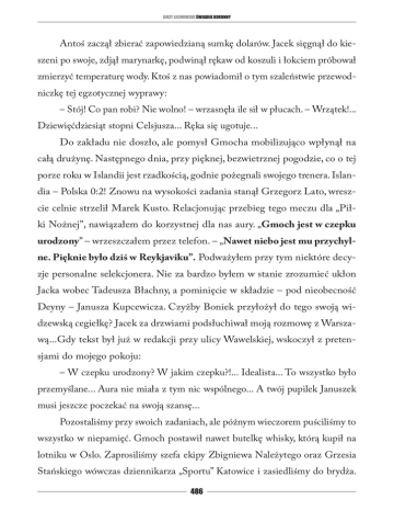 ´ JERZY LECHOWSKI SWIADEK KORONNY Antoś zaczął zbierać zapowiedzianą sumkę dolarów. Jacek sięgnął do kieszeni po swoje, zdjął marynarkę, podwinął rękaw od koszuli i łokciem próbował zmierzyć temperaturę wody. Ktoś z nas powiadomił o tym szaleństwie przewodniczkę tej egzotycznej wyprawy: – Stój! Co pan robi? Nie wolno! – wrzasnęła ile sił w płucach. – Wrzątek!... Dziewięćdziesiąt stopni Celsjusza... Ręka się ugotuje... Do zakładu nie doszło, ale pomysł Gmocha mobilizująco wpłynął na całą drużynę. Następnego dnia, przy pięknej, bezwietrznej pogodzie, co o tej porze roku w Islandii jest rzadkością, godnie pożegnali swojego trenera. Islandia – Polska 0:2! Znowu na wysokości zadania stanął Grzegorz Lato, wreszcie celnie strzelił Marek Kusto. Relacjonując przebieg tego meczu dla „Piłki Nożnej”, nawiązałem do korzystnej dla nas aury. „Gmoch jest w czepku urodzony” – wrzeszczałem przez telefon. – „Nawet niebo jest mu przychylne. Pięknie było dziś w Reykjaviku”. Podważyłem przy tym niektóre decyzje personalne selekcjonera. Nie za bardzo byłem w stanie zrozumieć ukłon Jacka wobec Tadeusza Błachny, a pominięcie w składzie – pod nieobecność Deyny – Janusza Kupcewicza. Czyżby Boniek przyłożył do tego swoją widzewską cegiełkę? Jacek za drzwiami podsłuchiwał moją rozmowę z Warszawą...Gdy tekst był już w redakcji przy ulicy Wawelskiej, wskoczył z pretensjami do mojego pokoju: – W czepku urodzony? W jakim czepku?!... Idealista... To wszystko było przemyślane... Aura nie miała z tym nic wspólnego... A twój pupilek Januszek musi jeszcze poczekać na swoją szansę... Pozostaliśmy przy swoich zadaniach, ale późnym wieczorem puściliśmy to wszystko w niepamięć. Gmoch postawił nawet butelkę whisky, którą kupił na lotniku w Oslo. Zaprosiliśmy szefa ekipy Zbigniewa Należytego oraz Grzesia Stańskiego wówczas dziennikarza „Sportu” Katowice i zasiedliśmy do brydża. 486 ´ JERZY LECHOWSKI SWIADEK KORONNY Przed północą pojawił się Janusz Dudek i... przestawiliśmy się na pokera. Dolar w tym towarzystwie miał wtedy wartość stu złotych. Następnego dnia spacerowaliśmy po Reykjaviku. W magazynach piękne kożuchy, ale nie na naszą kieszeń. Inżynier Należyty wolał więc zwiedzać miejscowe zabytki. Trafiliśmy nawet do miejscowego więzienia. Tu zaskoczenie jeszcze większe niż podziwiana pogoda i dobry wynik meczu. Cele więzienne porażają przepychem. W naszych szpitalach rzadko spotyka się tak schludnie urządzone, nawet najlepsze gabinety lekarskie. Czysto, luźno, skazani paradują w białych kitlach, niczym ordynatorzy lecznicy. W całym tym „miejscu odosobnienia” dostrzegamy tylko dwóch „pacjentów”. Gdzie reszta? Przewodniczka zdradza sekret niezwykły: – U nas w ogóle więźniów jak na lekarstwo. Ci dwaj, to przebrani strażnicy... na ochotnika. Przecież jakoś dziwnie by to wyglądało, gdybyśmy pokazywali wam więzienie bez więźniów... Następcą Jacka Gmocha został Ryszard Kulesza, wychowanek Okęcia Warszawa. Zaraz po wojnie, w meczach z Czechosłowacją grał w reprezentacji Polski juniorów, później związał się z Polonią Warszawa, bronił też barw Polonii Bydgoszcz. Miły człowiek, zawsze pogodny i uśmiechnięty, niekiedy można było odnieść wrażenie, że nie „pasował” do tak męskiej gry, jaką jest pika nożna. Zbyt układny i tolerancyjny. Całkowite przeciwieństwo Jacusia. Zanim przejął reprezentację narodową „alfabetu trenerskiego” uczył się w Ludowych Zespołach Sportowych i w kilku klubach niższych klas na Mazowszu, w Lechii Gdańsk, wreszcie w PZPN w towarzystwie Ryszarda Koncewicza, Kazimierza Górskiego, Edmunda Zientary, Jacka Gmocha i Andrzeja Strejlaua. „Pan Rysio”, zwany też „Loczkiem”, bo tak go ochrzcił trener Górski, był powszechnie lubiany i podziwiany za dżentelmeńską postawę. Kazio przy każdej okazji powtarzał, że jego młodszy kolega elegancko się ubiera, a buty ma z reguły jeszcze bardziej błyszczące niż lakierki. „Kulka”, bo i tak wybierzmowano 487 ´ JERZY LECHOWSKI SWIADEK KORONNY Rysia w Polonii Warszawa, nie był selekcjonerem z przypadku. Wcześniej z powodzeniem budował zespoły Under – 23 i Under – 21, choć najczęściej z winy klubów prawie nigdy nie mógł skorzystać z usług wszystkich wyróżniających się młodych zawodników. Kulesza był też w drugiej połowie lat siedemdziesiątych trenerem reprezentacji B. Przeszedł więc wszystkie szczeble „reprezentacyjnego wtajemniczenia”. Przed nim niewielu trenerów – selekcjonerów przeszło podobną drogę. Co więc zwojuje „pan Rysio”? Czy zdoła nawiązać do medalowej ery „pana Kazia”?... „BANDYTA” Z MONTE CARLO Debiut Kulesza miał nieudany, jego wybrańcy przegrali wyjazdowy mecz z Rumunią 0 :1, ale już następne gry o punkty i towarzyskie ze Szwajcarią, Tunezją, Algierią i Węgrami były obiecujące. Pierwszego meczu Rysia ze Szwajcarią z cyklu eliminacji mistrzostw Europy nie oglądałem, bo akurat wtedy (znowu w nagrodę za dobrą pracę na XXXI Turnieju UEFA w Krakowie) byłem z reprezentacją Polski juniorów w Monako na VIII Międzynarodowym Turnieju o Puchar Księcia Alberta. Piękna impreza nie tylko pod względem piłkarskim. Bogaty program pozasportowy. Poziom i precyzja szwajcarskiego zegarka. Na futbolowych zawodach to się nieczęsto zdarza. Najpierw przyjął nas mer Monte Carlo, potem zabawialiśmy zwierzęta w ZOO, a śródziemnomorską roślinnością i kwiatami zachwycaliśmy się w ogrodzie botanicznym. Dzieła sztuki pokazano nam w tamtejszym muzeum, zaproszono do pałacu księcia Alberta, wreszcie z własnej inicjatywy odwiedziliśmy słynne kasyno gry w Monte Carlo. Mieszkaliśmy w hotelu Beach Plaza, ale poznaliśmy też wspaniałości Hotelu de Paris, w którym niegdyś buszował Arsen Lupin. Tam właśnie na półmetku tur