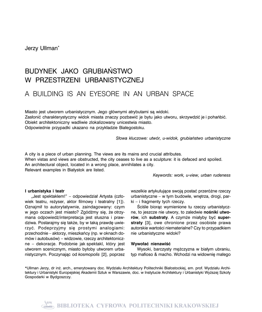 178 Jerzy Ullman* BUDYNEK JAKO GRUBIAŃSTWO W PRZESTRZENI URBANISTYCZNEJ A BUILDING IS AN EYESORE IN AN URBAN SPACE Miasto jest utworem urbanistycznym. Jego głównymi atrybutami są widoki. Zasłonić charakterystyczny widok miasta znaczy pozbawić je bytu jako utworu, skrzywdzić je i pohańbić. Obiekt architektoniczny wadliwie zlokalizowany unicestwia miasto. Odpowiednie przypadki ukazano na przykładzie Białegostoku. Słowa kluczowe: utwór, u-widok, grubiaństwo urbanistyczne A city is a piece of urban planning. The views are its mains and crucial attributes. When vistas and views are obstructed, the city ceases to live as a sculpture: it is defaced and spoiled. An architectural object, located in a wrong place, annihilates a city. Relevant examples in Białystok are listed. Keywords: work, u-view, urban rudeness I urbanistyka i teatr „Jest spektaklem!” – odpowiedział Artysta (człowiek teatru, reżyser, aktor filmowy i teatralny [1]). Oznajmił to autorytatywnie, zaindagowany: czym w jego oczach jest miasto? Zgódźmy się, że otrzymana odpowiedź/interpretacja jest słuszna i prawdziwa. Postarajmy się także, by w taką prawdę uwierzyć. Podeprzyjmy się prostymi analogiami: przechodnie – aktorzy, mieszkańcy (np. w oknach domów i autobusów) – widzowie, rzeczy architektoniczne – dekoracje. Podobnie jak spektakl, który jest utworem scenicznym, miasto byłoby utworem urbanistycznym. Poczynając od kosmopolis [2], poprzez wszelkie artykułujące swoją postać przeróżne rzeczy urbanistyczne – w tym budowle, wnętrza, drogi, parki – i fragmenty tych rzeczy. Ściśle biorąc wymienione tu rzeczy urbanistyczne, to jeszcze nie utwory, to zaledwie nośniki utworów, ich substraty. A czymże miałyby być superstraty [3], owe chronione przez osobiste prawa autorskie wartości niematerialne? Czy to przypadkiem nie urbanistyczne widoki? Wywołać nienawiść Wysoki, barczysty mężczyzna w białym ubraniu, typ mafioso & macho. Wchodzi na widownię małego *Ullman Jerzy, dr inż. arch., emerytowany doc. Wydziału Architektury Politechniki Białostockiej, em. prof. Wydziału Architektury i Urbanistyki Europejskiej Akademii Sztuk w Warszawie, doc. w Instytucie Architektury i Urbanistyki Wyższej Szkoły Gospodarki w Bydgoszczy. 179 teatrzyku w trakcie przedstawienia. Staje przed widzami tyłem do większości z nich, stoi długo gadając rozgłośnie i gestykulując. Zwalistą sylwetką zasłania całą scenę. Rozwścieczeni widzowie wyzywają go i protestują. On protesty ma za nic. To znacząca sekwencja z „Ojca Chrzestnego II”. Reżyser [4] wprowadza ją po to, by widz filmowy z entuzjazmem przyjął następujący nieco później czyn protagonisty fabuły (Roberta de Niro), który uśmierci łobuza-zasłaniacza. Jakiż to środek narracji filmowej posłużył twórcom, by wywołać w widzu nienawiść do biało ubranego osobnika? Środek wręcz symboliczny: zasłonięcie widoku! Zaiste. Zasłonięcie widoku wywołuje nienawiść. Od tego momentu będę dawał jej subiektywny, acz gorący wyraz. Będę złorzeczył. Cóż to – grubiaństwo Cham znieważy, rzuci obelgę, nawet manualnie skrzywdzi – ale niejako bez złej woli lub gdy ma w tym interes. Grubianin to inny niż cham gatunek, trujący. Chętnie rozpanoszy się, nawet bezinteresownie. Nie dostrzeże kogokolwiek prócz siebie. Bywa bogaty i elegancki, niekiedy wykształcony, aczkolwiek ma kompleks wobec wykształciuchów. Czasem, gdy grubiaństwo jest budynkiem, przyjmie sympatyczne miano, np. imię krasnala z bajki [5]. Grubiaństwo to gorzej niż chamstwo, gorzej niż kradzież, gorzej niż rozbój. Człowiek etycznie zdrowy z samej swojej istoty nie może nawidzić grubiaństwa. Osądza je, tępi i karze. Fetory jako takie i inne Tak cię piszą, jak cię widzą. Ta gnoma, sprawdzająca się po trosze wobec ludzi, krotnie prawdziwsza jest w odniesieniu do miasta. Na wiele sposobów i wieloma zmysłami można miasto widzieć. Można np. węchem. Ach, te miejscowości w obrębie biznesu b. senatora Stokłosy… Albo Jelenia Góra sprzed 30–40 lat nasiąknięta siarkowo- dorem. Albo rynek krakowski letnią porą tchnący dymami kiełbaśnych grillów. W Warszawie – Dworzec Centralny (wnętrza), skrzyżowanie Marszałkowskiej i Alei… i jeszcze tyle znanych, a z obrzydzenia niezapamiętanych symfonii fetorów, które grubiańsko zasłaniają czyste powietrze. Pociecha i nadzieja w tym, że istnieją środki, by smród przegnać z miasta. Miasto można widzieć słuchem. Do określenia przestrzeń dźwiękowa z pełnym zrozumieniem odniesie się ten, kto blisko szkoły mieszkając pochłania gwar, jaki emituje ukochana dziatwa. Albo kibice na stadionie piłkarskim – też emitują. Albo tramwaje, koleje, tiry. A już wszelkie wyobrażenie przekracza histeryczny wrzask muezzinów, którzy w miastach arabskich nadają z minaretów (co godzinę!) fortissimo wersety z Koranu. Ale i w takich przypadkach gwałt na akustycznym obrazie miasta da się zminimalizować [6] lub całkiem usunąć, np. poprzez zmianę religii w meczecie [7] lub oddanie stadionu w pacht przekupniom (bez baczenia, że kupczenie da straty [8]). Prawdziwy strach to wtedy, gdy w mieście pojawi się fetor wizualny. Jeżeli będzie nim brzydota architektury albo niezamierzony kicz – to jeszcze pół biedy. Da się je zatuszować stosownym makijażem. Tedy skoro budynek zanieczyszcza wizualny krajobraz stylistyczną dysharmonią, trywialnym zgrzytem formy, zakłóceniem skali otoczenia – wówczas nastręcza niedoskonałości znane i powszechne, dyskutowane i – koniec końców – tolerowane. Albowiem to zaledwie małe zanieczyszczonka wizualne, ot, zwykłe chamstwo. Da Bóg, pojawi się podmuch dobrego gustu tego lub owego prezydenta, przewieje wietrzyk historii i chamstwo samo się ulotni. Albo też ludzie przywykną doń i pokochają. Klęska bowiem tkwi nie w tym, jak budynek wygląda, lecz gdzie został posadowiony. Sam bu