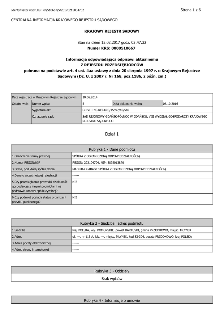 Strona 1 z 6 Identyfikator wydruku: RP/510667/5/20170215034732 CENTRALNA INFORMACJA KRAJOWEGO REJESTRU SĄDOWEGO KRAJOWY REJESTR SĄDOWY Stan na dzień 15.02.2017 godz. 03:47:32 Numer KRS: 0000510667 Informacja odpowiadająca odpisowi aktualnemu Z REJESTRU PRZEDSIĘBIORCÓW pobrana na podstawie art. 4 ust. 4aa ustawy z dnia 20 sierpnia 1997 r. o Krajowym Rejestrze Sądowym (Dz. U. z 2007 r. Nr 168, poz.1186, z późn. zm.) Data rejestracji w Krajowym Rejestrze Sądowym 10.06.2014 Ostatni wpis Numer wpisu 5 Sygnatura akt GD.VIII NS-REJ.KRS/15597/16/582 Oznaczenie sądu SĄD REJONOWY GDAŃSK-PÓŁNOC W GDAŃSKU, VIII WYDZIAŁ GOSPODARCZY KRAJOWEGO REJESTRU SĄDOWEGO Data dokonania wpisu 06.10.2016 Dział 1 Rubryka 1 - Dane podmiotu 1.Oznaczenie formy prawnej SPÓŁKA Z OGRANICZONĄ ODPOWIEDZIALNOŚCIĄ 2.Numer REGON/NIP REGON: 222104704, NIP: 5892013870 3.Firma, pod którą spółka działa MAD MAX GARAGE SPÓŁKA Z OGRANICZONĄ ODPOWIEDZIALNOŚCIĄ 4.Dane o wcześniejszej rejestracji ------ 5.Czy przedsiębiorca prowadzi działalność gospodarczą z innymi podmiotami na podstawie umowy spółki cywilnej? NIE 6.Czy podmiot posiada status organizacji pożytku publicznego? NIE Rubryka 2 - Siedziba i adres podmiotu 1.Siedziba kraj POLSKA, woj. POMORSKIE, powiat KARTUSKI, gmina PRZODKOWO, miejsc. MŁYNEK 2.Adres ul. ---, nr 113 A, lok. ---, miejsc. MŁYNEK, kod 83-304, poczta PRZODKOWO, kraj POLSKA 3.Adres poczty elektronicznej ------ 4.Adres strony internetowej ------ Rubryka 3 - Oddziały Brak wpisów Rubryka 4 - Informacje o umowie Strona 2 z 6 Identyfikator wydruku: RP/510667/5/20170215034732 1.Informacja o zawarciu lub zmianach umowy spółki 1 AKT NOTARIALNY Z DNIA 24.04.2014, NOTARIUSZ MARTA PRZYBYŁOWSKA Z SIEDZIBĄ W ŻUKOWIE, REPERTORIUM A NR 1512/2014 Rubryka 5 1.Czas, na jaki została utworzona spółka NIEOZNACZONY 2.Oznaczenie pisma innego niż Monitor Sądowy i Gospodarczy, przeznaczonego do ogłoszeń spółki ------ 3.Wspólnik może mieć: WIĘKSZĄ LICZBĘ UDZIAŁÓW 4.Czy statut przyznaje uprawnienia osobiste określonym akcjonariuszom lub tytuły uczestnictwa w dochodach lub majątku spółki nie wynikających z akcji? ***** 5.Czy obligatoriusze mają prawo do udziałów w zysku? ***** Rubryka 6 - Sposób powstania spółki Brak wpisów Rubryka 7 - Dane wspólników 1 2 1.Nazwisko / Nazwa lub firma KRZYCHOWIEC 2.Imiona PAWEŁ ROBERT 3.Numer PESEL/REGON 81020220353 4.Numer KRS ***** 5.Posiadane przez wspólnika udziały 1000 UDZIAŁÓW O ŁĄCZNEJ WARTOŚCI 50 000 ZŁ 6.Czy wspólnik posiada całość udziałów spółki? NIE 1.Nazwisko / Nazwa lub firma KULAS 2.Imiona PAWEŁ MAREK 3.Numer PESEL/REGON 82102902675 4.Numer KRS ***** 5.Posiadane przez wspólnika udziały 1000 UDZIAŁÓW O ŁĄCZNEJ WARTOŚCI 50 000 ZŁ 6.Czy wspólnik posiada całość udziałów spółki? NIE Rubryka 8 - Kapitał spółki 1.Wysokość kapitału zakładowego 100 000,00 ZŁ Podrubryka 1 Informacja o wniesieniu aportu Brak wpisów Strona 3 z 6 Identyfikator wydruku: RP/510667/5/20170215034732 Rubryka 9 - Nie dotyczy Brak wpisów Rubryka 10 - Nie dotyczy Brak wpisów Dział 2 Rubryka 1 - Organ uprawniony do reprezentacji podmiotu 1.Nazwa organu uprawnionego do reprezentowania podmiotu ZARZĄD 2.Sposób reprezentacji podmiotu DO SKŁADANIA OŚWIADCZEŃ I PODPISYWANIA W IMIENIU SPÓŁKI UPRAWNIONY JEST KAŻDY CZŁONEK ZARZĄDU ORAZ PROKURENT SAMODZIELNIE. Podrubryka 1 Dane osób wchodzących w skład organu 1 2 1.Nazwisko / Nazwa lub Firma KRZYCHOWIEC 2.Imiona PAWEŁ ROBERT 3.Numer PESEL/REGON 81020220353 4.Numer KRS **** 5.Funkcja w organie reprezentującym PREZES 6.Czy osoba wchodząca w skład zarządu została zawieszona w czynnościach? NIE 7.Data do jakiej została zawieszona ------ 1.Nazwisko / Nazwa lub Firma KULAS 2.Imiona PAWEŁ MAREK 3.Numer PESEL/REGON 82102902675 4.Numer KRS **** 5.Funkcja w organie reprezentującym WICEPREZES 6.Czy osoba wchodząca w skład zarządu została zawieszona w czynnościach? NIE 7.Data do jakiej została zawieszona ------ Rubryka 2 - Organ nadzoru Brak wpisów Rubryka 3 - Prokurenci 1 1.Nazwisko KULAS 2.Imiona MAREK ADAM 3.Numer PESEL 56042410116 Strona 4 z 6 Identyfikator wydruku: RP/510667/5/20170215034732 2 4.Rodzaj prokury PROKURA SAMODZIELNA 1.Nazwisko KULAS 2.Imiona IWONA 3.Numer PESEL 82092202108 4.Rodzaj prokury PROKURA SAMODZIELNA Dział 3 Rubryka 1 - Przedmiot działalności 1.Przedmiot przeważającej działalności przedsiębiorcy 1 --- 2.Przedmiot pozostałej działalności przedsiębiorcy 1 45, 11, Z, SPRZEDAŻ HURTOWA I DETALICZNA SAMOCHODÓW OSOBOWYCH I FURGONETEK 2 45, 19, Z, SPRZEDAŻ HURTOWA I DETALICZNA POZOSTAŁYCH POJAZDÓW SAMOCHODOWYCH, Z WYŁĄCZENIEM MOTOCYKLI 3 45, 20, Z, KONSERWACJA I NAPRAWA POJAZDÓW SAMOCHODOWYCH, Z WYŁĄCZENIEM MOTOCYKLI 4 45, 31, Z, SPRZEDAŻ HURTOWA CZĘŚCI I AKCESORIÓW DO POJAZDÓW SAMOCHODOWYCH, Z WYŁĄCZENIEM MOTOCYKLI 5 45, 32, Z, SPRZEDAŻ DETALICZNA CZĘŚCI I AKCESORIÓW DO POJAZDÓW SAMOCHODOWYCH, Z WYŁĄCZENIEM MOTOCYKLI 6 45, 40, Z, SPRZEDAŻ HURTOWA I DETALICZNA MOTOCYKLI, ICH NAPRAWA I KONSERWACJA ORAZ SPRZEDAŻ HURTOWA I DETALICZNA CZĘŚCI I AKCESORIÓW DO NICH Rubryka 2 - Wzmianki o złożonych dokumentach Rodzaj dokumentu Nr kolejny w polu Data złożenia Za okres od do 1.Wzmianka o złożeniu rocznego sprawozdania finansowego 1 13.07.2015 OD 10.06.2014 DO 31.12.2014 2 12.07.2016 OD 01.01.2015 DO 31.12.2015 3.Wzmianka o złożeniu uchwały 1 lub postanowienia o 2 zatwierdzeniu sprawozdania finansowego ***** OD 10.06.2014 DO 31.12.2014 ***** OD 01.01.2015 DO 31.12.2015 4.Wzmianka o złożeniu sprawozdania z działalności podmiotu ***** OD 10.06.2014 DO 31.12.2014 1 Rubryka 3 - Sprawozdania grupy kapitałowej Brak wpisów Rubryka 4 - Przedmiot działalności statutowej organizacji pożytku publicznego Brak wpisów Strona 5 z 6 Identyfikator wydruku: RP/510667/5/20170215034732 Rubryka 5 - Informacja o dniu kończącym rok obrotowy 1.Dzień kończący pierwszy rok obrotowy, za który nale