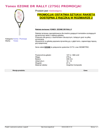 Yonex EZONE DR RALLY (275G) PROMOCJA! Produkt jest niedostępny PROMOCJA! OSTATNIA SZTUKA! RAKIETA DOSTĘPNA Z RĄCZKĄ W ROZMIARZE 2 Rakieta tenisowa YONEX EZONE DR RALLY Kategorie Komis / Promocje Marka Yonex Rakieta tenisowa zaprojektowana dla średnio grających tenisistów szukających dynamicznej rakiet z większą główką. Polecana dla graczy z backhandem oburęcznym, lubiącym grać na piłkę wznoszącą. Wyważenie na główkę poprawia dynamikę gry z głębi kortu, zapewniając lepszą grę topspinową Seria rakiet EZONE to połączenie systemów O.P.S. oraz ISOMETRIC. Powierzchnia główki: Waga: Balans: Układ strun: Długość: Materiał rakiety: 107 in / 690 cm2 275 g 335 mm 16 / 19 27 in Graphite Composite Wersja produktu Projekt i wykonanie wydruku: Logisoft Powered by TCPDF (www.tcpdf.org) Cena http://www.logisoft.pl/ +48 42 235 41 51 Strona 1 z 1