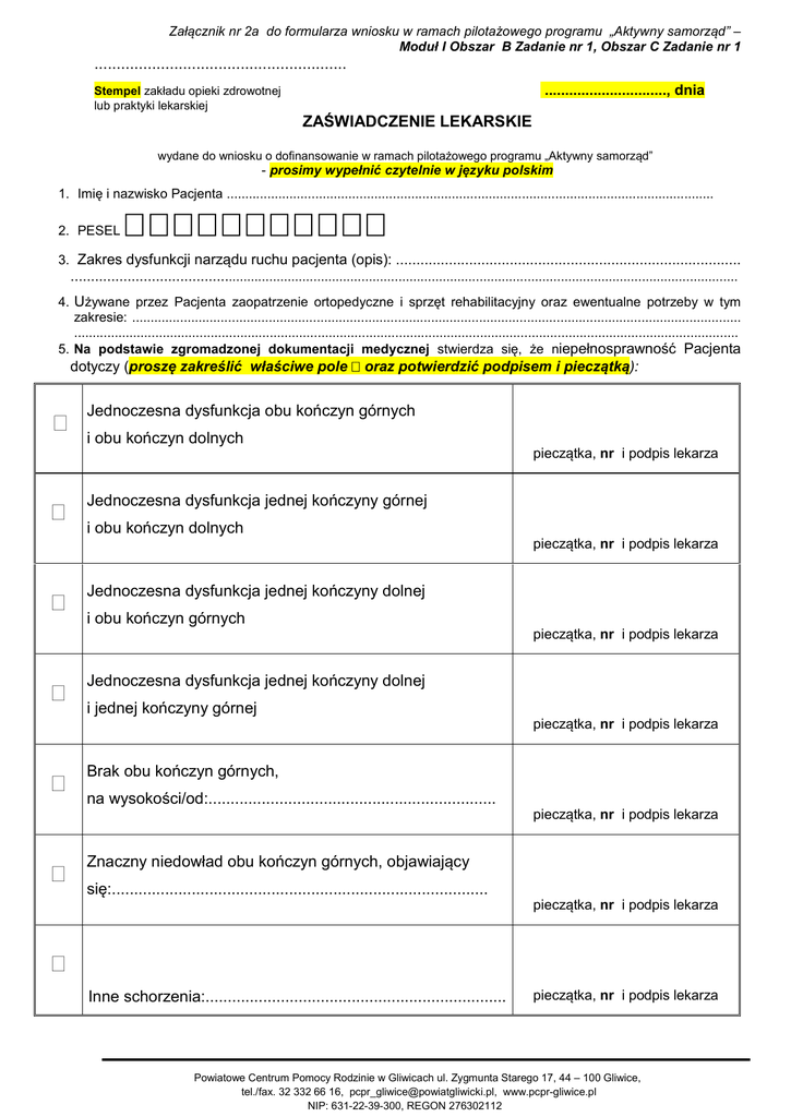 Załącznik nr 2a do formularza wniosku w ramach pilotażowego programu „Aktywny samorząd” – Moduł I Obszar B Zadanie nr 1, Obszar C Zadanie nr 1 ......................................................... .............................., dnia Stempel zakładu opieki zdrowotnej lub praktyki lekarskiej ZAŚWIADCZENIE LEKARSKIE wydane do wniosku o dofinansowanie w ramach pilotażowego programu „Aktywny samorząd” - prosimy wypełnić czytelnie w języku polskim 1. Imię i nazwisko Pacjenta .................................................................................................................................... 2. PESEL 3. Zakres dysfunkcji narządu ruchu pacjenta (opis): ..................................................................................... ................................................................................................................................................................................. 4. Używane przez Pacjenta zaopatrzenie ortopedyczne i sprzęt rehabilitacyjny oraz ewentualne potrzeby w tym zakresie: ..................................................................................................................................................................... .................................................................................................................................................................................... 5. Na podstawie zgromadzonej dokumentacji medycznej stwierdza się, że niepełnosprawność Pacjenta dotyczy (proszę zakreślić właściwe pole oraz potwierdzić podpisem i pieczątką): Jednoczesna dysfunkcja obu kończyn górnych i obu kończyn dolnych pieczątka, nr i podpis lekarza Jednoczesna dysfunkcja jednej kończyny górnej i obu kończyn dolnych pieczątka, nr i podpis lekarza Jednoczesna dysfunkcja jednej kończyny dolnej i obu kończyn górnych pieczątka, nr i podpis lekarza Jednoczesna dysfunkcja jednej kończyny dolnej i jednej kończyny górnej pieczątka, nr i podpis lekarza Brak obu kończyn górnych, na wysokości/od:................................................................. pieczątka, nr i podpis lekarza Znaczny niedowład obu kończyn górnych, objawiający się:..................................................................................... pieczątka, nr i podpis lekarza Inne schorzenia:.................................................................... pieczątka, nr i podpis lekarza Powiatowe Centrum Pomocy Rodzinie w Gliwicach ul. Zygmunta Starego 17, 44 – 100 Gliwice, tel./fax. 32 332 66 16, [email protected], www.pcpr-gliwice.pl NIP: 631-22-39-300, REGON 276302112 str. 2 załącznika nr 2a do formularza wniosku – dotyczy formularzy wniosków – Moduł I Obszar C Zadanie nr 1 6. Ponadto (pole obowiązkowe w przypadku Pacjenta ubiegającego się o dofinansowanie w ramach obszaru C programu) - na podstawie zgromadzonej dokumentacji medycznej stwierdza się, że: proszę zakreślić właściwe pola 1. Pacjent może poruszać się na wózku inwalidzkim o napędzie ręcznym: tak nie 2. Korzystanie z wózka o napędzie elektrycznym jest niewskazane, gdyż może spowodować wstrzymanie lub pogorszenie procesu rehabilitacji lub wpłynie niekorzystnie na sprawność kończyn górnych: tak nie 3. Przeciwwskazania do korzystania z wózka o napędzie elektrycznym (np. utraty przytomności, epilepsja): .................................................................. ............................................................................................................................ ............................................ ............................... brak przeciwwskazań pieczątka, nr i podpis lekarza Dotyczy wyłącznie Wnioskodawców ubiegających się o zwiększenie kwoty dofinansowania na zakup wózka inwalidzkiego o napędzie elektrycznym Pacjent z uwagi na ograniczenia funkcjonalne, stan i zakres dysfunkcji narządu ruchu powodującej niepełnosprawność wymaga zakupu wózka inwalidzkiego o napędzie elektrycznym z ponadstandardowym wyposażeniem, w tym: (proszę zakreślić właściwe pola ) niestandardowe sterowniki umożliwiające sterowanie wózkiem za pomocą jedynie władnych części ciała jak np.: ręki, palca, brody, stopy, warg lub wdechu i wydechu powietrza itp. urządzenia umożliwiające prowadzenie wózka także przez osobę towarzyszącą (hamulec, sterownik itp.) niestandardowe siedzisko (np. z windą podnoszącą, rehabilitacyjne, zapewniające maksymalną stabilizację, przeciwodleżynowe, itp.) specjalne, regulowane (w tym elektrycznie i w różnych płaszczyznach): podnóżki, podłokietniki lub oparcia nadgarstków kliny zapobiegające zsuwaniu się Pacjenta z wózka lub podpórki boczne, peloty piersiowe zagłówek stabilizujący głowę i szyję (w kształcie litery U) specjalne pasy bezpieczeństwa (np. dwupunktowe zapinane na biodrach, czteropunktowe) taki sposób, aby wózek był indywidualnie dopasowany do sylwetki Pacjenta (np. w przypadku niestandardowego wzrostu czy wagi Pacjenta) inne elementy i urządzenia (np. umożliwiające podłączenia joysticka wózka do komputera i posługiwanie się nim jak myszką), jakie: ........................................, dnia .............. (miejscowość ) (data) ............................................... pieczątka, nr i podpis lekarza Powiatowe Centrum Pomocy Rodzinie w Gliwicach ul. Zygmunta Starego 17, 44 – 100 Gliwice, tel./fax. 32 332 66 16, [email protected], www.pcpr-gliwice.pl NIP: 631-22-39-300, REGON 276302112 Str. 3 załącznika nr 2a do formularza wniosku – dotyczy formularzy wniosków – Moduł I Obszar C Zadanie nr 3 i 4 ......................................................... .............................., dnia Stempel zakładu opieki zdrowotnej lub praktyki lekarskiej ZAŚWIADCZENIE LEKARSKIE wydane do wniosku o dofinansowanie w ramach pilotażowego programu „Aktywny samorząd” - prosimy wypełnić czytelnie w języku polskim 1