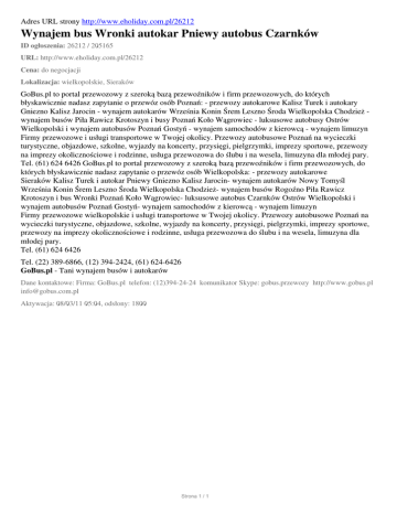 Adres URL strony http://www.eholiday.com.pl/26212 Wynajem bus Wronki autokar Pniewy autobus Czarnków ID ogłoszenia: 26212 / 205165 URL: http://www.eholiday.com.pl/26212 Cena: do negocjacji Lokalizacja: wielkopolskie, Sieraków GoBus.pl to portal przewozowy z szeroką bazą przewoźników i firm przewozowych, do których błyskawicznie nadasz zapytanie o przewóz osób Poznań: - przewozy autokarowe Kalisz Turek i autokary Gniezno Kalisz Jarocin - wynajem autokarów Września Konin Śrem Leszno Środa Wielkopolska Chodzież wynajem busów Piła Rawicz Krotoszyn i busy Poznań Koło Wągrowiec - luksusowe autobusy Ostrów Wielkopolski i wynajem autobusów Poznań Gostyń - wynajem samochodów z kierowcą - wynajem limuzyn Firmy przewozowe i usługi transportowe w Twojej okolicy. Przewozy autobusowe Poznań na wycieczki turystyczne, objazdowe, szkolne, wyjazdy na koncerty, przysięgi, pielgrzymki, imprezy sportowe, przewozy na imprezy okolicznościowe i rodzinne, usługa przewozowa do ślubu i na wesela, limuzyna dla młodej pary. Tel. (61) 624 6426 GoBus.pl to portal przewozowy z szeroką bazą przewoźników i firm przewozowych, do których błyskawicznie nadasz zapytanie o przewóz osób Wielkopolska: - przewozy autokarowe Sieraków Kalisz Turek i autokar Pniewy Gniezno Kalisz Jarocin- wynajem autokarów Nowy Tomyśl Września Konin Śrem Leszno Środa Wielkopolska Chodzież- wynajem busów Rogoźno Piła Rawicz Krotoszyn i bus Wronki Poznań Koło Wągrowiec- luksusowe autobus Czarnków Ostrów Wielkopolski i wynajem autobusów Poznań Gostyń- wynajem samochodów z kierowcą - wynajem limuzyn Firmy przewozowe wielkopolskie i usługi transportowe w Twojej okolicy. Przewozy autobusowe Poznań na wycieczki turystyczne, objazdowe, szkolne, wyjazdy na koncerty, przysięgi, pielgrzymki, imprezy sportowe, przewozy na imprezy okolicznościowe i rodzinne, usługa przewozowa do ślubu i na wesela, limuzyna dla młodej pary. Tel. (61) 624 6426 Tel. (22) 389-6866, (12) 394-2424, (61) 624-6426 GoBus.pl - Tani wynajem busów i autokarów Dane kontaktowe: Firma: GoBus.pl telefon: (12)394-24-24 komunikator Skype: gobus.przewozy http://www.gobus.pl [email protected] Aktywacja: 08/03/11 05:04, odsłony: 1800 Strona 1 / 1