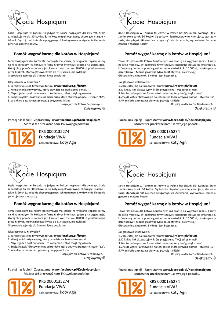 Kocie Hospicjum w Toruniu to jedyne w Polsce hospicjum dla zwierząt. Stale zamieszkuje tu ok. 30 kotów. Są to koty niepełnosprawne, chorujące, starsze – takie, których już nikt nie chce przygarnąć. Ich utrzymanie, wyżywienie i leczenie generuje znaczne koszty. Kocie Hospicjum w Toruniu to jedyne w Polsce hospicjum dla zwierząt. Stale zamieszkuje tu ok. 30 kotów. Są to koty niepełnosprawne, chorujące, starsze – takie, których już nikt nie chce przygarnąć. Ich utrzymanie, wyżywienie i leczenie generuje znaczne koszty. Pomóż wygrać karmę dla kotów w Hospicjum! Pomóż wygrać karmę dla kotów w Hospicjum! Teraz Hospicjum dla Kotów Bezdomnych ma szansę na wygranie zapasu karmy na kilka miesięcy. W konkursie firmy Krakvet internauci głosują na organizację, której chcą pomóc – pomocą jest karma o wartości ok. 10 000 zł, przekazywana przez Krakvet. Można głosować tylko do 31 stycznia, nie zwlekaj! Głosowanie zajmuje ok. 3 minut i jest bezpłatne. Teraz Hospicjum dla Kotów Bezdomnych ma szansę na wygranie zapasu karmy na kilka miesięcy. W konkursie firmy Krakvet internauci głosują na organizację, której chcą pomóc – pomocą jest karma o wartości ok. 10 000 zł, przekazywana przez Krakvet. Można głosować tylko do 31 stycznia, nie zwlekaj! Głosowanie zajmuje ok. 3 minut i jest bezpłatne. Jak głosować w Krakvecie? 1. Zarejestruj się na firmowym forum: www.krakvet.pl/forum 2. Kliknij w link aktywacyjny, który przyjdzie na Twój adres e-mail. 3. Napisz jeden post na forum – to konieczne, żebyś mógł zagłosować. 4. Znajdź wątek "Głosowanie na schronisko które otrzyma pomoc – styczeń ‘12”. 5. W ankiecie zaznaczasz pierwszą pozycję na liście: Hospicjum dla Kotów Bezdomnych. Jak głosować w Krakvecie? 1. Zarejestruj się na firmowym forum: www.krakvet.pl/forum 2. Kliknij w link aktywacyjny, który przyjdzie na Twój adres e-mail. 3. Napisz jeden post na forum – to konieczne, żebyś mógł zagłosować. 4. Znajdź wątek "Głosowanie na schronisko które otrzyma pomoc – styczeń ‘12”. 5. W ankiecie zaznaczasz pierwszą pozycję na liście: Hospicjum dla Kotów Bezdomnych. Dziękujemy Dziękujemy Poznaj nas lepiej! Zapraszamy: www.facebook.pl/KocieHospicjum Możesz też przekazać nam 1% swojego podatku. KRS 0000135274 Fundacja VIVA! Cel szczegółowy: koty Agn Poznaj nas lepiej! Zapraszamy: www.facebook.pl/KocieHospicjum Możesz też przekazać nam 1% swojego podatku. KRS 0000135274 Fundacja VIVA! Cel szczegółowy: koty Agn Kocie Hospicjum w Toruniu to jedyne w Polsce hospicjum dla zwierząt. Stale zamieszkuje tu ok. 30 kotów. Są to koty niepełnosprawne, chorujące, starsze – takie, których już nikt nie chce przygarnąć. Ich utrzymanie, wyżywienie i leczenie generuje znaczne koszty. Kocie Hospicjum w Toruniu to jedyne w Polsce hospicjum dla zwierząt. Stale zamieszkuje tu ok. 30 kotów. Są to koty niepełnosprawne, chorujące, starsze – takie, których już nikt nie chce przygarnąć. Ich utrzymanie, wyżywienie i leczenie generuje znaczne koszty. Pomóż wygrać karmę dla kotów w Hospicjum! Pomóż wygrać karmę dla kotów w Hospicjum! Teraz Hospicjum dla Kotów Bezdomnych ma szansę na wygranie zapasu karmy na kilka miesięcy. W konkursie firmy Krakvet internauci głosują na organizację, której chcą pomóc – pomocą jest karma o wartości ok. 10 000 zł, przekazywana przez Krakvet. Można głosować tylko do 31 stycznia, nie zwlekaj! Głosowanie zajmuje ok. 3 minut i jest bezpłatne. Teraz Hospicjum dla Kotów Bezdomnych ma szansę na wygranie zapasu karmy na kilka miesięcy. W konkursie firmy Krakvet internauci głosują na organizację, której chcą pomóc – pomocą jest karma o wartości ok. 10 000 zł, przekazywana przez Krakvet. Można głosować tylko do 31 stycznia, nie zwlekaj! Głosowanie zajmuje ok. 3 minut i jest bezpłatne. Jak głosować w Krakvecie? 1. Zarejestruj się na firmowym forum: www.krakvet.pl/forum 2. Kliknij w link aktywacyjny, który przyjdzie na Twój adres e-mail. 3. Napisz jeden post na forum – to konieczne, żebyś mógł zagłosować. 4. Znajdź wątek "Głosowanie na schronisko które otrzyma pomoc – styczeń ‘12”. 5. W ankiecie zaznaczasz pierwszą pozycję na liście: Hospicjum dla Kotów Bezdomnych. Jak głosować w Krakvecie? 1. Zarejestruj się na firmowym forum: www.krakvet.pl/forum 2. Kliknij w link aktywacyjny, który przyjdzie na Twój adres e-mail. 3. Napisz jeden post na forum – to konieczne, żebyś mógł zagłosować. 4. Znajdź wątek "Głosowanie na schronisko które otrzyma pomoc – styczeń ‘12”. 5. W ankiecie zaznaczasz pierwszą pozycję na liście: Hospicjum dla Kotów Bezdomnych. Dziękujemy Dziękujemy Poznaj nas lepiej! Zapraszamy: www.facebook.pl/KocieHospicjum Możesz też przekazać nam 1% swojego podatku. KRS 0000135274 Fundacja VIVA! Cel szczegółowy: koty Agn Poznaj nas lepiej! Zapraszamy: www.facebook.pl/KocieHospicjum Możesz też przekazać nam 1% swojego podatku. KRS 0000135274 Fundacja VIVA! Cel szczegółowy: koty Agn