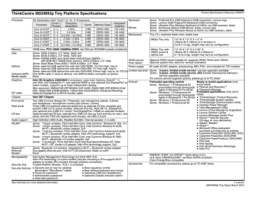 ThinkCentre M93/M93p Tiny Platform Specifications Processor Product Specifications Reference (PSREF) 4th Generation Intel Core™ i3 / i5 / i7 Processors Processor Core i3-4150T Core i3-4130T Core i5-4570T Core i5-4590T Core i7-4765T Core i7-4785T Cores / Frequency Threads (Base/Max) 2/4 3 GHz 2/4 2.9 GHz 2 / 4 2.9 GHz / 3.6 GHz 4/4 2 GHz / 3 GHz 4/8 2 GHz / 3 GHz 4 / 8 2.2 GHz / 3.2 GHz Keyboard Cache Memory Types 3 MB 3 MB 4 MB 6 MB 8 MB 8 MB DDR3-1600 DDR3-1600 DDR3-1600 DDR3-1600 DDR3-1600 DDR3-1600 Integrated Graphics HD 4400 HD 4400 HD 4600 HD 4600 HD 4600 HD 4600 Memory 16GB max, PC3-12800 1600MHz DDR3, two 204-pin SODIMM sockets (notebook) Disk Some: SATA 3.0Gb/s, 2.5" Wide, 5400 rpm Some:SATA 6.0Gb/s, 2.5" Wide, 7200 rpm Some:500GB (5400 rpm) Solid State Hybrid Drive (SSHD) / with 8GB MLC NAND flash memory, SATA 6.0Gb/s, 2.5" wide Some:Solid State Drive (SSD) / SATA 6.0Gb/s, 2.5" Wide Some:external USB optical box with slim DVD-ROM, 12.7mm high, tray-in Some:external USB optical box with slim DVD±RW, 12.7mm high, tray-in Some:external USB optical box with slim DVD±RW, 9.5mm high, tray-in, for TIO 23 One SATA cable (1-drop to device), one SATA 6.0Gb/s connector on planar None Intel HD Graphics 4400/4600 in processor, uses main memory, DirectX 11, one VGA, one DisplayPort, one optional HDMI or one optional 2nd DisplayPort on select models, supports up to triple independent display; Max resolution:3840x2160 (DP)@60Hz [HD 4x00]; 2560x1600 (DP)@60Hz [Intel HD]; 1920x1080 (HDMI)@60Hz; 1920x1200 (VGA)@60Hz (Reduced Blanking) Optional DisplayPort to DVI-D monitor cable Intel Q87 Chipset Optical Onboard SATA Media reader Graphics DP cable Chipset Front ports Rear ports I/O box Audio support WLAN13 Bluetooth Ethernet Modem Manageability Mouse Mechanical VESA mount Floor Stand Power supply Some: Preferred Pro USB Keyboard (USB connector), Lenovo logo Some: Lenovo USB Fingerprint Keyboard (USB connector) Some: Ultraslim Plus Wireless Keyboard (2.4GHz via USB receiver), black Some: Enhanced Optical USB Mouse, black, Lenovo logo Some: Ultraslim Plus Wireless Mouse (2.4GHz via USB receiver), black Tiny (1L), business black color; metal case M93/p Tiny only 7.0" W X 7.2" D X 1.4" H 179mm W X 182mm D X 34.5mm H 2.9 lb (1.3 kg), weight may vary by configuration M93/p Tiny with VESA mount & optical box 7.2" W X 7.2" D X 2.55" H 184mm W X 182mm D X 65mm H 5.1 lb (2.3 kg), weight may vary by configuration Optional VESA mount bracket kit, supports VESA 75mm and 100mm Optional system floor stand for vertical orientation 65 watts AC/DC adapter, autosensing, 88% PSU (not included for TIO models) Limited warranty3 Some: 3-years, limited onsite service / service upgrades available Some: 3-years, limited onsite service, OID (Onsite International Delivery) / service upgrades available For Lenovo service upgrade options, please go to S-TC sheet Preload Preloaded operating system Ready to install applications (only Some: Windows 7 Professional 64 some listed) preinstalled through downgrade ● Rescue and Recovery ● Password Manager rights in Windows 8 Pro 64-bit Some: Windows 7 Professional 64 Preloaded applications (only some preinstalled through downgrade listed) rights in Windows 8.1 Pro 64-bit ●ThinkVantage Product Recovery ● ThinkVantage System Update Some: Windows 7 Professional 32 Two USB 3.0 (one Always On / Powered), one microphone (stereo, 3.5mm), ● ThinkVantage Communication Utility Some: Windows 7 Professional 64 one headphone / microphone combo jack (stereo, 3.5mm) ● Desktop Power Manager Three USB 3.0 (optional external optical box or external I/O box occupies one ● View Management Utility specific USB 3.0 on some models), ethernet (RJ-45), VGA DB-15, DisplayPort , ● Lenovo Cloud Storage by SugarSync one optional port (USB 2.0 / serial / 2nd DisplayPort / HDMI on selected models) ● Lenovo Solution Center Optional external I/O box, extends four USB 2.0 (two on front and two on rear), one ● Lenovo Message Center Plus serial, and two PS/2 (for keyboard and mouse), via USB 3.0 port ●Norton Internet Security High Definition (HD) Audio, Realtek ALC283 / internal speaker (1.5 watt) (30 days of virus definitions) ●Adobe Reader Some: 11b/g/n wireless, PCIe Half Mini Card, Intel Centrino Wireless-N 105, 1x1 ●Skype Some: 11b/g/n wireless, PCIe Half Mini Card, Intel Centrino Wireless-N 2230, ● Microsoft Office preloaded; Wi-Fi + Bluetooth combo adapter, 2x2 purchase a product key to activate Some: 11a/b/g/n wireless, PCIe Half Mini Card, Intel Centrino Advanced-N 6235, ● Cyberlink PowerDVD (DVD±RW, DVD) Wi-Fi + Bluetooth combo adapter, Intel vPro technology support, 2x2 ● Cyberlink Power2Go (DVD±RW) Some: 11b/g/n wireless, PCIe Half Mini Card, Intel Centrino Wireless-N 7260, ● Cyberlink PowerProducer (DVD±RW) Wi-Fi + Bluetooth 4.0 combo adapter, 2x2 ●Evernote Some: 11ac/a/b/g/n, PCIe Half Mini Card,Intel Dual Band Wireless-AC 7260, ● Intel AppUp Wi-Fi + BT combo 4.0 adapter, Intel vPro technology support, 2x2 ● Intel Small Business Advantage Some: Bluetooth 4.0 wireless, integrated in Wi-Fi + Bluetooth combo adapter ● Nitro Pro One gigabit ethernet port, Intel I217-LM (Clarkville), Wake on LAN None Environment ENERGY STAR 6.0; EPEAT Gold rating (U.S.);; Intel Active Management Technology 9.0 (Intel AMT 9.0); ULE Gold; GREENGUARD certified; RoHS-compliant; Intel vPro technology on some models (require choosing a vPro-support Wi-Fi Cisco EnergyWise compatible adapter to enable vPro function through wireless connection) Accessories For compatible accessories, please go to TC-AQP sheet Trusted Platform Module, TCG 1.2-compliant Security chip Security features ● Security slot (in rear for optional Kensington MicroSaver cable) ● Power-on password ● Administrator password ● Hard disk password See footnotes for more detailed information ● Boot sequence control ● Boot without keyboard and mouse ● Individual USB port disablement ● Optional Chassis intrusion