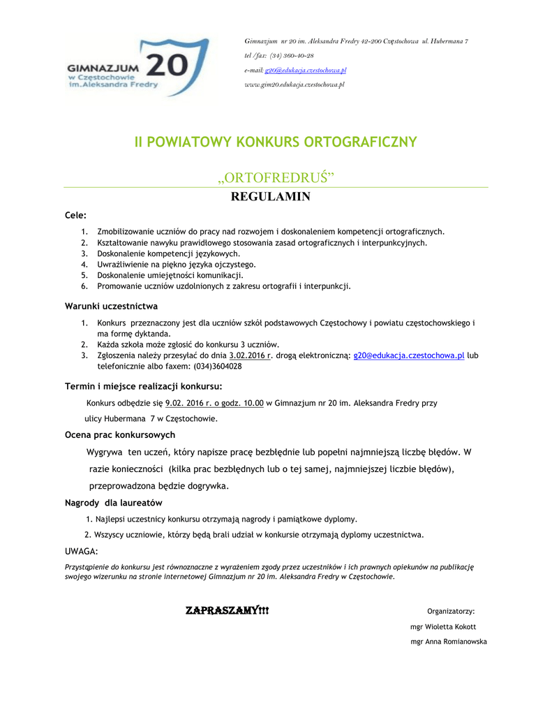 Gimnazjum nr 20 im. Aleksandra Fredry 42-200 Częstochowa ul. Hubermana 7 tel /fax: (34) 360-40-28 e-mail: [email protected] www.gim20.edukacja.czestochowa.pl II POWIATOWY KONKURS ORTOGRAFICZNY „ORTOFREDRUŚ” REGULAMIN Cele: 1. 2. 3. 4. 5. 6. Zmobilizowanie uczniów do pracy nad rozwojem i doskonaleniem kompetencji ortograficznych. Kształtowanie nawyku prawidłowego stosowania zasad ortograficznych i interpunkcyjnych. Doskonalenie kompetencji językowych. Uwrażliwienie na piękno języka ojczystego. Doskonalenie umiejętności komunikacji. Promowanie uczniów uzdolnionych z zakresu ortografii i interpunkcji. Warunki uczestnictwa 1. 2. 3. Konkurs przeznaczony jest dla uczniów szkół podstawowych Częstochowy i powiatu częstochowskiego i ma formę dyktanda. Każda szkoła może zgłosić do konkursu 3 uczniów. Zgłoszenia należy przesyłać do dnia 3.02.2016 r. drogą elektroniczną: [email protected] lub telefonicznie albo faxem: (034)3604028 Termin i miejsce realizacji konkursu: Konkurs odbędzie się 9.02. 2016 r. o godz. 10.00 w Gimnazjum nr 20 im. Aleksandra Fredry przy ulicy Hubermana 7 w Częstochowie. Ocena prac konkursowych Wygrywa ten uczeń, który napisze pracę bezbłędnie lub popełni najmniejszą liczbę błędów. W razie konieczności (kilka prac bezbłędnych lub o tej samej, najmniejszej liczbie błędów), przeprowadzona będzie dogrywka. Nagrody dla laureatów 1. Najlepsi uczestnicy konkursu otrzymają nagrody i pamiątkowe dyplomy. 2. Wszyscy uczniowie, którzy będą brali udział w konkursie otrzymają dyplomy uczestnictwa. UWAGA: Przystąpienie do konkursu jest równoznaczne z wyrażeniem zgody przez uczestników i ich prawnych opiekunów na publikację swojego wizerunku na stronie internetowej Gimnazjum nr 20 im. Aleksandra Fredry w Częstochowie. Zapraszamy!!! Organizatorzy: mgr Wioletta Kokott mgr Anna Romianowska Gimnazjum nr 20 im. Aleksandra Fredry 42-200 Częstochowa ul. Hubermana 7 tel /fax: (34) 360-40-28 e-mail: [email protected] www.gim20.edukacja.czestochowa.pl LISTA UCZESTNIKÓW POWIATOWEGO KONKURSU „Ortofredruś” Szkoła Podstawowa nr 12 opiekun: mgr Agnieszka Frejlich 1. Dominik Kubat 2. Marcek Szkop Szkoła Podstawowa nr 24 3. Martyna Frączyńska 4. Jakub Rzeszut 5. Karolina Kopytko Szkoła Podstawowa nr 25 opiekun: mgr Bożena Kukuła opiekun: mgr Mariola Kocik 6. Wiktoria Motyl 7. Łukasz Rogalski 8. Weronika Wołowiec Szkoła Podstawowa nr 42 opiekun: mgr Joanna Sączek Gimnazjum nr 20 im. Aleksandra Fredry 42-200 Częstochowa ul. Hubermana 7 tel /fax: (34) 360-40-28 e-mail: [email protected] www.gim20.edukacja.czestochowa.pl 9. Jakub Błaszczyk 10. Mikołaj Trębski Szkoła Podstawowa nr 52 opiekun: mgr Małgorzata Piekarczyk 11. Julia Kurzacz 12. Paulina Matusiak 13. Marcel Zębik Szkoła Podstawowa w Jaskrowie 14. Maciej Siwek 15. Aleksandra Szuba 16. Wiktoria Zamrzycka opiekun: mgr Beata Ślęzak