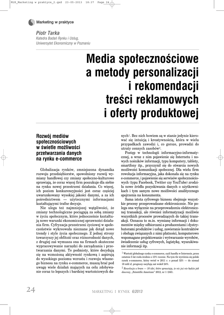 MiR_Marketing w praktyce_2.qxd 23-05-2013 18:37 Page 24 Marketing w praktyce Piotr Tarka Katedra Badań Rynku i Usług, Uniwersytet Ekonomiczny w Poznaniu Media społecznościowe a metody personalizacji i rekomendacji treści reklamowych i oferty produktowej Rozwój mediów społecznościowych w świetle możliwości przetwarzania danych na rynku e-commerce Globalizacja rynków, zmniejszona dynamika rozwoju przedsiębiorstw, spowolniony rozwój wymiany handlowej czy zmiany społeczno-kulturowe sprawiają, że coraz więcej firm poszukuje dla siebie na rynku nowej przestrzeni działania. Co więcej, ich poziom konkurencyjności jest coraz częściej uwarunkowany wysokiej jakości danymi, a za ich pośrednictwem — użytecznymi informacjami kształtującymi trafne decyzje. Nie ulega też najmniejszej wątpliwości, że zmiany technologiczne pociągają za sobą zmiany w życiu społecznym, które jednocześnie kształtują nowe warunki ekonomicznej sprawności działania firm. Cyfryzacja przestrzeni życiowej w społeczeństwie wykreowała nieznane jak dotąd nowe trendy i style życia społecznego. Z jednej strony towarzyszy jej obfitość oraz różnorodność danych, z drugiej zaś wymusza ona na firmach skuteczne wypracowywanie narzędzi do zarządzania i przetwarzania danymi. Te podmioty, które decydują się na wzmożoną aktywność rynkową i aspirują do wysokiego poziomu wzrostu i rozwoju własnego biznesu na rynku e-commerce, muszą brać pod uwagę wiele działań mających na celu zdobywanie coraz to lepszych i bardziej wartościowych da- 24 nych1. Bez nich bowiem są w stanie jedynie kierować się intuicją i kreatywnością, która w wielu przypadkach zawodzi i, co gorsze, prowadzi do utraty cennych zasobów2. Postęp w technologii informacyjno-informatycznej, a wraz z nim pojawienie się Internetu i nowych nośników informacji, typu komputery, tablety, smartfony itp., przyczynił się do otwarcia nowych możliwości komunikacji społecznej. Dla wielu firm rewolucja informacyjna, jaka dokonała się na rynku e-commerce, i pojawienie się serwisów społecznościowych (typu Facebook, Twitter czy YouTube) zrodziła nowe źródła pozyskiwania danych o użytkownikach i tym samym nowe możliwości analitycznego spojrzenia na konsumenta. Sama istota cyfrowego biznesu obejmuje wszystkie procesy przeprowadzane elektronicznie. Nie polega ona wyłącznie na przeprowadzeniu elektronicznej transakcji, ale również informatyzacji możliwie wszystkich procesów prowadzących do takiej transakcji. Oznacza to m.in. wymianę informacji i dokumentów między odbiorcami a producentami i dystrybutorami produktów i usług, zawieranie kontraktów i obsługę związanych z nimi płatności, komputerowo wspomagane projektowanie i wytwarzanie wyrobów, świadczenie usług cyfrowych, logistykę, wyszukiwanie informacji itp. 1 Wartość globalnego rynku e-commerce, czyli handlu w Internecie, przez ostatnie 5 lat rosła średnio o 13% rocznie. Na tym tle wyróżnia się polski rynek e-commerce, który wrósł w 2011 r. o ponad 32% — do niemal 18 mld zł, prognozy oscylują zaś wokół 24%. 2 Rewolucja u bram — 10 idei, które sprawiają, że nic już nie będzie jak dawniej, „Scientific American” 2012, nr 1 (245). MARKETING I RYNEK 6/2013 MiR_Marketing w praktyce_2.qxd 23-05-2013 18:53 Page 25 Marketing w praktyce Rysunek 1. Determinanty rozwoju rynku mediów społecznościowych w Polsce % 31 29 19 Oszczędności Wzrost i rozwój rynku mobilnego i klasycznego Internetu Bezpieczeństwo 10 Coraz większa ilość danych 7 Regulacje prawne 4 Przepustowość sieci Ź r ó d ł o: opracowanie na podstawie raportu Information Management and Analytics Consulting Marketplace: Key Trends, Profiles and Forecasts, Kennedy Consulting Research and Advisory 2012. Rysunek 2. Różnorodne formy danych Dane numeryczne (np. tabele, rekordy) i tekstowe Dane audiowizualne (np. ludzki język, kamery, mikrofony, aparaty fotograficzne, fotokomórki) Dane z mediów społecznościowych (e-mail, blogi itp.) Dane z systemów komputerowych (np. cookies) i przepływów użytkowników po różnych stronach internetowych Dane przestrzenne (mapy, systemy nawigacyjne GPS) Dane generowane przez inne urządzenia (bankomaty, skanery — point of sales, telefony komórkowe — smartfony itp.) Odpowiedzi wielokrotne. Ź r ó d ł o: opracowanie na podstawie raportu Big Data Analytics Trends — TDWI Best Practices Report, TDWI Research group 2012. MARKETING I RYNEK 6/2013 25 MiR_Marketing w praktyce_2.qxd 23-05-2013 18:37 Page 26 Marketing w praktyce Niestety, media społecznościowe podnoszą bardzo wysoko poprzeczkę utrzymania w firmach umiejętności analitycznych u ludzi w sferze optymalnego łączenia różnych zbiorów danych (tj. ich logicznego przełożenia na język użytkowników). Powiększają także coraz bardziej potrzeby inwestycyjne firm, wynikające z modernizacji lub zakupu nowoczesnych technologii, tj. systemów informacyjnych, hurtowni baz danych czy oprogramowania do analizy danych3. Bezpieczeństwo danych gromadzonych przez portale społecznościowe — przypadek Facebooka Ingerencja w zbyt szeroki zakres danych demograficzno-psychograficznych przez media społecznościowe może budzić niekiedy niepokój. Pozostaje także nierozwiązany problem zapewnienia bezpieczeństwa, a tym samym zachowania wystarczającego systemu ochrony prywatności danych osób, które te dane dostarczają. Na przykład na portalu społecznościowym Facebook, możemy uzyskać dostęp do danych personalnych, takich jak e-maile, komentarze, preferencje produktowe, osobiste fotografie itp. Facebook ma dostęp do wielu danych i jest w stanie zaprojektować eksperymenty analityczne z uwzględnieniem blisko 900 mln użytkowników. Oczywiście firma nie może udostępniać danych firmom zewnętrznym na temat pojedynczych użytkowników portalu. Stąd te, które współpracują z Facebookiem, z teoretycznego punktu widzenia mogą si