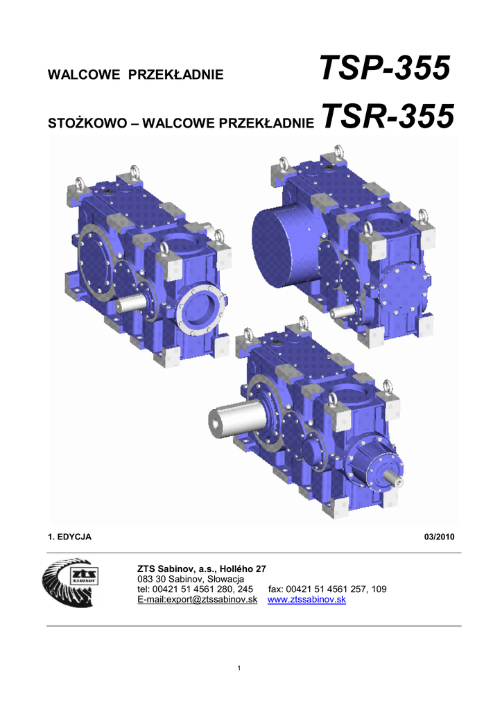 TSP-355 STOŻKOWO – WALCOWE PRZEKŁADNIE TSR-355 WALCOWE PRZEKŁADNIE 1. EDYCJA 03/2010 ZTS Sabinov, a.s., Hollého 27 083 30 Sabinov, Słowacja tel: 00421 51 4561 280, 245 fax: 00421 51 4561 257, 109 E-mail:[email protected] www.ztssabinov.sk 1 Szanowni Państwo, Katalog handlowy który przedstawiamy inżynierom i technikom specjalistom z branży przemysłowej, przedstawia długoletnie doświadczenia w dziedzinie produkcji i wdrażania napędów. Nasz zespół specjalistów zgromadził w latach ubiegłych specyficzne wymagania, rady i zalecenia naszych klientów, a wynikiem jest przedstawiany oferowany asortyment wyrobów. Wierzymy, że znajdzie on zastosowanie w naszej dotychczasowej i ewentualnej przyszłej współpracy i partnerstwie. Pozwólcie nam państwo we wstępie udzielić kilka podstawowych informacji o naszej spółce. ZTS Sabinov jest spółką akcyjną działającą w przemyśle maszynowym, założoną w 1957 roku. Przeważającą częścią produkcji zakładu są przekładnie. Na dzień dzisiejszy ZTS Sabinov produkuje następujące typy przekładni: walcowe stożkowe stożkowo-walcowe ślimakowe planetarne Przekładnie są produkowane w typowych wariantach jako standartowe – katalogowe z szerokim zastosowaniem w przemyśle. Oprócz nich oferujemy przekładnie do specjalnego zastosowania podzielone na następujące grupy: § § § § § § przekładnie napędu bębna samochodowej mieszarki betonu, stacjonarne mieszarki przekładnie dla taśmociągów górniczych przekładnie dla chłodni kominowych przekładnie – rozdzielcze dla maszyn budowlanych przekładnie – wciągarki przeznaczone do podnoszenia platform wagonów w transporcie kolejowym inne Dużą grupę tworzą przekładnie projektowane i produkowane według życzenia klienta, ewentualnie według technicznej dokumentacji klienta. Terytorium eksportu Produkty firmy producenta eksportowane są do Stanów Zjednoczonych, Niemiec, Czech, Anglii, Irlandii, Holandii, Polski, państw bywałego Związku Radzieckiego, Węgier, Hiszpanii, Włoch, Egiptu, Syrii, Indii, Arabskich Emiratów, Tajwanu, Tajlandii, itd. Przekładnie są również eksportowane pośrednio, tzn. poprzez dostawców inwestycji ( technologii) takich jak: cukrownie zakłady metalurgiczne, cementownie, zakłady ceramiczne, elektrownie itp., jak również jako części urządzeń finalizowanych w wyżej wspominanych inwestycjach i technologiach. Jakość W 1997 roku był wprowadzony system sterowania jakości według normy EN ISO 9001, od roku 2003 posiadamy również certyfikat ekologii EN14001. Podstawowe informacje kontaktowe Adres: ZTS Sabinov, a.s., Hollého 27, 083 30 Sabinov, Republika Słowacja Tel.: 00421 51 4561280, 4561245 E-mail: [email protected] Fax: 00421 51 4561109, 4561257 Internet:http://www.ztssabinov.sk 2 1. WSTĘP Handlowy katalog zawiera: 2 – stopniowe walcowe przekładnie TSP 2 : § z osiową odległością wyjściowego stopnia a=355 § z zakresem przełożeń: od 5 do 31,5 § z zakresem mocy: 102 do 1039 kW. § § § 3 – stopniowe walcowe przekładnie TSP3: z osiową odległością wyjściowego stopnia a = 355 z zakresem przełożeń: od 20 do 125 z zakresem mocy: 34 do 464 kW. § § § 3 – stopniowe walcowe przekładnie TSR3: z osiową odległością wyjściowego stopnia a =355 z zakresem przełożeń: 20 od 20 do 125 z zakresem mocy: 34 do 470 kW. W dyspozycji są przekładnie w dwóch wykonaniach: a. z pełnym wyjściowym wałem. b. z drążonym wyjściowym wałem i: - zaciskowym sprzęgłem na wyjściowym wale - walcowym wieloklinowym otworem - stożkowym wieloklinowym otworem - walcowym otworem i klinowaniem ewolwentowym Konstrukcja przekładni jest przygotowana do pracy w ciężkich warunkach i środowisku z niebezpieczeństwem wybuchu jakie występuje w górnictwie. Warunki te spełniają: odlewy korpusu i pokrywy, cieplnie obrabiane wały oraz uzębienie. Łożyska i labiryntowe uszczelnienia kombinowane z uszczelnieniami gumowymi dostarczane są przez renomowane firmy. Stożkowe uzębienie jest nawęglane i hartowane. Walcowe uzębienie jest nawęglane, hartowane i szlifowane. Korpus i pokrywa obudowy są odlewami. Odlewy są wykonane o chropowatości powierzchni Rz=100 co umożliwia lekkie czyszczenie powierzchni korpusu. Smarowanie przekładni jest zagwarantowane rozpryskiem od kół uzębienia. Chłodzenie przekładni może być przeprowadzone poprzez odprowadzenie ciepła przez ściany korpusu przekładni, ewentualnie dodatkowym chłodzeniem. W przypadku zastosowania przekładni do napędu przenośników pracujących pod kątem można do konstrukcji przekładni umieścić mechanizm sprzęgła jednokierunkowego, który przeciwdziała cofaniu się przekładni. Wszystkie przekładnie mogą być dodatkowo wyposażone w : - w układ chłodzący – jest on zależny od przenoszonych obciążeń:: § chłodzenie wentylatorem na wale wejściowym - wentylator zabezpiecza lepszy przepływ powietrza dookoła przekładni czym zlepsza odprowadzanie ciepła przez ściany przekładni. § chłodzenie oleju systemem wodnym wmontowanym do przekładni - w takim przypadku w przekładniach są umieszczone poskręcane rurki chłodzące, które służą do doprowadzenia i odprowadzenia wody chłodniczej. § chłodzenie oleju zewnętrznym obiegiem – zewnętrzna chłodnica. - z przekładni pompowany jest ciepły olej do chłodnicy, gdzie obniża się temperatura oleju, a chłodny olej jest następnie pompowany z powrotem do przekładni. - wstępne zagrzanie oleju - przy temperaturach otoczenia niższych niż + 5 oC zabezpiecza się oszczędny rozruch przekładni. - urządzenie uniemożliwiające zwrotny bieg przekładni (urządzenie zabezpieczające) - Monitoring przekładni. Dla zabezpieczenia monitorowania pracy przekładni można przekładnie wyposażyć w otwory 3 ( wykonane według życzenia klienta) dla podłączenia: sygnalizacji przepływu oleju, czujnika wibracji, czujnika temperatury korpusu skrzyni, czujnika temperatury