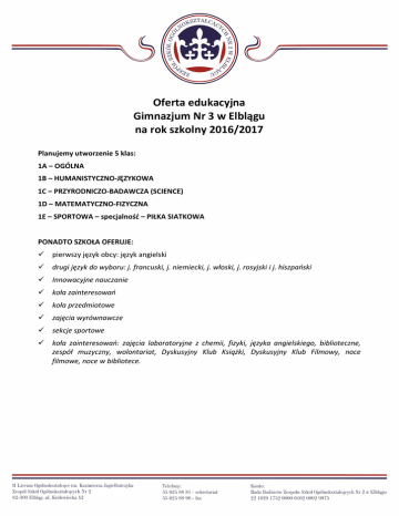 Oferta edukacyjna Gimnazjum Nr 3 w Elblągu na rok szkolny 2016/2017 Planujemy utworzenie 5 klas: 1A – OGÓLNA 1B – HUMANISTYCZNO-JĘZYKOWA 1C – PRZYRODNICZO-BADAWCZA (SCIENCE) 1D – MATEMATYCZNO-FIZYCZNA 1E – SPORTOWA – specjalność – PIŁKA SIATKOWA PONADTO SZKOŁA OFERUJE: pierwszy język obcy: język angielski drugi język do wyboru: j. francuski, j. niemiecki, j. włoski, j. rosyjski i j. hiszpański Innowacyjne nauczanie koła zainteresowań koła przedmiotowe zajęcia wyrównawcze sekcje sportowe koła zainteresowań: zajęcia laboratoryjne z chemii, fizyki, języka angielskiego, biblioteczne, zespół muzyczny, wolontariat, Dyskusyjny Klub Książki, Dyskusyjny Klub Filmowy, noce filmowe, noce w bibliotece. NASZE MOCNE STRONY: jesteśmy „ZŁOTYM GIMNAZJUM” (II miejsce) w województwie; należymy do elitarnego grona Szkół Odkrywców Talentów, bo stwarzamy przyjazne warunki dla rozwoju osobowości i zainteresowań; współpracujemy z uczelniami wyższymi i instytucjami naukowo-badawczymi; mamy bardzo wysokie wyniki w egzaminie gimnazjalnym w Elblągu; dbamy o rozwój każdego ucznia, mamy dodatnie wskaźniki EWD, mieszczące się w przedziale „SZKOŁY SUKCESU”; wśród naszych uczniów są bardzo liczni laureaci i finaliści wojewódzkich konkursów przedmiotowych i olimpiad ogólnopolskich; rywalizujemy również w sporcie – należymy do ministerialnego programu Siatkarskich Ośrodków Szkolnych; indywidualizujemy proces nauczania; gwarantujemy stałe zajęcia reedukacyjne dla osób z dysleksją i dysgrafią oraz rewalidacyjne; zapewniamy fachową pomoc psychologa i pedagoga; zapewniamy możliwość zdobywania rzetelnej wiedzy; staramy się wzbogacać program nauczania poprzez spotkania z ludźmi kultury, nauki i sztuki, lekcje w muzeach, wycieczki krajowe i zagraniczne, wymiana młodzieży; zapewniamy poszerzony program o charakterze kulturowym - koncerty, kino, teatr; jesteśmy szkołą proekologiczną: otrzymaliśmy certyfikat „SZKOŁY PRZYJAZNEJ ŚRODOWISKU” i GEOCERTYFIKAT; zostaliśmy wyróżnieni za Doskonałość Zarządzania Warmińsko-Mazurskiej Nagrody Jakości; gwarantujemy dobre warunki lokalowe, estetycznie urządzone wnętrza, nowocześnie wyposażone pracownie, w tym dwa laboratoria chemiczne, dwie pracownie fizyczne, dwie pracownie biologiczne, trzy wielostanowiskowe pracownie multimedialne, laboratorium językowe; dbamy o bezpieczeństwo uczniów, co potwierdza certyfikat Warmińsko-Mazurskiego Kuratora Oświaty: Szkoła Promująca Bezpieczeństwo oferujemy funkcjonalne i estetyczne szafki szkolne; mamy dobre warunki do uprawiania sportu: sala gimnastyczna, hala sportowa z boiskiem wielofunkcyjnym, boisko trawiaste do piłki nożnej, specjalistyczny sprzęt do uprawiania piłki siatkowej; na terenie szkoły znajduje się ścieżka dendrologiczna, park petrograficzny i zielony teren rekreacyjny; Czekamy na Ciebie
