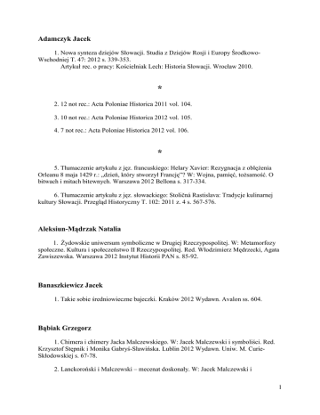 Adamczyk Jacek 1. Nowa synteza dziejów Słowacji. Studia z Dziejów Rosji i Europy ŚrodkowoWschodniej T. 47: 2012 s. 339-353. Artykuł rec. o pracy: Kościelniak Lech: Historia Słowacji. Wrocław 2010. * 2. 12 not rec.: Acta Poloniae Historica 2011 vol. 104. 3. 10 not rec.: Acta Poloniae Historica 2012 vol. 105. 4. 7 not rec.: Acta Poloniae Historica 2012 vol. 106. * 5. Tłumaczenie artykułu z jęz. francuskiego: Helary Xavier: Rezygnacja z oblęŜenia Orleanu 8 maja 1429 r.: „dzień, który stworzył Francję”? W: Wojna, pamięć, toŜsamość. O bitwach i mitach bitewnych. Warszawa 2012 Bellona s. 317-334. 6. Tłumaczenie artykułu z jęz. słowackiego: Stoličná Rastislava: Tradycje kulinarnej kultury Słowacji. Przegląd Historyczny T. 102: 2011 z. 4 s. 567-576. Aleksiun-Mądrzak Natalia 1. śydowskie uniwersum symboliczne w Drugiej Rzeczypospolitej. W: Metamorfozy społeczne. Kultura i społeczeństwo II Rzeczypospolitej. Red. Włodzimierz Mędrzecki, Agata Zawiszewska. Warszawa 2012 Instytut Historii PAN s. 85-92. Banaszkiewicz Jacek 1. Takie sobie średniowieczne bajeczki. Kraków 2012 Wydawn. Avalon ss. 604. Bąbiak Grzegorz 1. Chimera i chimery Jacka Malczewskiego. W: Jacek Malczewski i symboliści. Red. Krzysztof Stępnik i Monika Gabryś-Sławińska. Lublin 2012 Wydawn. Uniw. M. CurieSkłodowskiej s. 67-78. 2. Lanckoroński i Malczewski – mecenat doskonały. W: Jacek Malczewski i 1 symboliści. Red. Krzysztof Stępnik i Monika Gabryś-Sławińska. Lublin 2012 Wydawn. Uniw. M. Curie-Skłodowskiej s. 25-32. Biedrzycka Agnieszka 1. Kalendarium Lwowa 1918-1939. Kraków 2012 Tow. Autorów i Wydawców Prac Naukowych Universitas ss. XV, 1161. * 2. Szeliga (Scheliga, Seliga) Jan (zm. ok. 1620). W: Polski słownik biograficzny. T. 48 z. 1(196) s. 2-4. Warszawa-Kraków 2011 Instytut Historii PAN. Wspólnie z: Petryshak Bohdana. 3. Szembek Aleksander h. własnego (1596-1654). W: Polski słownik biograficzny. T. 48 z. 1(196) s. 23-27. Warszawa-Kraków 2011 Instytut Historii PAN. 4. Szemberk (Szemberg) Michał Krzysztof h. własnego (zm. 1659). W: Polski słownik biograficzny. T. 48 z. 1(196) s. 133-134. Warszawa-Kraków 2011 Instytut Historii PAN. Wspólnie z: Dmochowski Piotr Andrzej. Boćkowski Daniel 1. Sądownictwo pod znakiem sierpa i młota – Sowieckie orzecznictwo sądowe na okupowanych terenach wschodnich II Rzeczpospolitej. W: Przemoc i dzień powszedni w okupowanej Polsce. Red. Tomasz Chinciński. Gdańsk 2011 Wydawn. Oskar s. 210-220. 2. Urteilen im Zeichen von Hammer und Sichel. Die sowjetische Rechtsprechung in den besetzten Ostgebieten der Zweiten Polnischen Republik (Kresy). W: Gewalt und Alltag im besetzten Polen 1939-1945. Hrsg. Jochen Böhler, Stephan Lehnstaedt. Osnabrück 2012 Fibre Verlag s. 33-44. * 3. Pro memoria: Tadeusz Kisielewski. Studia z Dziejów Rosji i Europy ŚrodkowoWschodniej T. 47: 2012 s. 7-8. 2 Borejsza Jerzy 1. Red.: The Crimean War 1853-1856. Colonial Skirmish or Rehearsal for World War? Empires, Nations, and Individuals. Ed. ... Warszawa 2011 Wydawn. Neriton, Instytut Historii PAN ss. 536. Materiały z konferencji, która odbyła się w Warszawie w Instytucie Historii PAN w październiku 2007 r. Przedruk rosyjskojęzycznej części ksiąŜki ukazał się pt.: The Russian Empire and the Crimean War w czasopiśmie Russian Studies in History Vol. 51: 2012 no 1 s. 1- 96. * 2. Crimean War 150 Years Later. W: The Crimean War 1853–1856. Colonial Skirmish or Rehearsal for World War? Empires, Nations, and Individuals. Ed. Jerzy W. Borejsza. Warszawa 2011 Wydawn. Neriton, Instytut Historii PAN s. 8-18. * 3. Przedmowa: W: Pichoja Rudolf G.: Historia władzy w Związku Radzieckim 19451991. Warszawa 2011 Wydawn. Naukowe PWN s. 11-15. Bracha Krzysztof 1. Tutissimum scutum w kazaniach maryjnych z tzw. kolekcji Piotra z Miłosławia (II poł. XV w.). W: Sic erat in fatis. Studia i szkice historyczne dedykowane Profesorowi Bogdanowi Rokowi. T. 1. Red. E. Kościk, R. śerelik, P. Badyna, F. Wolański. Toruń 2012 Wydawn. Adam Marszałek s. 127-148. * 2. Sprawozdanie pt.: Medieval Preaching: Texts-Attributions-Audience. Poland in a European Context 18-19 November 2011 - Report. Medieval Sermon Studies Vol. 56: 2012 s. 7-8. Brojer Wojciech 1. Współautor: Bertolt Brecht. Die Dreigroschenoper. Marian Bogusz. Warszawa 2012 Wydawn. Neriton ss. 108. Wspólnie z: Dąbek Agata. Wydanie w jęz. polskim ukazało się w 2011 r. 3 * 2. Teologia „Księgi światła ukrytego” (Sefer ha-bahir): Bukiet sukotowy. Cz. 2: Ciało, przestrzeń, szechina. Kwartalnik Historii śydów 2012 nr 243 s. 301-338. Brus Anna 1. Red.: Śliwowska Wiktoria: Historyczne peregrynacje. Szkice z dziejów Polaków i Rosjan w XIX wieku. Warszawa 2012 Instytut Historii PAN ss. 494, nlb. 1. Bukowski Waldemar 1. Współoprac. i red.: Słownik historyczno-geograficzny województwa krakowskiego w średniowieczu. Cz. IV, z. 3: Mieszczyński Staw - Mogilany. Pod red. ... Oprac. ... Kraków 2011 Wydawn. Tow. Naukowego „Societas Vistulana” ss. 244. Wspólnie z: Laberschek J., Marzec A., Mikuła M., Nabiałek K., Wolski M., Zdanek M. * 2. Über die Notwendigkeit und Methode der Herausgabe der Krakauer Landesgerichtsbücher. Randbemerkungen zur Vorbereitung des Krakauer Landgerichtsbuchs 2 aus den Jahren 1394-1397. W: Quellen kirchlicher Provenienz. Neue Editionsvorhaben und Aktuelle EDV-Projekte. Hrsg. von Helmut Flachenecker und Janusz Tandecki unter Mitarbeit von Krzysztof Kopiński. Toruń 2011 Tow. Naukowe w Toruniu, Uniw. M. Kopernika w Toruniu s. 289-332. Wspólnie z: Zdanek Maciej. * 3. Pro memoria: Janusz Kurtyka 1960-2010. W: Słownik historyczno-geograficzny województwa krakowskiego w średniowieczu. Cz. IV, z. 3: Mieszczyński Staw - Mogilany. Pod red. W. Bukowskiego. Oprac. W. Bukowski, J. Laberschek, A. Marzec, M. Mikuła, K. Nabiałek, M. Wolski, M. Zdanek Kraków 2011 Wydawn. Tow. Naukowego „Societas Vistulana” s. 3 okładki. 4 Bylina Stanisław 1. Drogi - granice - most. S