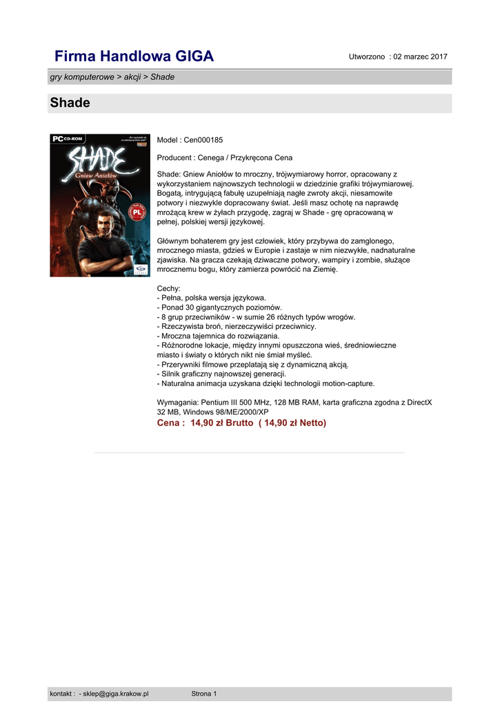Firma Handlowa GIGA Utworzono : 02 marzec 2017 gry komputerowe > akcji > Shade Shade Model : Cen000185 Producent : Cenega / Przykręcona Cena Shade: Gniew Aniołów to mroczny, trójwymiarowy horror, opracowany z wykorzystaniem najnowszych technologii w dziedzinie grafiki trójwymiarowej. Bogatą, intrygującą fabułę uzupełniają nagłe zwroty akcji, niesamowite potwory i niezwykle dopracowany świat. Jeśli masz ochotę na naprawdę mrożącą krew w żyłach przygodę, zagraj w Shade - grę opracowaną w pełnej, polskiej wersji językowej. Głównym bohaterem gry jest człowiek, który przybywa do zamglonego, mrocznego miasta, gdzieś w Europie i zastaje w nim niezwykłe, nadnaturalne zjawiska. Na gracza czekają dziwaczne potwory, wampiry i zombie, służące mrocznemu bogu, który zamierza powrócić na Ziemię. Cechy: - Pełna, polska wersja językowa. - Ponad 30 gigantycznych poziomów. - 8 grup przeciwników - w sumie 26 różnych typów wrogów. - Rzeczywista broń, nierzeczywiści przeciwnicy. - Mroczna tajemnica do rozwiązania. - Różnorodne lokacje, między innymi opuszczona wieś, średniowieczne miasto i światy o których nikt nie śmiał myśleć. - Przerywniki filmowe przeplatają się z dynamiczną akcją. - Silnik graficzny najnowszej generacji. - Naturalna animacja uzyskana dzięki technologii motion-capture. Wymagania: Pentium III 500 MHz, 128 MB RAM, karta graficzna zgodna z DirectX 32 MB, Windows 98/ME/2000/XP Cena : 14,90 zł Brutto ( 14,90 zł Netto) kontakt : - [email protected] Strona 1