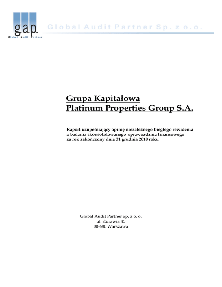Grupa Kapitałowa Platinum Properties Group S.A. Raport uzupełniający opinię niezależnego biegłego rewidenta z badania skonsolidowanego sprawozdania finansowego za rok zakończony dnia 31 grudnia 2010 roku Global Audit Partner Sp. z o. o. ul. Żurawia 45 00-680 Warszawa Raport uzupełniający opinię niezależnego biegłego rewidenta z badania skonsolidowanego sprawozdania finansowego Platinum Properties Group S.A.za rok zakończony dnia 31 grudnia 2010 roku 2 Spis treści A. CZĘŚĆ OGÓLNA .......................................................................................................................... 3 1. 2. 3. 4. 5. B. OCENA SYTUACJI MAJĄTKOWO-FINANSOWEJ ................................................................... 8 1. 2. 3. 4. 5. C. Ogólna charakterystyka Grupy Kapitałowej ....................................................................3 Informacje dotyczące zbadanego skonsolidowanego sprawozdania finansowego ....6 Informacje o sprawozdaniu finansowym jednostki za poprzedni rok obrotowy ........6 Dane identyfikujące podmiot uprawniony przeprowadzający badanie sprawozdania finansowego .................................................................................................7 Oświadczenia jednostki i dostępność danych ...................................................................7 Główne wielkości bezwzględne charakteryzujące Spółkę ..............................................8 Wskaźniki efektywności działania .....................................................................................8 Wskaźnik płynności ..............................................................................................................9 Wskaźniki rentowności ........................................................................................................9 Kontynuacja działalności .....................................................................................................9 CZĘŚĆ SZCZEGÓŁOWA .............................................................................................................. 9 1. Podstawy prawne wykorzystane przy badaniu ............................................................... 9 2. Prawidłowość i rzetelność dokumentacji konsolidacyjnej ............................................ 10 3. Elementy sprawozdania finansowego ............................................................................. 10 3.1 Informacje o wybranych, istotnych pozycjach rocznego skonsolidowanego sprawozdania z sytuacji finansowej .......................................................................................................................... 10 3.2 Informacje o wybranych pozycjach kształtujących wynik działalności gospodarczej .......... 10 3.3 Zestawienie zmian w skonsolidowanym kapitale własnym ............................................. 11 3.4 Sprawozdanie z przepływów pieniężnych ...................................................................... 11 3.5 Dodatkowe informacje i objaśnienia .............................................................................. 11 3.6 Sprawozdanie Zarządu z działalności ........................................................................... 11 3.7. Informacje o istotnych naruszeniach prawa ................................................................... 11 D. PODSUMOWANIE BADANIA .................................................................................................. 12 SKONSOLIDOWANE SPRAWOZDANIE FINANSOWE GRUPY ZA 2010 ROK ........................... 13 Raport uzupełniający opinię niezależnego biegłego rewidenta z badania skonsolidowanego sprawozdania finansowego Platinum Properties Group S.A.za rok zakończony dnia 31 grudnia 2010 roku A. CZĘŚĆ OGÓLNA 1. Ogólna charakterystyka Grupy Kapitałowej 3 Skład Grupy Kapitałowej Platinum Properties Group S.A. na dzień 31 grudnia 2010 roku przedstawia się następująco: - Platinum Properties Group S.A. – jednostka dominująca, - Platinum Elements Sp. z o.o. – jednostka zależna, w której Platinum Properties Group S.A. posiada na dzień 31 grudnia 2010 roku 100% kapitału zakładowego. Spółka ta podlega konsolidacji metodą pełną. - MYSQUARE.PL Sp. z o.o. – jednostka zależna, w której Platinum Properties Group S.A. posiada na dzień 31 grudnia 2010 roku 99,9% kapitału zakładowego. Spółka ta podlega konsolidacji metodą pełną. - InvestPoland Sp. z o.o. – jednostka zależna, w której Platinum Properties Group S.A. posiada na dzień 31 grudnia 2010 roku 100% kapitału zakładowego. Spółka ta podlega konsolidacji metodą pełną. - LLC Svetlie Dali – jednostka zależna prowadząca działalność według prawa rosyjskiego, w której Platinum Properties Group S.A. posiada na dzień 31 grudnia 2010 roku 100% kapitału zakładowego. Spółka ta podlega konsolidacji metodą pełną. - Brinando Investments Limited – jednostka zależna prawa cypryjskiego, w której Platinum Properties Group S.A. posiada na dzień 31 grudnia 2010 roku 100 % kapitału zakładowego. Spółka ta podlega konsolidacji metodą pełną. - Platinum Project I Sp. z o.o. – spółka zależna pośrednio. 100% udziałów na dzień 31.12.2010 r. jest w posiadaniu Spółki Brinando Investments Limited. - Platinum Hypo S.A. – spółka zależna pośrednio. 100% udziałów na dzień 31.12.2010 r. jest w posiadaniu Spółki Brinando Investments Limited. 1.1. Informacje o jednostce dominującej Platinum Properties Group Spółka Akcyjna (zwana dalej PPG S.A.) z siedzibą w Warszawie, przy al. Jerozolimskich 123A, została utworzona w drodze połączenia spółek Platinum Properties Sp. z o.o. oraz W-Link Sp. z o.o. na mocy uchwał podjętych przez Nadzwyczajne Zgromadzenie Wspólników każdej z łączących się spółek w dniu 01.08.2008 r. Ostatnia zmiana statutu miała miejsce w dniu 30.06.2009 roku aktem notarialnym Rep.A 4401/2009. W dniu 10 października 2008 roku Sp