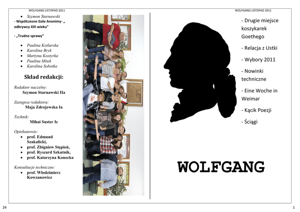 WOLFGANG LISTOPAD 2011 Szymon Starnawski - Współczesne Gale Anonimy- „ odkrywcy XXI wieku” - „Trudne sprawy” Paulina Kotlarska Karolina Bryk Martyna Kostyrka Paulina Mitek Karolina Sobotka Skład redakcji: Redaktor naczelny: Szymon Starnawski IIa Zastępca redaktora: Maja Zdrojewska Ia WOLFGANG LISTOPAD 2011 - Drugie miejsce koszykarek Goethego - Relacja z Ustki - Wybory 2011 - Nowinki techniczne - Eine Woche in Weimar - Kącik Poezji Technik: Mihai Suster Ic Opiekunowie: prof. Edmund Szakalicki, prof. Zbigniew Stępień, prof. Ryszard Szkutnik, prof. Katarzyna Konecka Konsultacje techniczne: prof. Włodzimierz Kowzanowicz 24 - Ściągi WOLFGANG 1 WOLFGANG LISTOPAD 2011 WOLFGANG LISTOPAD 2011 Wolfgang WSTĘPNIAK Witam Gorąco! Po niemal rocznej przerwie „Wolfgang” wraca do naszych czytelników wraz z nową redakcją. Odeszli starzy zaś przyszli nowi i zmotywowani do pracy felietoniści , dzięki którym, nasza gazetka stanie się główną lekturą naszych uczniów a może i nauczycieli. Goethe powiedział kiedyś „Cokolwiek potrafisz lub myślisz, że potrafisz, rozpocznij to. Odwaga ma w sobie geniusz, potęgę i magię.”. Te słowa natchnęły nas i dzięki nim stworzyliśmy takie działy jak „piątek weekendu początek” w którym to Ziemowit Kossakowski wraz ze swoją ekipą będzie nam proponował ciekawe zajęcia na weekendy, czy „ kącik podróżnika” gdzie Katarzyna Łaziuk będzie nam podsyłać pomysły na ciekawe wycieczki do miast polskich i nie tylko. Oczywiście nie zabraknie artykułów związanych ze szkołą i działu niemieckojęzycznego. Nowe działy połączone z nowym wyglądem gazetki to dopiero początek. Poza tym naszych czytelników czeka wiele nowych niespodzianek związanych z gazetką jak i rozwojem jej. Działy: - Kącik Poezji Maja Zdrojewska Paulina Kotlarska Marta Bardłowska Paulina Policewicz Ziemowit Piast Kossakowski Jacek Baliński - „Naszym okiem” Jan Wieczorek Ziemowit Piast Kossakowski - Dział Sportowy - Nowinki Techniczne Paweł Kamiński Mihai Suster Paweł Kamiński, Jacek Baliński Julia Gutowska Miłej lektury! - Kącik Podróżnika: Redaktor naczelny - Szymon Starnawski Katarzyna Łaziuk Paulina Policewicz Paweł Jastrzębski Wiktoria Warda - Bohater Miesiąca Maja Zdrojewska - „Perełki Goethego” Maja Zdrojewska - Z Życia Szkoły Szymon Starnawski Paweł Jastrzębski Jacek Baliński Julia Gutowska - „Piątek weekendu początek” 2 - Dział Niemieckojęzyczny Ewelina Kęcik - Ściągi 23 WOLFGANG LISTOPAD 2011 się, czym on w gruncie rzeczy jest. Mimo to żadnego boomu na ten gatunek w najbliższych latach nie przewiduję. Nasi rodzice wychowali się na Kabarecie Starszych Panów, ja na występach George'a Carlina, Łowcach.B... To zupełnie inny rodzaj humoru. Nie oznacza to bynajmniej, że głodni sukcesu młodzi komicy nie mają szansy się przebić. W końcu zawsze mogę się mylić... J.B.: Twierdzisz, że polska publika jest specyficzna - faktycznie aż tak źle jest z naszym poczuciem humoru, że bawi nas wyłącznie mieszanka śmiesznych imion, przekleństw, seksu (tudzież innych tzw. tematów tabu, które z tabu mają mało wspólnego) i topowych wydarzeń ze sceny politycznej? Z czego to może wynikać? P.Z.: Inżynier Mamoń z Rejsu trafnie powiedział, że lubi tylko piosenki, które już zna. Tak samo jest z żartami. Polacy boją się eksperymentów. Nie za bardzo wiedzą, jak się zachować, gdy – przykładowo – ktoś zaprezentuje czarny humor czy zacznie opowiadać dowcipy absurdalne. To jeszcze nas zwyczajnie przerasta. A że jako lud uciśniony lubimy śmiać się z władzy... Cóż, ja nie oglądam telewizji, ani nie śledzę na bieżąco informacji ze świata i mam się dobrze, w dodatku nie muszę udawać, że spuszczanie naszego kraju w sedesie rządzących mnie bawi. Lubię poszukiwanie, lubię innowacje, cenię kreatywność. Szkoda, że publika raczej tego nie oczekuje. Ale z drugiej strony... Może oni jeszcze po prostu nie znają alternatywy? Może trzeba im ją podetknąć pod nos i pokazać, że to nie tylko nie jest trujące, ale - o dziwo! - może także smakować? Autor: Jacek Baliński WOLFGANG LISTOPAD 2011 WSPÓŁCZESNE GALLE ANONIMY 1. „noc długich noży”- odbyła się w roku 1934. Polegała na niszczeniu polskiej inteligencji. 2. Kaper- bałtycki husarz 3. Kazimierz Pułaski współautor Konstytucji 3 maja, brał udział w powstaniu listopadowym. 4. Lelewel- poeta, zaistniał w cyganerii warszawskiej 5. Zygmunt Krasiński – działacz polityczny zwolennik rodzącego się w Polsce socjalizmu utopijnego ŚCIĄGI 1) kwadrat sumy (a+b)2 = a2 + 2ab + b2 2) kwadrat różnicy (a-b)2 = a2 - 2ab + b2 3) sześcian sumy (a+b)3 = a3 + 3a2b + 2 3 3ab + b 4) sześcian różnicy (a-b)3 = a3 - 3a2b + 3ab2 - b3 5) różnica kwadratów a2-b2=(a-b) . (a+b) 6) suma sześcianów a3 + b3 = (a+b) . (a2 - ab + b2) 7) różnica sześcianów a3 - b3 = (a - b) . (a2 + ab + b2) 8) kwadrat sumy trzech składników 2 2 2 2 (a+b+c) = a + b + c + 2ab + 2ac + 2bc Gazeta 22 Z ŻYCIA SZKOŁY DZIEŃ EDUKACJI NARODOWEJ Dzień Edukacji Narodowej, ustanowiony w 1773 przez Stanisława Augusta Poniatowskiego, obchodziliśmy w naszej szkole bardzo uroczyście. Oprócz ciepłych życzeń dla naszych wspaniałych nauczycieli z ust pierwszoklasistów padły jeszcze jedne ważne słowa. Słowa przysięgi. 14.10.11r po odśpiewaniu hymnu narodowego, unieśliśmy prawą rękę w górę patrząc dumnie na Polskie godło, obiecaliśmy, że nie zważając na trudy dzisiejszego świata, będziemy zgłębiać wiedzę i ćwiczyć nasze umiejętności, by w przyszłości godnie reprezentować imię naszej szkoły. Nie pozostaje więc nam nic innego, jak porzucić przyzwyczajenia gimnazjalne i zastosować się do reguł liceum. Dodatkową motywacją do działania było przemówienie Pani Dyrektor, która ostrymi słowami sprowadziła nas na ziemię. Wyniki, uzyskaliśmy w gimnazjum pozostawiają wiele do życze