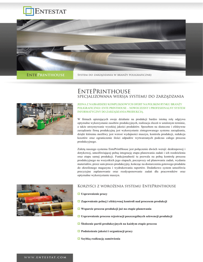 EntePrinthouse System do zarządzania w branży poligraficznej EntePrinthouse specjalizowana wersja systemu do zarządzania JEDNA Z NAJBARDZIEJ KOMPLEKSOWYCH OFERT NA POLSKIM RYNKU BRANŻY POLIGRAFICZNEJ: ENTE PRINTHOUSE – NOWOCZESNY I PROFESJONALNY SYSTEM INFORMATYCZNY DO ZARZĄDZANIA PRODUKCJĄ. W firmach opierających swoje działanie na produkcji bardzo istotną rolę odgrywa optymalne wykorzystanie zasobów produkcyjnych, realizacja zleceń w ustalonym terminie, a także utrzymywanie wysokiej jakości produktów. Sposobem na skuteczne i efektywne zarządzanie firmą produkcyjną jest wykorzystanie zintegrowanego systemu zarządzania, dzięki któremu możliwy jest wzrost wydajności maszyn, kontrola produkcji, redukcja kosztów oraz ograniczenie ilości odpadów wytwarzanych podczas całego procesu produkcyjnego. Zaletą naszego systemu EntePrintHouse jest połączenie dwóch wersji: desktopowej i dotykowej, umożliwiającej pełną integrację etapu planowania zadań i ich rozdzielenia oraz etapu samej produkcji. Funkcjonalność ta pozwala na pełną kontrolę procesu produkcyjnego na wszystkich jego etapach, począwszy od planowania zadań, wydania materiałów, przez sam proces produkcyjny, kończąc na dostarczeniu gotowego produktu do określonego magazynu i wydrukowaniu raportów. Dodatkowo system umożliwia precyzyjne zaplanowanie oraz rozdysponowanie zadań dla pracowników oraz optymalne wykorzystanie maszyn. Korzyści z wdrożenia systemu EntePrinthouse Usprawnienie pracy Zapewnienie pełnej i efektywnej kontroli nad procesem produkcji Wsparcie procesu produkcji już na etapie planowania Usprawnienie procesu rejestracji poszczególnych sekwencji produkcji Śledzenie partii produkcyjnych na każdym etapie procesu Podniesienie jakości i organizacji pracy Szybką realizację zamówienia w w w . e n t e s tat. c o m Funkcjonalności systemu Prosty interfejs doskonale dopasowany do procesu produkcji Interfejs uruchamiany jest na komputerze użytkownika lub może być obsługiwany za pomocą paneli dotykowych. Kompleksowe wsparcie dla zarządzania procesem produkcyjnym System sprawnie zarządza harmonogramem produkcji a także poszczególnymi jej etapami. Wzrost wydajności pracy, maszyn i urządzeń Aplikacja w sposób zaplanowany i kontrolowany pozwala na rejestrowanie informacji dotyczących wydajności i czasu pracy oraz parametrów maszyn i urządzeń wykorzystywanych do procesu produkcji. Możliwość ewidencji odpadów produkcyjnych System zbiera dane dotyczące ilości odpadów powstałych przy określonym zleceniu produkcyjnym. Pełną rejestrację i kontrolę materiałów i surowców Kluczową funkcją oprogramowania jest kontrolowanie, z jakich komponentów i surowców składa się realizowane zamówienie oraz ich odpowiedni dobór. Rejestracja i kontrola parametrów produkcyjnych System umożliwia monitoring i kontrolę procesu produkcji w czasie rzeczywistym. Skuteczną gospodarkę materiałów Oprogramowanie stwarza możliwość efektywnej gospodarki i zarządzania materiałami/surowcami/produktami w pomieszczeniach magazynowych jak i w czasie produkcji. Etykietowanie towarów System umożliwia znakowanie towarów odpowiednią etykietą wraz z kodem kreskowym celem ich identyfikacji. Oferta naszych rozwiązań Wdrożony przez nas system informatyczny stanowi idealne narzędzie integrujące wiedzę z zakresu produkcji, zarządzania oraz najnowszej technologii i znakomicie znajdujące zastosowanie w przedsiębiorstwach z branży poligraficznej. Nasze działania obejmują analizę i identyfikację potrzeb Klienta. Wraz z projektem dostarczamy oprogramowanie, niezbędne urządzenia potrzebne do funkcjonowania aplikacji a także zapewniamy fachową opiekę autorską nad oprogramowaniem. UMÓW SIĘ Z NAMI NA SPOTKANIE, SPRAWDŹ NASZ PRODUKT! WDRAŻAMY SYSTEMY W CAŁEJ POLSCE Entestat Sp. z o.o. Oddział Kraków: ul. Płk. Dąbka 17, 30-832 Kraków Oddział Myślenice: ul. Drogowców 7, 32-400 Myślenice Infolinia: +48 (12) 274 00 60 e-mail: [email protected] www.entestat.com Entestat Sp. z o.o. ul. Drogowców 7, 32-400 Myślenice NIP: 681-204-97-78 KRS: 0000392073, Sąd Rejonowy dla Krakowa-Śródmieścia Kapitał zakładowy 102 000,00zł