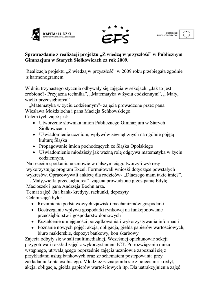 Sprawozdanie z realizacji projektu ,,Z wiedzą w przyszłość” w Publicznym Gimnazjum w Starych Siołkowicach za rok 2009. Realizacja projektu ,,Z wiedzą w przyszłość” w 2009 roku przebiegała zgodnie z harmonogramem. W dniu trzynastego stycznia odbywały się zajęcia w sekcjach: ,,Jak to jest zrobione?- Przyjazna technika”, ,,Matematyka w życiu codziennym”, ,, Mały, wielki przedsiębiorca”. ,,Matematyka w życiu codziennym”- zajęcia prowadzone przez pana Wiesława Moździocha i pana Macieja Seńkowskiego. Celem tych zajęć jest: Utworzenie słownika imion Publicznego Gimnazjum w Starych Siołkowicach Uświadomienie uczniom, wpływów zewnętrznych na ogólnie pojętą kulturę Śląska Propagowanie imion pochodzących ze Śląska Opolskiego Uświadomienie młodzieży jak ważną rolę odgrywa matematyka w życiu codziennym. Na trzecim spotkaniu uczniowie w dalszym ciągu tworzyli wykresy wykorzystując program Excel. Formułowali wnioski dotyczące powstałych wykresów. Opracowywali ankietę dla rodziców- ,,Dlaczego mam takie imię?”. ,,Mały,wielki przedsiębiorca”- zajęcia prowadzone przez panią Edytę Macioszek i pana Andrzeja Bochniarza. Temat zajęć: Ja i bank- kredyty, rachunki, depozyty Celem zajęć było: Rozumienie podstawowych zjawisk i mechanizmów gospodarki Dostrzeganie wpływu gospodarki rynkowej na funkcjonowanie przedsiębiorstw i gospodarstw domowych Kształcenie umiejętności porządkowania i wykorzystywania informacji Poznanie nowych pojęć: akcja, obligacja, giełda papierów wartościowych, biuro maklerskie, depozyt bankowy, bon skarbowy Zajęcia odbyły się w sali multimedialnej. Wcześniej opiekunowie sekcji przygotowali rozkład zajęć z wykorzystaniem ICT. Po rozwiązaniu quizu wstępnego, utrwalającego poprzednie zajęcia uczniowie zapoznali się z przykładami usług bankowych oraz ze schematem postępowania przy zakładaniu konta osobistego. Młodzież zaznajomiła się z pojęciami: kredyt, akcja, obligacja, giełda papierów wartościowych itp. Dla uatrakcyjnienia zajęć uczniowie odegrali scenkę z udziałem ucznia- pracownika i ucznia- klienta banku. Pozostali uczniowie ocenili czy decyzja pracownika banku była słuszna, czy sposób zabezpieczenia kredytu był wystarczający itp. Podsumowaniem zajęć był test sprawdzający, który każdy uczeń wykonał samodzielnie. ,,Jak to jest zrobione?- Przyjazna technika”- zajęcia prowadzone przez panią Joanne Thoma i panią Marię Macioszek. Celem zajęć było zapoznanie uczniów z: istotą światła podstawami optyki geometrycznej zastosowaniami wiedzy z optyki w technice W trakcie zajęć uczniowie: zapoznali się z zasadami powstawania obrazów w zwierciadłach i soczewkach oraz wykonali odpowiednie doświadczenia zbudowali peryskop poznali zjawisko całkowitego wewnętrznego odbicia i wykonali model światłowodu zbudowali prosty wiatraczek, który wykorzysta zamianę energii światła w ciepło W dniu dziesiątego lutego odbywały się zajęcia w sekcjach ,, Komputer dla każdego”, ,,English is easy”, ,, Mały, wielki przedsiębiorca”. ,,Mały, wielki przedsiębiorca”- zajęcia prowadzone przez panią Edytę Macioszek i pana Andrzeja Bochniarza. Temat: Sposoby inwestowania pieniędzy Cele zajęć: Rozumienie podstawowych zjawisk związanych z inwestowaniem pieniędzy oraz zakładaniem przedsiębiorstw Dostrzeganie wpływu gospodarki rynkowej na funkcjonowanie przedsiębiorstw Wprowadzenie nowych pojęć: otwarty fundusz inwestycyjny, biuro maklerskie, inwestycja o niższym i wyższym ryzyku Kształcenie umiejętności korzystania ze środków multimedialnych Zajęcia odbyły się w sali multimedialnej. Uczniowie pod kierunkiem opiekunów wyszukiwali oraz zapoznawali się z nowymi pojęciami. Młodzież podawała przykłady i sposoby inwestowania, które następnie dzieliła na inwestycje obarczone, ich zdaniem, wysokim i niskim ryzykiem. Następnie uczniowie zostali zapoznani z zagadnieniami związanymi z funkcjonowaniem giełdy papierów wartościowych. Pod koniec zajęć wykonali plakat przedstawiający porównanie oszczędzania oraz inwestowania o większym i mniejszym stopniu ryzyka. ,,English is easy”- zajęcia prowadzone przez panią Beatę Hartman i panią Agnieszkę Zakrzewską Temat zajęć: A GUIDE TO LONDON ( Our guide-book). 1. 2. 3. 4. Prezentacja zebranych materiałów i wyszukiwanie nowych. Porządkowanie ich. Plan przewodnika i opracowanie graficzne. Dialogi i scenki. Temat zajęć: ANIMALS IN IDIOMS AND PROVERBS. 1. Poznanie idiomów i przysłów, w których pojawiają się nazwy zwierząt. 2. Szukanie polskich odpowiedników i znaczenia wyrażeń. 3. Wykonanie krzyżówki, podanie kontekstów sytuacyjnych, w jakich można stosować te wyrażenia. ,,Komputer dla każdego”- zajęcia prowadzone przez panią Irenę Hartman i panią Wiolettę Reichert Temat: 1. Poznanie tajników tworzenia prezentacji multimedialnych i programów graficznych. 2. Opracowanie wizytówek i folderów według przygotowanego projektu. Cele zajęć: 1. Kształtowanie umiejętności prezentowania ważnych informacji na łamach folderu. 2. Umiejętność tworzenia prezentacji w programie Power Point. 3. Kształcenie smaku artystycznego. 4. Umiejętność pracy w grupie. 5. Kształcenie umiejętności wyszukiwania potrzebnych informacji w życiu codziennym i do porozumiewania się W dniu trzeciego marca odbywały się zajęcia w sekcjach: ,,Jak to jest zrobione?- przyjazna technika”, ,,Matematyka w życiu codziennym”, ,, Mały, wielki przedsiębiorca”. ,,Matematyka w życiu codziennym”- zajęcia prowadzone przez pana Wiesława Moździocha i pana Macieja Seńkowskiego. Celem tych zajęć jest: Utworzenie słownika imion Publicznego Gimnazjum w Starych Siołkowicach Uświadomienie uczniom, wpływów zewnętrznych na ogólnie pojętą kulturę Śląska Propagowanie imion pochodzących ze Śląska Opolskiego Uświadomienie młodzieży jak ważną rolę odgrywa ma