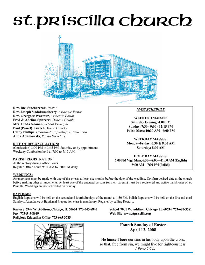 Rev. Idzi Stacherczak, Pastor Rev. Joseph Vadakumcherry, Associate Pastor Rev. Grzegorz Warmuz, Associate Pastor Fred & Adeline Spitzzeri, Deacon Couple Mrs. Linda Noonan, School Principal Paul (Pawel) Tawech, Music Director Cathy Phillips, Coordinator of Religious Education Anna Adamowski, Parish Secretary RITE OF RECONCILIATION: (Confession) 3:00 PM to 3:45 PM, Saturday or by appointment. Weekday Confession held at 7:00 to 7:15 AM. PARISH REGISTRATION: At the rectory during office hours. Regular Office hours 9:00 AM to 8:00 PM daily. MASS SCHEDULE WEEKEND MASSES: Saturday Evening: 4:00 PM Sunday: 7:30 - 9:00 - 12:15 PM Polish Mass: 10:30 AM - 6:00 PM WEEKDAY MASSES: Monday-Friday: 6:30 & 8:00 AM Saturday: 8:00 AM HOLY DAY MASSES: 7:00 PM Vigil Mass, 6:30—8:00—11:00 AM (English) 9:00 AM—7:00 PM (Polish) WEDDINGS: Arrangement must be made with one of the priests at least six months before the date of the wedding. Confirm desired date at the church before making other arrangements. At least one of the engaged persons (or their parents) must be a registered and active parishioner of St. Priscilla. Weddings are not scheduled on Sunday. BAPTISMS: English Baptisms will be held on the second and fourth Sundays of the month at 1:30 PM. Polish Baptisms will be held on the first and third Sundays. Attendance at Baptismal Preparation class is mandatory. Register by calling Rectory. Rectory 6949 W. Addison, Chicago, IL 60634 773-545-8840 Fax: 773-545-8919 Religious Education Office 773-685-3785 School 7001 W. Addison, Chicago, IL 60634 773-685-3581 Web Site www.stpriscilla.org Fourth Sunday of Easter April 13, 2008 He himself bore our sins in his body upon the cross, so that, free from sin, we might live for righteousness. — 1 Peter 2:24a Page Two April 13, 2008 DOBRY PASTERZ—BRAMĄ ŻYCIA Aż cztery razy powtarza się w dzisiejszej Ewangelii słowo „brama”. Chrystus nazywa siebie bramą. Ma na myśli bramę wiodącą do owczarni, dlatego staje w tej bramie i troskliwie przygląda się każdej owieczce wracającej z pastwiska. Ale ma też na myśli inną bramę, wiodącą do wnętrza Kościoła i także z wielką troskliwością przygląda się tym, którzy przez tę bramę wchodzą do środka świątyni. Tak, jak dobry pasterz interesuje się każdą owieczką wracającą z pastwiska na nocny odpoczynek, tak też Jezus Chrystus jest zainteresowany każdą owieczką, każdym wierzącym członkiem Kościoła, by mu w potrzebie pospieszyć z pomocą. PRAISE FOR GOD’S GIFT OF NATURE Praised be my Lord for brother wind And for the air and clouds and fair and every kind of weather, By the which Thou givest to Thy creatures nourishment. Praised be my Lord for sister water, The which is greatly helpful and humble and precious and pure. Praised be my Lord for brother fire, By the which Thou lightest up the dark. And fair is he and gay and mighty and strong. Praised be my Lord for our sister, mother earth, The which sustains and keeps us And brings forth diverse fruits with grass and flowers bright. —St. Francis of Assisi Jak wygląda ta pomoc Jezusa, możemy się o tym przekonać z analizy tekstu dzisiejszej Ewangelii. Przede wszystkim Jezus jako Dobry Pasterz troszczy się o życie swoich owieczek. Wszyscy odczuwamy głód życia. Dlatego potrzebujemy pasterza—Jezusa— tego, który mówi w dzisiejszej Ewangelii: „Ja przyszedłem po to, aby owce miały życie i miały je w obfitości” (J. 10, 10). Jezus daje nam życie w swojej owczarni, tj. Kościele. Daje nam je przede wszystkim przez chrzest święty, w ten sposób włącza On nas w nawias chrześcijańskiego życia i czyni nas swymi dziećmi. A potem ubogaca w nas to życie przez sakramenty święte, szczególnie przez Eucharystię. To właśnie dzięki Eucharystii możemy kochać, możemy walczyć i trwać z Nim w zjednoczeniu. Dlatego On jest bramą, przez którą wchodzimy do wnętrza Jego owczarni. Jest jakimś znakiem rozpoznawczym, dzięki któremu upewniamy się, że jesteśmy na właściwej drodze, że jesteśmy w Jego Kościele. St. Priscilla Cub Scout Pack 3803 will hold their On jest jedyną prawdziwą bramą, przez którą wchodząc, dostępujemy łaski zbawienia. Wyraźnie to określił sam Jezus: „Ja jestem bramą. Jeśli kto wejdzie przeze mnie, będzie zbawiony” (J. 10,9). on Saturday, April 19, 2008, from 9 AM until 12 noon in the church parking lot. Tylko przez Jezusa i w łączności z Jezusem można osiągnąć Królestwo Niebieskie. On jest tym, który stojąc w bramie i sam będąc bramą, otwiera nam drogę do zbawienia. Please save your clean aluminum cans for this worthwhile cause. To zbawienie osiąga się przez naśladowanie w życiu Pasterza—Bramy, Jezusa Chrystusa. Czy potrafię i czy chcę czynić to na codzień? - Ks. Idzi - Annual Earth Day Can Drive -Pack 3803- Fourth Sunday of Easter FOURTH SUNDAY OF EASTER (13) 7:30 — +Charles Willard (Daughter Karen & Jim Smith) +Dixie Haddad (Pittsfield Café) 9:00 — +Chester Kusmider (Wife, Daughters & Jim) +Salvatore Desimone (Family) +Ralph J. Motto, D.D.S. 25th Death Anniversary (Daniel G. Manczak Family) +Margaret, Peggy, Bridget Leyden (Leyden Family) +Mariano Ocampo 12th Death Anniversary (Family) +Jozef & Maria Rosenbaum (Mizera Family) +Genevieve Groth (Virginia & Peter Bussone) +Josephine Jaykowski (Helen Kroll) 10:30— +Sobiesław Łabno +Maria Chudyba 3-cia rocznica śmierci (Rodzina) +Helena Majewska +O wieczne światło dla Victora Burzyńskiego w 2-gą rocznicę śmierci (Rodzice) O zdrowie i bł. Boże dla Kazimiery Karbarz (Stanisław Karbarz z rodziną) +O wieczne światło dla Czesława Niedbała w I-szą rocznicę śmierci (Rodzina) O Boże bł. i potrzebne łaski dla Kazimierza Knap z racji urodzin (Żona i córki) O opiekę Matki Najśw. dla Gosi i Sylwi (Rodzice) Jan Szarawara o zdrowie i bł. Boże +Józef, Remigiusz Radomski +Emilia, Bernard Moryc 12:15— +Bernice Catanzaro 1st Death Anniv. (Joe & Louise) +Casimiro M. Lor