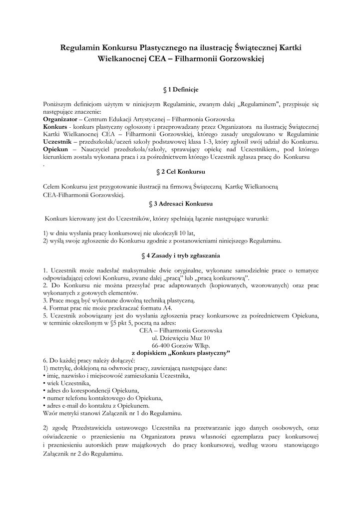 Regulamin Konkursu Plastycznego na ilustrację Świątecznej Kartki Wielkanocnej CEA – Filharmonii Gorzowskiej § 1 Definicje Poniższym definicjom użytym w niniejszym Regulaminie, zwanym dalej „Regulaminem", przypisuje się następujące znaczenie: Organizator – Centrum Edukacji Artystycznej – Filharmonia Gorzowska Konkurs - konkurs plastyczny ogłoszony i przeprowadzany przez Organizatora na ilustrację Świątecznej Kartki Wielkanocnej CEA – Filharmonii Gorzowskiej, którego zasady uregulowano w Regulaminie Uczestnik – przedszkolak/uczeń szkoły podstawowej klasa 1-3, który zgłosił swój udział do Konkursu. Opiekun – Nauczyciel przedszkola/szkoły, sprawujący opiekę nad Uczestnikiem., pod którego kierunkiem została wykonana praca i za pośrednictwem którego Uczestnik zgłasza pracę do Konkursu . § 2 Cel Konkursu Celem Konkursu jest przygotowanie ilustracji na firmową Świąteczną Kartkę Wielkanocną CEA-Filharmonii Gorzowskiej. § 3 Adresaci Konkursu Konkurs kierowany jest do Uczestników, którzy spełniają łącznie następujące warunki: 1) w dniu wysłania pracy konkursowej nie ukończyli 10 lat, 2) wyślą swoje zgłoszenie do Konkursu zgodnie z postanowieniami niniejszego Regulaminu. § 4 Zasady i tryb zgłaszania 1. Uczestnik może nadesłać maksymalnie dwie oryginalne, wykonane samodzielnie prace o tematyce odpowiadającej celowi Konkursu, zwane dalej „pracą” lub „pracą konkursową”. 2. Do Konkursu nie można przesyłać prac adaptowanych (kopiowanych, wzorowanych) oraz prac wykonanych z gotowych elementów. 3. Prace mogą być wykonane dowolną techniką plastyczną. 4. Format prac nie może przekraczać formatu A4. 5. Uczestnik zobowiązany jest do wysłania zgłoszenia pracy konkursowe za pośrednictwem Opiekuna, w terminie określonym w §5 pkt 5, pocztą na adres: CEA – Filharmonia Gorzowska ul. Dziewięciu Muz 10 66-400 Gorzów Wlkp. z dopiskiem „Konkurs plastyczny” 6. Do każdej pracy należy dołączyć: 1) metrykę, doklejoną na odwrocie pracy, zawierającą następujące dane: • imię, nazwisko i miejscowość zamieszkania Uczestnika, • wiek Uczestnika, • adres do korespondencji Opiekuna, • numer telefonu kontaktowego do Opiekuna, • adres e-mail do kontaktu z Opiekunem. Wzór metryki stanowi Załącznik nr 1 do Regulaminu. 2) zgodę Przedstawiciela ustawowego Uczestnika na przetwarzanie jego danych osobowych, oraz oświadczenie o przeniesieniu na Organizatora prawa własności egzemplarza pacy konkursowej i przeniesieniu autorskich praw majątkowych do pracy konkursowej, według wzoru stanowiącego Załącznik nr 2 do Regulaminu. 3) zgodę Opiekuna na przetwarzanie jego danych osobowych na potrzeby udziału Uczestnika w Konkursie, według wzoru stanowiącego Załącznik nr 3 do Regulaminu. § 5 Przebieg Konkursu 1. Konkurs przeprowadza Kapituła Konkursu powołana przez Organizatora. 2. Skład Kapituły liczy trzy osoby. 3. Dokumentację Konkursu prowadzi Kapituła Konkursu. 4. Decyzje Kapituły są ostateczne i nie podlegają zaskarżeniu. 5. Zgłoszenia do Konkursu należy przesyłać w terminie do 13 marca 2015 roku (decyduje data stempla pocztowego) 6. Organizator zastrzega sobie prawo do przedłużenia terminu trwania Konkursu. 7. Do dnia 23 marca 2015 roku Kapituła Konkursu dokona ogłoszenia wyników. 8.Informacje o wynikach i przebiegu Konkursu zostaną opublikowane na stronie www.filharmoniagorzowska.pl poprzez podanie listy zwycięzców zawierającej: imiona, nazwiska i miejscowości zamieszkania Uczestników, którzy zwyciężyli w Konkursie, za uprzednią zgodą ich przedstawicieli ustawowych. 9. Konkurs będzie przebiegał dwuetapowo. 1). W I etapie konkursu Kapituła Konkursowa dokona wyboru 50 prac, które zakwalifikowane będą do II etapu. 2). W II etapie konkursu pracownicy Organizatora w drodze głosowania za pośrednictwem wewnętrznej sieci elektronicznej dokonają wyboru zwycięskiej pracy. W wyniku głosowania zostaną wybrane trzy zwycięskie prace, które otrzymają najwyższą ilość głosów, zajmując odpowiednio I, II i III miejsce. 3). W przypadku, gdy dwie lub więcej prac otrzyma równą liczbę głosów, wyboru zwycięskiej pracy dokona Kapituła Konkursu. 4). Zakończenie II etapu konkursu nastąpi do dnia 20 marca 2015 roku. § 6 Nagrody 1. Organizator przewiduje: 1) Jedną nagrodę główną dla autora zwycięskiej pracy za zajęcie I miejsca. 2) Atrakcyjne nagrody rzeczowe za II i III miejsce. 3) Pięć nagród specjalnych za oryginalną technikę wykonania pracy. 4) Upominki dla Uczestników, których prace wezmą udział w II etapie Konkursu. 2. Nagrodę główną i upominki w Konkursie, określa i zapewnia Organizator. 1) Wszystkie nagrody i upominki Uczestnikom przekazuje Organizator. 2) O terminie i formie przekazania nagród i upominków Organizator za pośrednictwem Opiekunów poinformuje Uczestników po rozstrzygnięciu Konkursu. 3) Nie ma możliwości żądania równowartości nagród w formie finansowej lub przedmiotowej, ani ich zamiany. 4) Jakiekolwiek roszczenia Uczestników z tytułu nieotrzymania nagrody/nagród, które nie zostały im przyznane w drodze rozstrzygnięcia Konkursu, są bezpodstawne i nie ulegają rozpatrzeniu. § 7 Ustalenia organizacyjne 1. Organizator, na podstawie zgody Przedstawiciela ustawowego Uczestnika stanowiącej Załącznik nr 2 do Regulaminu, uzyskuje do nadesłanych prac prawo własności egzemplarzy i majątkowe prawa autorskie w zakresie zwielokrotniania dowolną techniką, w dowolnej ilości egzemplarzy, w tym przeniesienia na inną dowolną technikę artystyczną (druk, fotografowanie itp.), wprowadzania do obrotu publicznego, publicznego odtwarzania, wyświetlania, nadawania za pomocą wizji przewodowej lub bezprzewodowej przez stację naziemną, nadawania za pośrednictwem satelity, najmu, dzierżawy. Zezwolenie udzielone jest bez ograniczeń terytorialnych i czasowych oraz bez prawa do żądania dodatkowego wynagrodzenia