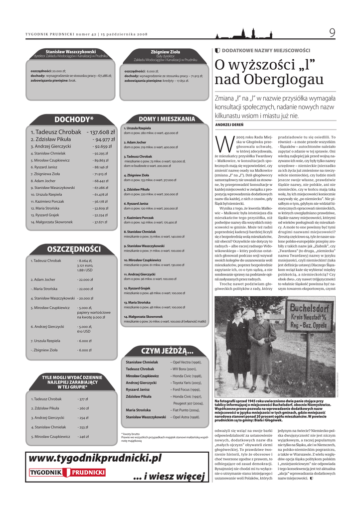 T YG ODNIK PRUDNICK I numer 4 2 | 15 pa ździer n ika 2008 oszczędności: 20.000 zł; dochody: wynagrodzenie ze stosunku pracy – 67.286 zł; zobowiązania pieniężne: brak. DOCHODY* Zbigniew Zioła były dyrektor Zakładu Wodociągów i Kanalizacji w Prudniku oszczędności: 6.000 zł; dochody: wynagrodzenie ze stosunku pracy – 71.913 zł; zobowiązania pieniężne: kredyty – 17.852 zł. DOMY I MIESZKANIA 1. Tadeusz Chrobak - 137.608 zł 1. Urszula Rzepiela dom o pow. 280 mkw. o wart. 450.000 zł 2. Zdzisław Pikuła - 94.977 zł 3. Andrzej Gierczycki - 92.659 zł 2. Adam Jocher dom o pow. 219 mkw. o wart. 400.000 zł 4. Stanisław Chmielak - 92.295 zł 5. Mirosław Czupkiewicz - 89.863 zł 6. Ryszard Janisz - 88.146 zł 7. Zbigniewa Zioła - 71.913 zł 8. Adam Jocher - 68.442 zł 9. Stanisław Waszczykowski - 67.286 zł 10. Urszula Rzepiela - 61.478 zł 11. Kazimierz Porczak - 56.178 zł 12. Maria Strońska - 52.609 zł 13. Ryszard Grajek - 52.254 zł 14. Małgorzata Skowronek - 37.671 zł 3. Tadeusz Chrobak mieszkanie o pow. 73 mkw. o wart. 150.000 zł, dom w budowie o wart. 200.000 zł 4. Zbigniew Zioła dom o pow. 153 mkw. o wart. 317.000 zł 5. Zdzisław Pikuła dom o pow. 220 mkw. o wart. 200.000 zł 6. Ryszard Janisz dom o pow. 120 mkw. o wart. 200.000 zł 7. Kazimierz Porczak dom o pow. 142 mkw. o wart. 170.400 zł 8. Stanisław Chmielak mieszkanie o pow. 73 mkw. o wart. 140.000 zł OSZCZĘDNOŚCI 1. Tadeusz Chrobak - 8.064 zł, 3.121 euro, 1.881 USD 2. Adam Jocher - 22.000 zł -. Maria Strońska - 22.000 zł 4. Stanisław Waszczykowski - 20.000 zł 5. Mirosław Czupkiewicz - 5.000 zł, papiery wartościowe na kwotę 9.000 zł 6. Andrzej Gierczycki - 5.000 zł, 610 USD 7. Urszula Rzepiela - 6.000 zł -. Zbigniew Zioła - 6.000 zł TYLE MOGLI WYDAĆ DZIENNIE NAJLEPIEJ ZARABIAJĄCY W TEJ GRUPIE* 9. Stanisław Waszczykowski mieszkanie o pow. 71 mkw. o wart. 100.000 zł 10. Mirosław Czupkiewicz mieszkanie o pow. 61 mkw. o wart. 130.000 zł 11. Andrzej Gierczycki dom o pow. 96 mkw. o wart. 100.000 zł 12. Ryszard Grajek mieszkanie o pow. 48 mkw. o wart. 100.000 zł DODATKOWE NAZWY MIEJSCOWOŚCI O wyższości „l” nad Oberglogau Zmiana „ł” na „l” w nazwie przysiółka wymagała konsultacji społecznych, nadanie nowych nazw kilkunastu wsiom i miastu już nie. ANDRZEJ DEREŃ W 2005 roku Rada Miejska w Głogówku przegłosowała uchwałę, w której zdecydowała, że mieszkańcy przysiółka Twardawy – Małkowice, w konsultacjach społecznych mają się wypowiedzieć, czy zmienić nazwę osady na Malkowice (zmiana „ł” na „l”). Dziś głogóweccy samorządowcy nie uważali za stosowne, by przeprowadzić konsultacje w każdej miejscowości w związku z propozycją wprowadzenia dodatkowych nazw dla każdej, z nich z czasów, gdy Śląsk był niemiecki. Wynika z tego, że kwestia Małkowic – Malkowic była istotniejsza dla mieszkańców tego przysiółka, niż podwójne nazwy dla wszystkich miejscowości w gminie. Może też radni poprzedniej kadencji bardziej liczyli się z bezpośrednią wolą mieszkańców, niż obecni? Oczywiście nie dotyczy to radnych – albo raczej radnego Wdowikowskiego – który podczas ostatnich głosowań podczas sesji wzywał swoich kolegów do uszanowania woli mieszkańców, poprzez bezpośrednie zapytanie ich, co o tym sądzą, a nie sondowanie sprawy na podstawie opinii zasłyszanych przez radnych. Trochę nawet podziwiam głogóweckich polityków z rady, którzy pradziadowie tu się osiedlili. To również – a może przede wszystkim - Ślązaków – autochtonów należało zapytać o zdanie w tej sprawie. Oni wiedzą najlepiej jak przed wojną nazywano ich wsie, czy były tylko nazwy urzędowe – niemieckie (nierzadko za ich życia już zmienione na rzeczywiście niemieckie), czy ludzie mieli jeszcze swoje własne, prawdziwie śląskie nazwy, nie polskie, ani nie niemieckie, czy w końcu mają taką wolę, by ich miejscowości koniecznie nazywały się „po niemiecku”. Nie pisałbym o tym, gdybym nie widział historycznych opracowań niemieckich, w których uwzględniano prawdziwe, śląskie nazwy miejscowości, którymi od wieków posługiwali się mieszkańcy. A może to one powinny być tymi drugimi nazwami miejscowości? Zresztą częściowo są, tyle że nasze szalone polsko-europejskie przepisy zrobiły z takich nazw jak „Ziabnik”, czy „Twardawa” (to druga, „niemiecka” nazwa Twardawy) nazwy w języku mniejszości, czyli niemieckim! (taka jest definicja ustawy) Dlaczego Ślązakom wciąż każe się wybierać między polskością, a niemieckością? Czy obok dwu-, czy nawet trójjęzyczności to właśnie śląskość powinna być naszym towarem eksportowym, czymś 13. Maria Strońska mieszkanie o pow. 48 mkw. o wart. 100.000 zł 14. Małgorzata Skowronek mieszkanie o pow. 70 mkw. o wart. 100.000 zł (własność matki) CZYM JEŻDŻĄ... Stanisław Chmielak – Opel Vectra (1996), Tadeusz Chrobak – WV Bora (2001), Mirosław Czupkiewicz – Honda Civic (1998), Andrzej Gierczycki – Toyota Yaris (2003), Ryszard Janisz – Ford Focus (1999), Zdzisław Pikuła – Honda Civic (1997), 1. Tadeusz Chrobak - 377 zł 2. Zdzisław Pikuła - 260 zł Maria Strońska 3. Andrzej Gierczycki - 254 zł Stanisław Waszczykowski – Opel Astra (1998). 4. Stanisław Chmielak - 253 zł 5. Mirosław Czupkiewicz - 246 zł Peugeot 307 (2004), – Fiat Punto (2004), * kwoty brutto Prawie we wszystkich przypadkach majątek stanowi małżeńską wspólnotę majątkową www.tygodnikprudnicki.pl ... i wiesz więcej Neus tädt er heimat brief Stanisław Waszczykowski dyrektor Zakładu Wodociągów i Kanalizacji w Prudniku Na fotografii sprzed 1945 roku uwieczniono dwie panie stojące przy tablicy informującej o miejscowości Buchelsdorf, obecnie Niemysłowice. Współczesne prawo pozwala na wprowadzenie dodatkowych nazw miejscowości w języku mniejszości w tych gminach, gdzie mniejszość narodowa stanowi ponad 20 procent og