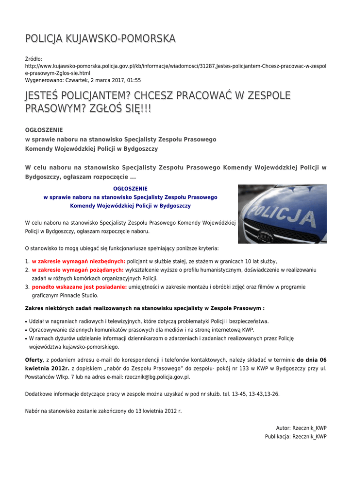 POLICJA KUJAWSKO-POMORSKA Źródło: http://www.kujawsko-pomorska.policja.gov.pl/kb/informacje/wiadomosci/31287,Jestes-policjantem-Chcesz-pracowac-w-zespol e-prasowym-Zglos-sie.html Wygenerowano: Czwartek, 2 marca 2017, 01:55 JESTEŚ POLICJANTEM? CHCESZ PRACOWAĆ W ZESPOLE PRASOWYM? ZGŁOŚ SIĘ!!! OGŁOSZENIE w sprawie naboru na stanowisko Specjalisty Zespołu Prasowego Komendy Wojewódzkiej Policji w Bydgoszczy W celu naboru na stanowisko Specjalisty Zespołu Prasowego Komendy Wojewódzkiej Policji w Bydgoszczy, ogłaszam rozpoczęcie ... OGŁOSZENIE w sprawie naboru na stanowisko Specjalisty Zespołu Prasowego Komendy Wojewódzkiej Policji w Bydgoszczy W celu naboru na stanowisko Specjalisty Zespołu Prasowego Komendy Wojewódzkiej Policji w Bydgoszczy, ogłaszam rozpoczęcie naboru. O stanowisko to mogą ubiegać się funkcjonariusze spełniający poniższe kryteria: 1. w zakresie wymagań niezbędnych: policjant w służbie stałej, ze stażem w granicach 10 lat służby, 2. w zakresie wymagań pożądanych: wykształcenie wyższe o profilu humanistycznym, doświadczenie w realizowaniu zadań w różnych komórkach organizacyjnych Policji. 3. ponadto wskazane jest posiadanie: umiejętności w zakresie montażu i obróbki zdjęć oraz filmów w programie graficznym Pinnacle Studio. Zakres niektórych zadań realizowanych na stanowisku specjalisty w Zespole Prasowym : ● Udział w nagraniach radiowych i telewizyjnych, które dotyczą problematyki Policji i bezpieczeństwa. ● Opracowywanie dziennych komunikatów prasowych dla mediów i na stronę internetową KWP. ● W ramach dyżurów udzielanie informacji dziennikarzom o zdarzeniach i zadaniach realizowanych przez Policję województwa kujawsko-pomorskiego. Oferty, z podaniem adresu e-mail do korespondencji i telefonów kontaktowych, należy składać w terminie do dnia 06 kwietnia 2012r. z dopiskiem „nabór do Zespołu Prasowego” do zespołu- pokój nr 133 w KWP w Bydgoszczy przy ul. Powstańców Wlkp. 7 lub na adres e-mail: [email protected]. Dodatkowe informacje dotyczące pracy w zespole można uzyskać w pod nr służb. tel. 13-45, 13-43,13-26. Nabór na stanowisko zostanie zakończony do 13 kwietnia 2012 r. Autor: Rzecznik_KWP Publikacja: Rzecznik_KWP Ocena: 0/5 (0) Tweetnij