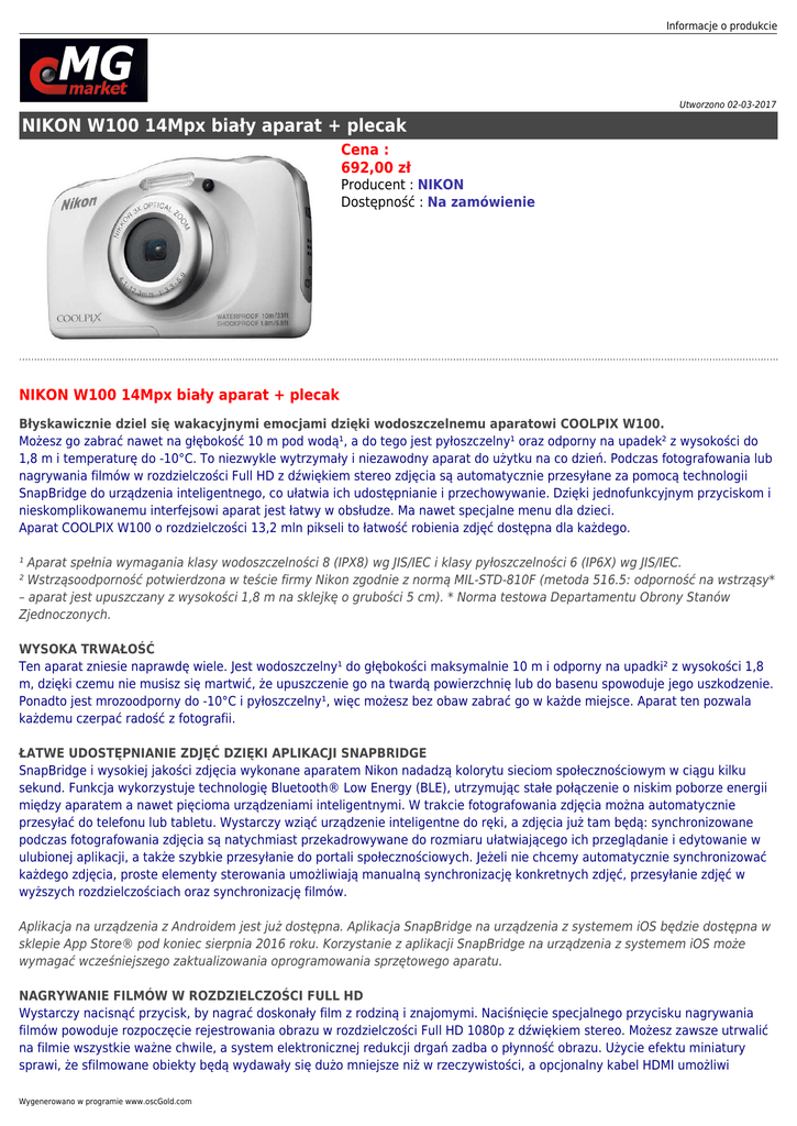 Informacje o produkcie Utworzono 02-03-2017 NIKON W100 14Mpx biały aparat + plecak Cena : 692,00 zł Producent : NIKON Dostępność : Na zamówienie NIKON W100 14Mpx biały aparat + plecak Błyskawicznie dziel się wakacyjnymi emocjami dzięki wodoszczelnemu aparatowi COOLPIX W100. Możesz go zabrać nawet na głębokość 10 m pod wodą¹, a do tego jest pyłoszczelny¹ oraz odporny na upadek² z wysokości do 1,8 m i temperaturę do -10°C. To niezwykle wytrzymały i niezawodny aparat do użytku na co dzień. Podczas fotografowania lub nagrywania filmów w rozdzielczości Full HD z dźwiękiem stereo zdjęcia są automatycznie przesyłane za pomocą technologii SnapBridge do urządzenia inteligentnego, co ułatwia ich udostępnianie i przechowywanie. Dzięki jednofunkcyjnym przyciskom i nieskomplikowanemu interfejsowi aparat jest łatwy w obsłudze. Ma nawet specjalne menu dla dzieci. Aparat COOLPIX W100 o rozdzielczości 13,2 mln pikseli to łatwość robienia zdjęć dostępna dla każdego. ¹ Aparat spełnia wymagania klasy wodoszczelności 8 (IPX8) wg JIS/IEC i klasy pyłoszczelności 6 (IP6X) wg JIS/IEC. ² Wstrząsoodporność potwierdzona w teście firmy Nikon zgodnie z normą MIL-STD-810F (metoda 516.5: odporność na wstrząsy* – aparat jest upuszczany z wysokości 1,8 m na sklejkę o grubości 5 cm). * Norma testowa Departamentu Obrony Stanów Zjednoczonych. WYSOKA TRWAŁOŚĆ Ten aparat zniesie naprawdę wiele. Jest wodoszczelny¹ do głębokości maksymalnie 10 m i odporny na upadki² z wysokości 1,8 m, dzięki czemu nie musisz się martwić, że upuszczenie go na twardą powierzchnię lub do basenu spowoduje jego uszkodzenie. Ponadto jest mrozoodporny do -10°C i pyłoszczelny¹, więc możesz bez obaw zabrać go w każde miejsce. Aparat ten pozwala każdemu czerpać radość z fotografii. ŁATWE UDOSTĘPNIANIE ZDJĘĆ DZIĘKI APLIKACJI SNAPBRIDGE SnapBridge i wysokiej jakości zdjęcia wykonane aparatem Nikon nadadzą kolorytu sieciom społecznościowym w ciągu kilku sekund. Funkcja wykorzystuje technologię Bluetooth® Low Energy (BLE), utrzymując stałe połączenie o niskim poborze energii między aparatem a nawet pięcioma urządzeniami inteligentnymi. W trakcie fotografowania zdjęcia można automatycznie przesyłać do telefonu lub tabletu. Wystarczy wziąć urządzenie inteligentne do ręki, a zdjęcia już tam będą: synchronizowane podczas fotografowania zdjęcia są natychmiast przekadrowywane do rozmiaru ułatwiającego ich przeglądanie i edytowanie w ulubionej aplikacji, a także szybkie przesyłanie do portali społecznościowych. Jeżeli nie chcemy automatycznie synchronizować każdego zdjęcia, proste elementy sterowania umożliwiają manualną synchronizację konkretnych zdjęć, przesyłanie zdjęć w wyższych rozdzielczościach oraz synchronizację filmów. Aplikacja na urządzenia z Androidem jest już dostępna. Aplikacja SnapBridge na urządzenia z systemem iOS będzie dostępna w sklepie App Store® pod koniec sierpnia 2016 roku. Korzystanie z aplikacji SnapBridge na urządzenia z systemem iOS może wymagać wcześniejszego zaktualizowania oprogramowania sprzętowego aparatu. NAGRYWANIE FILMÓW W ROZDZIELCZOŚCI FULL HD Wystarczy nacisnąć przycisk, by nagrać doskonały film z rodziną i znajomymi. Naciśnięcie specjalnego przycisku nagrywania filmów powoduje rozpoczęcie rejestrowania obrazu w rozdzielczości Full HD 1080p z dźwiękiem stereo. Możesz zawsze utrwalić na filmie wszystkie ważne chwile, a system elektronicznej redukcji drgań zadba o płynność obrazu. Użycie efektu miniatury sprawi, że sfilmowane obiekty będą wydawały się dużo mniejsze niż w rzeczywistości, a opcjonalny kabel HDMI umożliwi Wygenerowano w programie www.oscGold.com wyświetlenie obrazu na telewizorze HD. Wysokiej jakości filmy, na których uwieczniono ważne chwile lub sceny z podróży, doskonale nadają się do udostępnienia w sieciach społecznościowych. WYSOKA JAKOŚĆ ZDJĘĆ ZA KAŻDYM RAZEM Gwarantujący niezwykłą czystość obrazu obiektyw NIKKOR i matryca CMOS o rozdzielczości 13,2 mln pikseli pozwolą zapomnieć o ziarnistych zdjęciach i przegapionych momentach. Obiektyw NIKKOR z 3-krotnym zoomem optycznym i 6-krotnym zoomem cyfrowym Dynamic Fine Zoom³ pozwala zbliżyć się do fotografowanego obiektu i z łatwością uchwycić radosne chwile czy zabawne miny. Dzięki gwarantowanej wysokiej jakości obrazu możesz z dumą udostępniać wykonane zdjęcia i filmy. ³ Powiększenie uzyskane za pomocą funkcji Dynamic Fine Zoom jest obliczane od najszerszej pozycji zooma optycznego. ŁATWA I INTUICYJNA OBSŁUGA Ostatnią rzeczą, o której użytkownik chce myśleć, gdy dzieje się coś ciekawego, jest sposób obsługi aparatu. Model COOLPIX W100 rozwiązuje ten problem. Cztery specjalne przyciski zapewniają bezpośredni dostęp do menu, a dzięki łatwemu w obsłudze interfejsowi znalezienie potrzebnej funkcji nie stanowi żadnego problemu. Przyciski są duże i łatwe w obsłudze dla osób o małych dłoniach, dzięki czemu użytkownicy w każdym wieku mogą wygodnie wykonywać zdjęcia. Po wybraniu trybu Łatwa automatyka aparat samodzielnie dobierze optymalne ustawienia, tak aby każde zdjęcie wyglądało doskonale. Duży monitor LCD o rozdzielczości 230 tys. punktów i przekątnej 6,7 cm (2,7 cala) ułatwia kadrowanie, a powłoka przeciwodblaskowa i funkcja dostosowywania jasności gwarantują doskonałą widoczność w każdych warunkach – nawet przy słabym oświetleniu i w pełnym słońcu. Gniazdo mikro USB pozwala szybko naładować akumulator, by aparat był zawsze gotowy do uwieczniania idealnych chwil. FUNKCJE DLA WSZYSTKICH CZŁONKÓW RODZINY Dzięki dostępnej w aparacie COOLPIX W100 funkcji Odmiany menu, która umożliwia wybór menu odpowiednio dostosowanych dla dorosłych lub dla dzieci, nawet najmłodsi użytkownicy mogą z łatwością czerpać radość z fotografii. W menu dla dzieci wygląd barwnych e