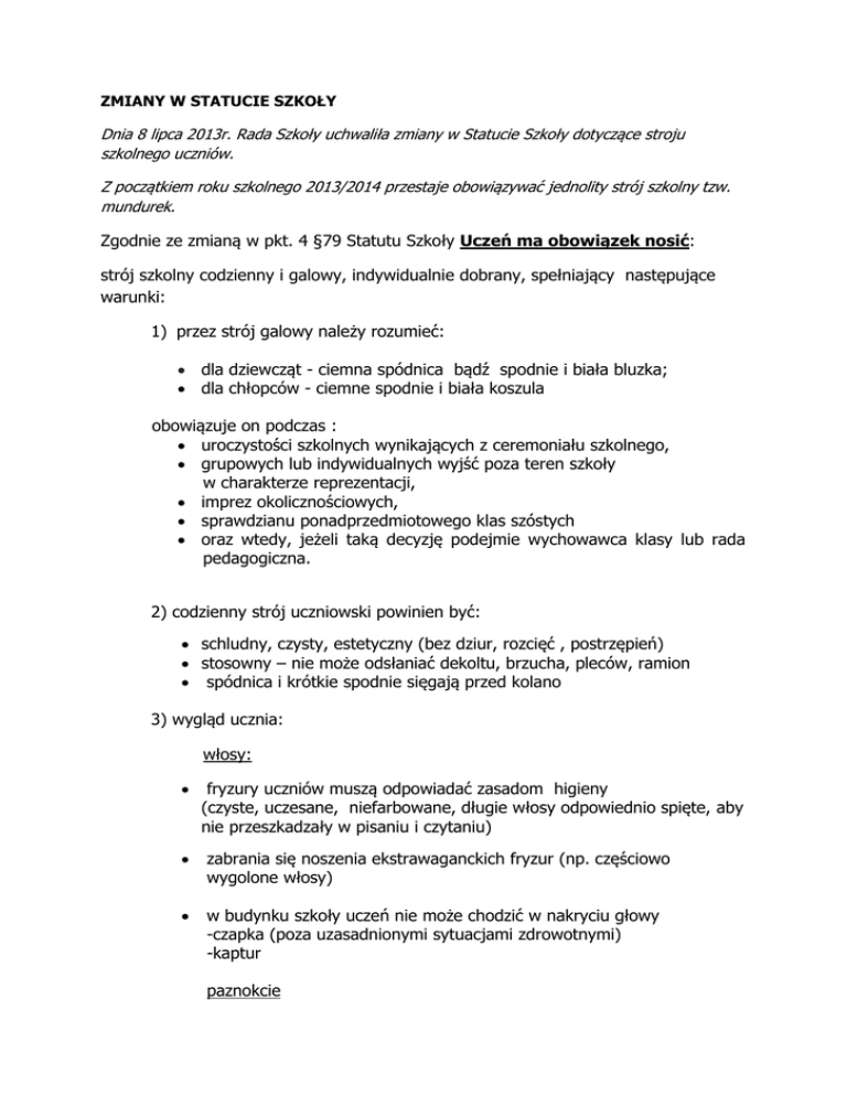 ZMIANY W STATUCIE SZKOŁY Dnia 8 lipca 2013r. Rada Szkoły uchwaliła zmiany w Statucie Szkoły dotyczące stroju szkolnego uczniów. Z początkiem roku szkolnego 2013/2014 przestaje obowiązywać jednolity strój szkolny tzw. mundurek. Zgodnie ze zmianą w pkt. 4 §79 Statutu Szkoły Uczeń ma obowiązek nosić: strój szkolny codzienny i galowy, indywidualnie dobrany, spełniający następujące warunki: 1) przez strój galowy należy rozumieć:  dla dziewcząt - ciemna spódnica bądź spodnie i biała bluzka;  dla chłopców - ciemne spodnie i biała koszula obowiązuje on podczas :  uroczystości szkolnych wynikających z ceremoniału szkolnego,  grupowych lub indywidualnych wyjść poza teren szkoły w charakterze reprezentacji,  imprez okolicznościowych,  sprawdzianu ponadprzedmiotowego klas szóstych  oraz wtedy, jeżeli taką decyzję podejmie wychowawca klasy lub rada pedagogiczna. 2) codzienny strój uczniowski powinien być:  schludny, czysty, estetyczny (bez dziur, rozcięć , postrzępień)  stosowny – nie może odsłaniać dekoltu, brzucha, pleców, ramion  spódnica i krótkie spodnie sięgają przed kolano 3) wygląd ucznia: włosy:  fryzury uczniów muszą odpowiadać zasadom higieny (czyste, uczesane, niefarbowane, długie włosy odpowiednio spięte, aby nie przeszkadzały w pisaniu i czytaniu)  zabrania się noszenia ekstrawaganckich fryzur (np. częściowo wygolone włosy)  w budynku szkoły uczeń nie może chodzić w nakryciu głowy -czapka (poza uzasadnionymi sytuacjami zdrowotnymi) -kaptur paznokcie  czyste, stosunkowo krótkie, bez zdobień ozdoby:   w szkole uczniowie nie noszą biżuterii – dopuszczalny jest łańcuszek lub medalik, a w przypadku dziewcząt małe kolczyki w uszach; dziewczęta nie malują paznokci i nie stosują makijażu obuwie:  na terenie szkoły uczeń jest zobowiązany nosić obuwie nie zagrażające zdrowiu (niedopuszczalne są wysokie obcasy i koturny)  obowiązkiem ucznia jest dopilnować, aby obuwie miało zawiązane sznurowadła. 4) podczas zajęć wychowania fizycznego obowiązuje strój i obuwie sportowe zgodnie z wymogami nauczyciela przedmiotu. 5) ubranie ucznia nie może zawierać elementów militarnych, obrażających uczucia patriotyczne, religijne i moralne, nie może reklamować niedozwolonych używek-alkoholu, narkotyków, papierosów. 6) w razie wątpliwości, czy strój lub wygląd są odpowiednie, decyzje podejmuje wychowawca klasy, nauczyciel oraz wicedyrektor. 7) konsekwencją notorycznego nie noszenia obowiązującego stroju szkolnego jest upomnienie ucznia przez : -wychowawcę w obecności rodzica (prawnego opiekuna) -dyrektora , w obecności wychowawcy, pedagoga, rodzica (prawnego opiekuna). Wprowadzone zapisy regulują wygląd i ubiór szkolny ucznia, jednocześnie dotychczasowy jednolity strój szkolny (mundurek) powyższe wymagania spełnia i może być nadal przez uczniów noszony, nie ma natomiast obowiązku przychodzenia w takim stroju do szkoły. Aleksandra Zielińska-Duda