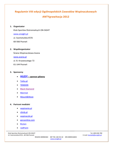 Regulamin VIII edycji Ogólnopolskich Zawodów Wspinaczkowych ANTYgrawitacja 2012 1. Organizator Klub Sportów Ekstremalnych ON-SIGHT www.onsight.pl ul. Szamotulska 87/6 60-566 Poznań 2. Współorganizator Ściana Wspinaczkowa Avana www.avana.pl ul. B. Krzywoustego 72 61-144 Poznań 3. Sponsorzy • HUDY - sponsor główny • Tuttu.pl • TENDON • Black Diamond • Marmot • Mount&Wave 4. Partroni medialni • wspinanie.pl • climb.pl • wspinaczki.pl • goryonline.com • Brytan • redPoint Klub Sportów Ekstremalnych ON-SIGHT Ul. Szamotulska 87/6 , 60-566 Poznań REGON 300984464 Tel. 609-028-789 E-mail: [email protected] NIP 781-182-92-10 www.onsight.pl KRS 0000316843 • Taternik • epoznan.pl • Radio Merkury • Radio Afera • WTK 5. Partnerzy • Miasto Poznań • Publiczne Gimnazjum Salezjańskie im. bł. Piątki Poznańskiej • Szkoły Salezjańskie • Lifelab • Studio Fuego • Ceneria.pl • Polish Outdor Group 6. Nocleg zawodników Klub gwarantuje zawodnikom nocleg w terminie 23-25.11.2012 Publiczne Gimnazjum Salezjańskie im. bł. Piątki Poznańskiej os. Bohaterów II Wojny Światowej 29, 61-387 Poznań 7. Kategorie 1. kobiety (rok urodzenia do 1996 włącznie) 2. mężczyźni (rok urodzenia do 1996 włącznie) 3. juniorzy do 16 lat (rok urodzenia 1997 i powyżej) 4. juniorki do 16 lat (rok urodzenia 1997 i powyżej) Uczestnikiem w kategorii juniorskiej może być osoba w wieku od 11 lat. Osoby poniżej 18 roku życia muszą posiadać pisemną zgodę rodziców na udział w zawodach do pobrania. UWAGA!!! Brak zgody rodziców/opiekunów prawnych dyskwalifikuje ze startu w zawodach. Klub Sportów Ekstremalnych ON-SIGHT Ul. Szamotulska 87/6 , 60-566 Poznań REGON 300984464 Tel. 609-028-789 E-mail: [email protected] NIP 781-182-92-10 www.onsight.pl KRS 0000316843 8. Zgłoszenia i wpisowe Zgłoszenia można dokonać: • za pomocą formularza zgłoszeniowego na stronie internetowej, • na miejscu przed rozpoczęciem zawodów. UWAGA!!! Limit zgłoszeń wynosi 100 osób. Za datę zgłoszenia uznaje się datę wpłaty opłaty startowej. Wpisowe na zawody wynosi 25 zł za 2 dni zawodów płatne do dn. 19.11.2012. W terminie 20-24.11.2012. wpisowe wynosi 35 zł. Wpłat należy dokonywać na konto: Klub Sportów Ekstremalnych ON-SIGHT ul. Szamotulska 87/6 60-566 Poznań Volkswagen Bank: 78 2130 0004 2001 0475 8090 0001 Z dopiskiem: ANTYgrawitacja2012 - imię i nazwisko 9. Świadczenia dla zawodników • nocleg, • posiłek każdego dnia zawodów, • medyczne zabezpieczenie imprezy przez firmę Lifelab, • nagrody i puchary dla zwycięzców, • nagrody do rozlosowania na zakończeniu zawodów. 10. Rejestracja zawodników Każdy zawodnik, po przybyciu na miejsce zawodów, musi stawić się w biurze zawodów w celu: • weryfikacji jego obecności lub zapisu, • odebrania bonów na świadczenia oraz pakietów sponsorskich. Jeśli w jednej z kategorii będzie 3 zawodników lub mniej to zawodnicy będą dołączeni do kategorii równoległej wiekowo. Klub Sportów Ekstremalnych ON-SIGHT Ul. Szamotulska 87/6 , 60-566 Poznań REGON 300984464 Tel. 609-028-789 E-mail: [email protected] NIP 781-182-92-10 www.onsight.pl KRS 0000316843 Podczas weryfikacji zawodnik podpisuje oświadczenia, że: • zapoznał się i akceptuje regulamin zawodów, • wyraża zgodę na przetwarzanie danych osobowych do celów statutowych i marketingowych Klubu Sportów Ekstremalnych ON-SIGHT oraz sponsorów, partnerów i patronów medialnych zawodów, • wyraża zgodę na wykorzystanie wizerunku do celów statutowych i marketingowych Klubu Sportów Ekstremalnych ON-SIGHT oraz sponsorów, partnerów i patronów medialnych zawodów. Nie podpisanie wyżej wymienionych oświadczeń skutkuje skreśleniem z listy zawodników i brakiem możliwości udziału w zawodach. 11. Formuła zawodów i zasady punktacji 11.1. Sobota - wspinanie „z liną”, asekuracja górna oraz dolna • Kilka dróg o zróżnicowanym stopniu trudności, część dróg przygotowana do „prowadzenia”, pozostałe z asekuracją „na wędkę”. • Brak strefy. • Uczestnicy będą podzieleni na 2 grupy: 9:30 - 12:30 - wspinanie grupy I 13:30 - 16:30 - wspinanie grupy II • Wszyscy uczestnicy w wyznaczonym czasie mają możliwość pokonywania wyznaczonych dróg bez limitów ilości prób. • Przejście drogi jest klasyfikowane od startu, przez bonus do topu. Top należy utrzymać dwoma rękoma. • Na każdej drodze będzie wyznaczony jeden bonus, którego nie można ominąć chcąc mieć zaliczoną całą drogę. • Przejścia stylem flash lub on-sight będą najwyżej punktowane. • Do Klasyfikacji Generalnej zawodnicy będą klasyfikowani wg zdobytych punktów w swoich kategoriach. Klub Sportów Ekstremalnych ON-SIGHT Ul. Szamotulska 87/6 , 60-566 Poznań REGON 300984464 Tel. 609-028-789 E-mail: [email protected] NIP 781-182-92-10 www.onsight.pl KRS 0000316843 PUNKTACJA WSPINANIA „NA TRUDNOŚĆ”: Drogi z asekuracją górną Dojście do bonusa Dojście do topu po zaliczeniu bonusa Przejście w pierwszej próbie Drogi z asekuracją dolną Dojście do bonusa Dojście do topu po zaliczeniu bonusa Przejście flash lub on-sight zrobiony razem z bonusem 11.2 1 pkt 2 pkt 3 pkt 2 pkt 4 pkt 6 pkt Niedziela - buldering • Kilka baldów o zróżnicowanym poziomie trudności. Każdy bald będzie posiadał dodatkowe stopnie dla kobiet i juniorek/juniorów. • Brak strefy. • Zawodnicy będą podzieleni na 3 grupy: 8:30 - 10:30 - wspinanie grupy I 11:00 - 13:00 - wspinanie grupy II 13:30 - 15:30 - wspinanie grupy III • Wszyscy uczestnicy w wyznaczonym czasie mają możliwość pokonywania wyznaczonych dróg bez limitów ilości prób. • Przejście drogi jest klasyfikowane od startu, przez bonus do topu. Top należy utrzymać dwoma rękoma. • Na każdej drodze będzie wyznaczony jeden bonus, którego nie można ominąć chcąc mieć zaliczoną całą drogę. • Przejścia w pierwszej próbie będą najwyżej punktowan